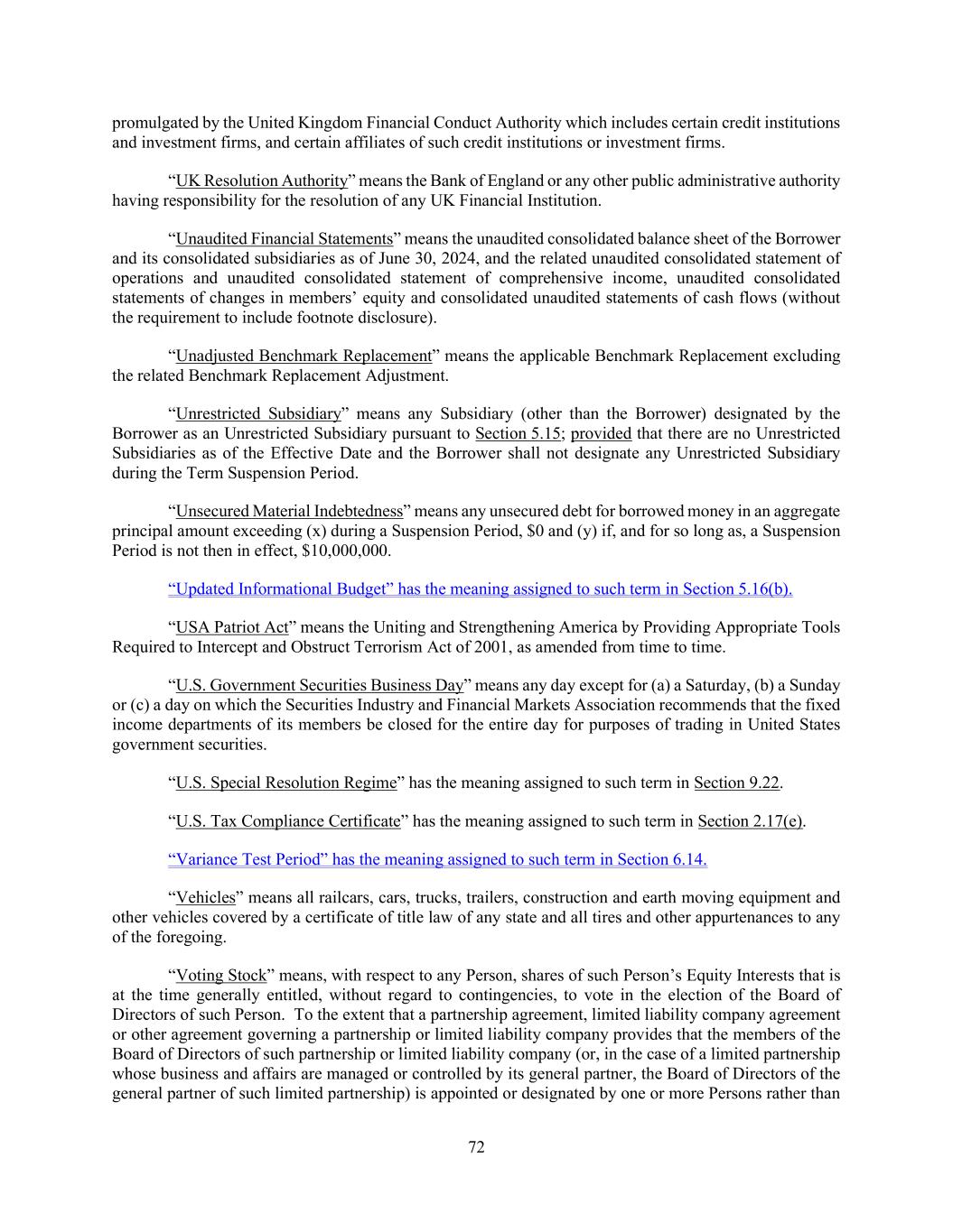 72 promulgated by the United Kingdom Financial Conduct Authority which includes certain credit institutions and investment firms, and certain affiliates of such credit institutions or investment firms. “UK Resolution Authority” means the Bank of England or any other public administrative authority having responsibility for the resolution of any UK Financial Institution. “Unaudited Financial Statements” means the unaudited consolidated balance sheet of the Borrower and its consolidated subsidiaries as of June 30, 2024, and the related unaudited consolidated statement of operations and unaudited consolidated statement of comprehensive income, unaudited consolidated statements of changes in members’ equity and consolidated unaudited statements of cash flows (without the requirement to include footnote disclosure). “Unadjusted Benchmark Replacement” means the applicable Benchmark Replacement excluding the related Benchmark Replacement Adjustment. “Unrestricted Subsidiary” means any Subsidiary (other than the Borrower) designated by the Borrower as an Unrestricted Subsidiary pursuant to Section 5.15; provided that there are no Unrestricted Subsidiaries as of the Effective Date and the Borrower shall not designate any Unrestricted Subsidiary during the Term Suspension Period. “Unsecured Material Indebtedness” means any unsecured debt for borrowed money in an aggregate principal amount exceeding (x) during a Suspension Period, $0 and (y) if, and for so long as, a Suspension Period is not then in effect, $10,000,000. “Updated Informational Budget” has the meaning assigned to such term in Section 5.16(b). “USA Patriot Act” means the Uniting and Strengthening America by Providing Appropriate Tools Required to Intercept and Obstruct Terrorism Act of 2001, as amended from time to time. “U.S. Government Securities Business Day” means any day except for (a) a Saturday, (b) a Sunday or (c) a day on which the Securities Industry and Financial Markets Association recommends that the fixed income departments of its members be closed for the entire day for purposes of trading in United States government securities. “U.S. Special Resolution Regime” has the meaning assigned to such term in Section 9.22. “U.S. Tax Compliance Certificate” has the meaning assigned to such term in Section 2.17(e). “Variance Test Period” has the meaning assigned to such term in Section 6.14. “Vehicles” means all railcars, cars, trucks, trailers, construction and earth moving equipment and other vehicles covered by a certificate of title law of any state and all tires and other appurtenances to any of the foregoing. “Voting Stock” means, with respect to any Person, shares of such Person’s Equity Interests that is at the time generally entitled, without regard to contingencies, to vote in the election of the Board of Directors of such Person. To the extent that a partnership agreement, limited liability company agreement or other agreement governing a partnership or limited liability company provides that the members of the Board of Directors of such partnership or limited liability company (or, in the case of a limited partnership whose business and affairs are managed or controlled by its general partner, the Board of Directors of the general partner of such limited partnership) is appointed or designated by one or more Persons rather than