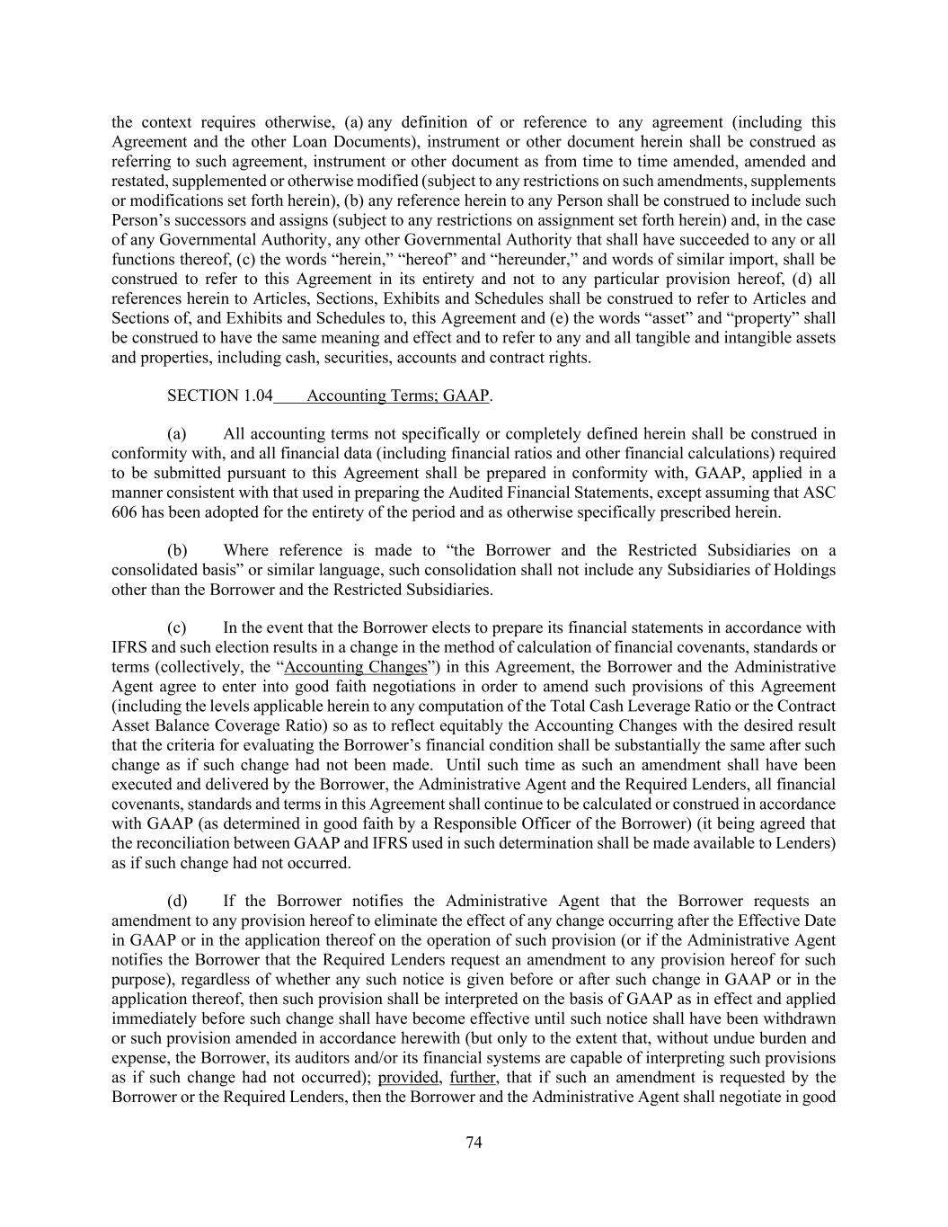 74 the context requires otherwise, (a) any definition of or reference to any agreement (including this Agreement and the other Loan Documents), instrument or other document herein shall be construed as referring to such agreement, instrument or other document as from time to time amended, amended and restated, supplemented or otherwise modified (subject to any restrictions on such amendments, supplements or modifications set forth herein), (b) any reference herein to any Person shall be construed to include such Person’s successors and assigns (subject to any restrictions on assignment set forth herein) and, in the case of any Governmental Authority, any other Governmental Authority that shall have succeeded to any or all functions thereof, (c) the words “herein,” “hereof” and “hereunder,” and words of similar import, shall be construed to refer to this Agreement in its entirety and not to any particular provision hereof, (d) all references herein to Articles, Sections, Exhibits and Schedules shall be construed to refer to Articles and Sections of, and Exhibits and Schedules to, this Agreement and (e) the words “asset” and “property” shall be construed to have the same meaning and effect and to refer to any and all tangible and intangible assets and properties, including cash, securities, accounts and contract rights. SECTION 1.04 Accounting Terms; GAAP. (a) All accounting terms not specifically or completely defined herein shall be construed in conformity with, and all financial data (including financial ratios and other financial calculations) required to be submitted pursuant to this Agreement shall be prepared in conformity with, GAAP, applied in a manner consistent with that used in preparing the Audited Financial Statements, except assuming that ASC 606 has been adopted for the entirety of the period and as otherwise specifically prescribed herein. (b) Where reference is made to “the Borrower and the Restricted Subsidiaries on a consolidated basis” or similar language, such consolidation shall not include any Subsidiaries of Holdings other than the Borrower and the Restricted Subsidiaries. (c) In the event that the Borrower elects to prepare its financial statements in accordance with IFRS and such election results in a change in the method of calculation of financial covenants, standards or terms (collectively, the “Accounting Changes”) in this Agreement, the Borrower and the Administrative Agent agree to enter into good faith negotiations in order to amend such provisions of this Agreement (including the levels applicable herein to any computation of the Total Cash Leverage Ratio or the Contract Asset Balance Coverage Ratio) so as to reflect equitably the Accounting Changes with the desired result that the criteria for evaluating the Borrower’s financial condition shall be substantially the same after such change as if such change had not been made. Until such time as such an amendment shall have been executed and delivered by the Borrower, the Administrative Agent and the Required Lenders, all financial covenants, standards and terms in this Agreement shall continue to be calculated or construed in accordance with GAAP (as determined in good faith by a Responsible Officer of the Borrower) (it being agreed that the reconciliation between GAAP and IFRS used in such determination shall be made available to Lenders) as if such change had not occurred. (d) If the Borrower notifies the Administrative Agent that the Borrower requests an amendment to any provision hereof to eliminate the effect of any change occurring after the Effective Date in GAAP or in the application thereof on the operation of such provision (or if the Administrative Agent notifies the Borrower that the Required Lenders request an amendment to any provision hereof for such purpose), regardless of whether any such notice is given before or after such change in GAAP or in the application thereof, then such provision shall be interpreted on the basis of GAAP as in effect and applied immediately before such change shall have become effective until such notice shall have been withdrawn or such provision amended in accordance herewith (but only to the extent that, without undue burden and expense, the Borrower, its auditors and/or its financial systems are capable of interpreting such provisions as if such change had not occurred); provided, further, that if such an amendment is requested by the Borrower or the Required Lenders, then the Borrower and the Administrative Agent shall negotiate in good