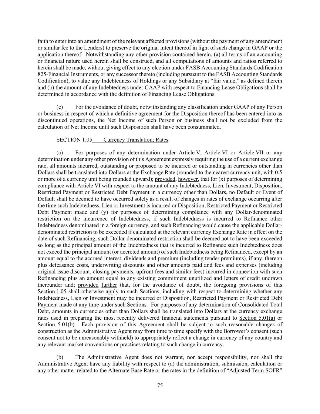 75 faith to enter into an amendment of the relevant affected provisions (without the payment of any amendment or similar fee to the Lenders) to preserve the original intent thereof in light of such change in GAAP or the application thereof. Notwithstanding any other provision contained herein, (a) all terms of an accounting or financial nature used herein shall be construed, and all computations of amounts and ratios referred to herein shall be made, without giving effect to any election under FASB Accounting Standards Codification 825-Financial Instruments, or any successor thereto (including pursuant to the FASB Accounting Standards Codification), to value any Indebtedness of Holdings or any Subsidiary at “fair value,” as defined therein and (b) the amount of any Indebtedness under GAAP with respect to Financing Lease Obligations shall be determined in accordance with the definition of Financing Lease Obligations. (e) For the avoidance of doubt, notwithstanding any classification under GAAP of any Person or business in respect of which a definitive agreement for the Disposition thereof has been entered into as discontinued operations, the Net Income of such Person or business shall not be excluded from the calculation of Net Income until such Disposition shall have been consummated. SECTION 1.05 Currency Translation; Rates. (a) For purposes of any determination under Article V, Article VI or Article VII or any determination under any other provision of this Agreement expressly requiring the use of a current exchange rate, all amounts incurred, outstanding or proposed to be incurred or outstanding in currencies other than Dollars shall be translated into Dollars at the Exchange Rate (rounded to the nearest currency unit, with 0.5 or more of a currency unit being rounded upward); provided, however, that for (x) purposes of determining compliance with Article VI with respect to the amount of any Indebtedness, Lien, Investment, Disposition, Restricted Payment or Restricted Debt Payment in a currency other than Dollars, no Default or Event of Default shall be deemed to have occurred solely as a result of changes in rates of exchange occurring after the time such Indebtedness, Lien or Investment is incurred or Disposition, Restricted Payment or Restricted Debt Payment made and (y) for purposes of determining compliance with any Dollar-denominated restriction on the incurrence of Indebtedness, if such Indebtedness is incurred to Refinance other Indebtedness denominated in a foreign currency, and such Refinancing would cause the applicable Dollar- denominated restriction to be exceeded if calculated at the relevant currency Exchange Rate in effect on the date of such Refinancing, such Dollar-denominated restriction shall be deemed not to have been exceeded so long as the principal amount of the Indebtedness that is incurred to Refinance such Indebtedness does not exceed the principal amount (or accreted amount) of such Indebtedness being Refinanced, except by an amount equal to the accrued interest, dividends and premium (including tender premiums), if any, thereon plus defeasance costs, underwriting discounts and other amounts paid and fees and expenses (including original issue discount, closing payments, upfront fees and similar fees) incurred in connection with such Refinancing plus an amount equal to any existing commitment unutilized and letters of credit undrawn thereunder and; provided further that, for the avoidance of doubt, the foregoing provisions of this Section 1.05 shall otherwise apply to such Sections, including with respect to determining whether any Indebtedness, Lien or Investment may be incurred or Disposition, Restricted Payment or Restricted Debt Payment made at any time under such Sections. For purposes of any determination of Consolidated Total Debt, amounts in currencies other than Dollars shall be translated into Dollars at the currency exchange rates used in preparing the most recently delivered financial statements pursuant to Section 5.01(a) or Section 5.01(b). Each provision of this Agreement shall be subject to such reasonable changes of construction as the Administrative Agent may from time to time specify with the Borrower’s consent (such consent not to be unreasonably withheld) to appropriately reflect a change in currency of any country and any relevant market conventions or practices relating to such change in currency. (b) The Administrative Agent does not warrant, nor accept responsibility, nor shall the Administrative Agent have any liability with respect to (a) the administration, submission, calculation or any other matter related to the Alternate Base Rate or the rates in the definition of “Adjusted Term SOFR”