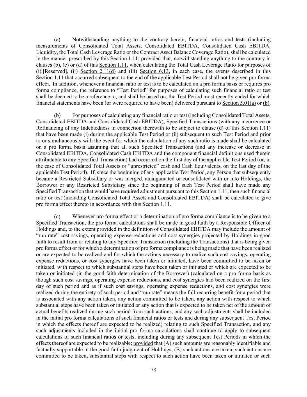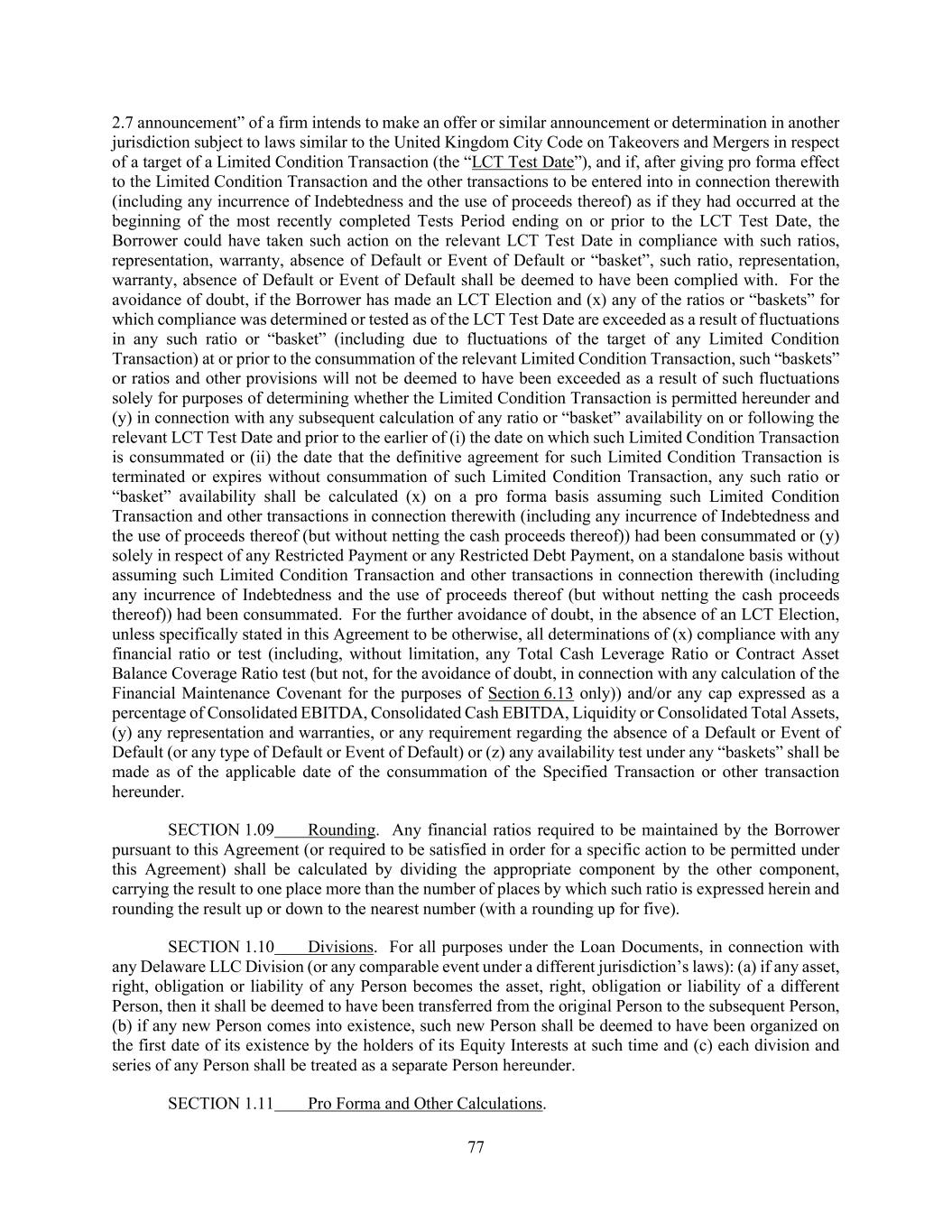 76 or any component definition thereof, or with respect to any alternative, replacement or successor rate thereto, or (b) the effect, implementation or composition of any Conforming Changes, in each case, except as expressly provided herein. The Administrative Agent and its Affiliates or other related entities may engage in transactions that affect the calculation of the Alternate Base Rate, the Term SOFR Reference Rate, Adjusted Term SOFR (or any component definition thereof), any alternative, successor or replacement rate (including any Benchmark Replacement) or any relevant adjustments thereto, in each case, in a manner adverse to the Borrower. The Administrative Agent may select information sources or services in its sole discretion to ascertain the Alternate Base Rate, the Term SOFR Reference Rate, Adjusted Term SOFR (or any component definition thereof), or any other Benchmark, in each case pursuant to the terms of this Agreement, and shall have no liability to the Borrower, any Lender or any other person or entity for damages of any kind, including direct or indirect, special, punitive, incidental or consequential damages, costs, losses or expenses (whether in tort, contract or otherwise and whether at law or in equity), for any error or calculation of any such rate (or component thereof) provided by any such information source or service. SECTION 1.06 Timing of Payment of Performance. When payment of any obligation or the performance of any covenant, duty or obligation is stated to be due or required on a day which is not a Business Day, the date of such payment (other than as described in the definition of “Interest Period”) or performance shall extend to the immediately succeeding Business Day, and, in the case of any payment accruing interest, interest thereon shall be payable for the period of such extension. SECTION 1.07 Cashless Rollovers. Notwithstanding anything to the contrary contained in this Agreement or in any other Loan Document, to the extent that any Lender extends the maturity date of, or replaces, renews or refinances, any of its then-existing Loans with Incremental Term Loans, Loans in connection with any Replacement Revolving Commitments, Extended Revolving Commitments, Extended Revolving Loans, or loans incurred under a new credit facility, in each case, to the extent such extension, replacement, renewal or refinancing is effected by means of a “cashless roll” by such Lender, such extension, replacement, renewal or refinancing shall be deemed to comply with any requirement hereunder or any other Loan Document that such payment be made “in Dollars”, “in immediately available funds”, “in Cash” or any other similar requirement. SECTION 1.08 Certain Calculations and Tests. Notwithstanding anything in this Agreement or any Loan Document to the contrary, for purposes of (i) determining compliance with any provision in this Agreement or any Loan Document that requires the calculation of any financial ratio or test (including, without limitation, any Total Cash Leverage Ratio or any Contract Asset Balance Coverage Ratio test (including as required in the definition of “Permitted Acquisition”)), (ii) determining compliance with representations and warranties or the requirement regarding the absence of a Default or Event of Default (or any type of Default or Event of Default) (other than in connection with any borrowing of Revolving Loans or issuance of any Letter of Credit under the Revolving Credit Facility (or Other Revolving Commitments)) or (iii) testing any cap expressed as a percentage of Consolidated EBITDA, Consolidated Cash EBITDA, Liquidity or Consolidated Total Assets and any other availability of a “basket” or exception set forth in Article VI, in each case in connection with a Specified Transaction or other transaction permitted hereunder, undertaken in connection with the consummation of a Limited Condition Transaction, the date of determination of whether any such action is permitted hereunder (but not, for the avoidance of doubt, in connection with any calculation of the Financial Maintenance Covenant for the purposes of Section 6.13 only), at the election of the Borrower (such election to exercise such option in connection with any Limited Condition Transaction, an “LCT Election”), will be deemed to be (x) the date the definitive agreements for such Limited Condition Transaction are entered into or (y) in respect of sales in connection with an acquisition to which the United Kingdom City Code on Takeovers and Mergers applies (or similar law or practice in other jurisdictions), the date on which a “Rule