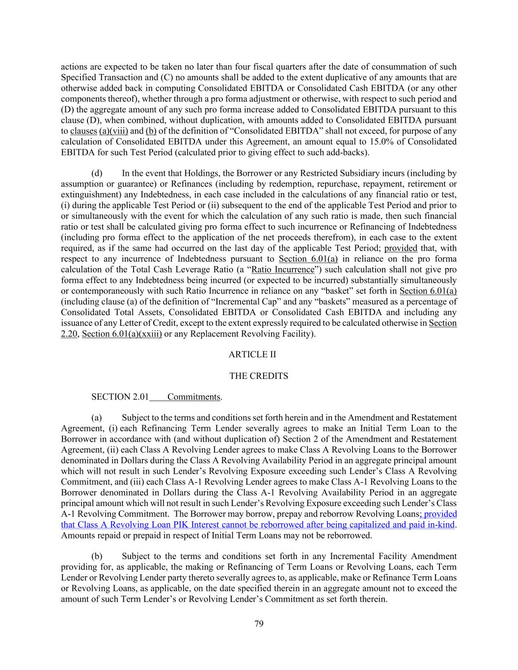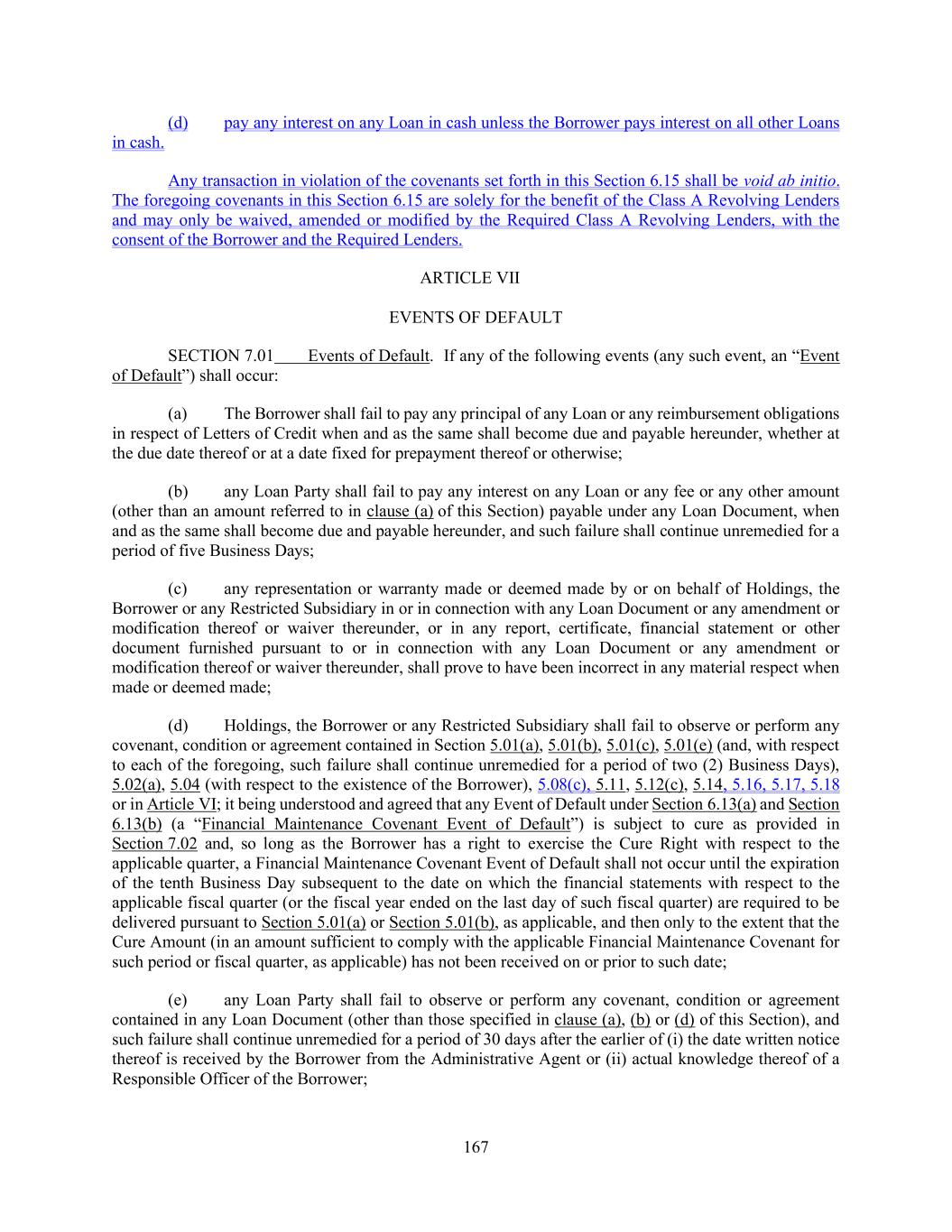 167 (d) pay any interest on any Loan in cash unless the Borrower pays interest on all other Loans in cash. Any transaction in violation of the covenants set forth in this Section 6.15 shall be void ab initio. The foregoing covenants in this Section 6.15 are solely for the benefit of the Class A Revolving Lenders and may only be waived, amended or modified by the Required Class A Revolving Lenders, with the consent of the Borrower and the Required Lenders. ARTICLE VII EVENTS OF DEFAULT SECTION 7.01 Events of Default. If any of the following events (any such event, an “Event of Default”) shall occur: (a) The Borrower shall fail to pay any principal of any Loan or any reimbursement obligations in respect of Letters of Credit when and as the same shall become due and payable hereunder, whether at the due date thereof or at a date fixed for prepayment thereof or otherwise; (b) any Loan Party shall fail to pay any interest on any Loan or any fee or any other amount (other than an amount referred to in clause (a) of this Section) payable under any Loan Document, when and as the same shall become due and payable hereunder, and such failure shall continue unremedied for a period of five Business Days; (c) any representation or warranty made or deemed made by or on behalf of Holdings, the Borrower or any Restricted Subsidiary in or in connection with any Loan Document or any amendment or modification thereof or waiver thereunder, or in any report, certificate, financial statement or other document furnished pursuant to or in connection with any Loan Document or any amendment or modification thereof or waiver thereunder, shall prove to have been incorrect in any material respect when made or deemed made; (d) Holdings, the Borrower or any Restricted Subsidiary shall fail to observe or perform any covenant, condition or agreement contained in Section 5.01(a), 5.01(b), 5.01(c), 5.01(e) (and, with respect to each of the foregoing, such failure shall continue unremedied for a period of two (2) Business Days), 5.02(a), 5.04 (with respect to the existence of the Borrower), 5.08(c), 5.11, 5.12(c), 5.14, 5.16, 5.17, 5.18 or in Article VI; it being understood and agreed that any Event of Default under Section 6.13(a) and Section 6.13(b) (a “Financial Maintenance Covenant Event of Default”) is subject to cure as provided in Section 7.02 and, so long as the Borrower has a right to exercise the Cure Right with respect to the applicable quarter, a Financial Maintenance Covenant Event of Default shall not occur until the expiration of the tenth Business Day subsequent to the date on which the financial statements with respect to the applicable fiscal quarter (or the fiscal year ended on the last day of such fiscal quarter) are required to be delivered pursuant to Section 5.01(a) or Section 5.01(b), as applicable, and then only to the extent that the Cure Amount (in an amount sufficient to comply with the applicable Financial Maintenance Covenant for such period or fiscal quarter, as applicable) has not been received on or prior to such date; (e) any Loan Party shall fail to observe or perform any covenant, condition or agreement contained in any Loan Document (other than those specified in clause (a), (b) or (d) of this Section), and such failure shall continue unremedied for a period of 30 days after the earlier of (i) the date written notice thereof is received by the Borrower from the Administrative Agent or (ii) actual knowledge thereof of a Responsible Officer of the Borrower;