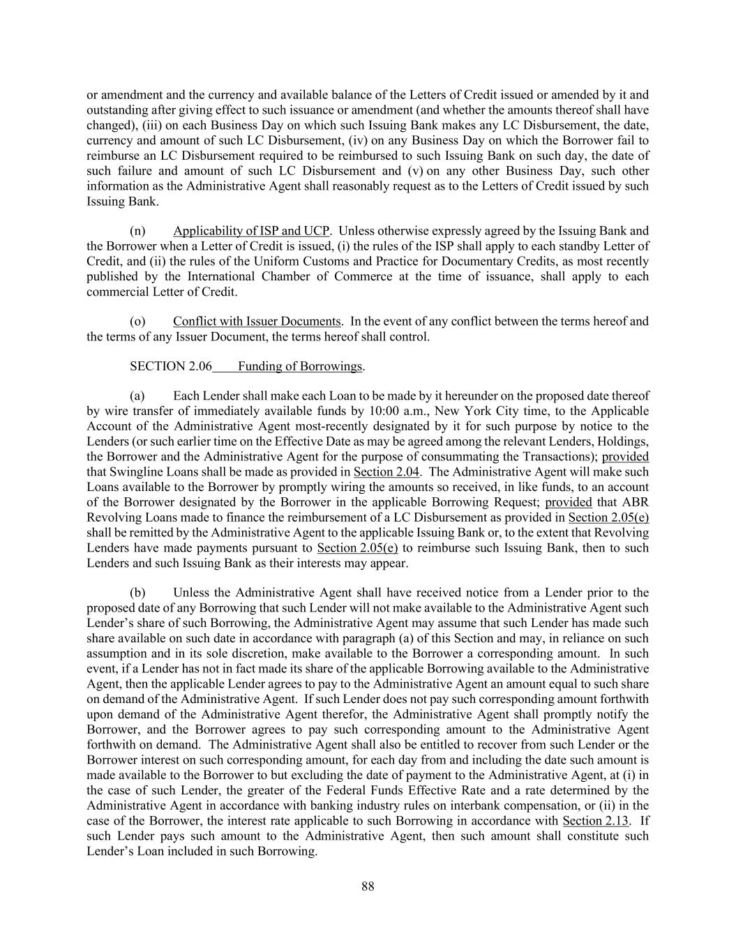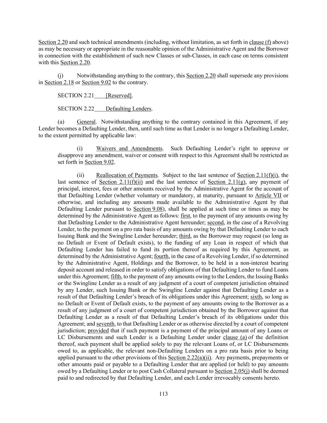 113 Section 2.20 and such technical amendments (including, without limitation, as set forth in clause (f) above) as may be necessary or appropriate in the reasonable opinion of the Administrative Agent and the Borrower in connection with the establishment of such new Classes or sub-Classes, in each case on terms consistent with this Section 2.20. (j) Notwithstanding anything to the contrary, this Section 2.20 shall supersede any provisions in Section 2.18 or Section 9.02 to the contrary. SECTION 2.21 [Reserved]. SECTION 2.22 Defaulting Lenders. (a) General. Notwithstanding anything to the contrary contained in this Agreement, if any Lender becomes a Defaulting Lender, then, until such time as that Lender is no longer a Defaulting Lender, to the extent permitted by applicable law: (i) Waivers and Amendments. Such Defaulting Lender’s right to approve or disapprove any amendment, waiver or consent with respect to this Agreement shall be restricted as set forth in Section 9.02. (ii) Reallocation of Payments. Subject to the last sentence of Section 2.11(f)(i), the last sentence of Section 2.11(f)(ii) and the last sentence of Section 2.11(g), any payment of principal, interest, fees or other amounts received by the Administrative Agent for the account of that Defaulting Lender (whether voluntary or mandatory, at maturity, pursuant to Article VII or otherwise, and including any amounts made available to the Administrative Agent by that Defaulting Lender pursuant to Section 9.08), shall be applied at such time or times as may be determined by the Administrative Agent as follows: first, to the payment of any amounts owing by that Defaulting Lender to the Administrative Agent hereunder; second, in the case of a Revolving Lender, to the payment on a pro rata basis of any amounts owing by that Defaulting Lender to each Issuing Bank and the Swingline Lender hereunder; third, as the Borrower may request (so long as no Default or Event of Default exists), to the funding of any Loan in respect of which that Defaulting Lender has failed to fund its portion thereof as required by this Agreement, as determined by the Administrative Agent; fourth, in the case of a Revolving Lender, if so determined by the Administrative Agent, Holdings and the Borrower, to be held in a non-interest bearing deposit account and released in order to satisfy obligations of that Defaulting Lender to fund Loans under this Agreement; fifth, to the payment of any amounts owing to the Lenders, the Issuing Banks or the Swingline Lender as a result of any judgment of a court of competent jurisdiction obtained by any Lender, such Issuing Bank or the Swingline Lender against that Defaulting Lender as a result of that Defaulting Lender’s breach of its obligations under this Agreement; sixth, so long as no Default or Event of Default exists, to the payment of any amounts owing to the Borrower as a result of any judgment of a court of competent jurisdiction obtained by the Borrower against that Defaulting Lender as a result of that Defaulting Lender’s breach of its obligations under this Agreement; and seventh, to that Defaulting Lender or as otherwise directed by a court of competent jurisdiction; provided that if such payment is a payment of the principal amount of any Loans or LC Disbursements and such Lender is a Defaulting Lender under clause (a) of the definition thereof, such payment shall be applied solely to pay the relevant Loans of, or LC Disbursements owed to, as applicable, the relevant non-Defaulting Lenders on a pro rata basis prior to being applied pursuant to the other provisions of this Section 2.22(a)(ii). Any payments, prepayments or other amounts paid or payable to a Defaulting Lender that are applied (or held) to pay amounts owed by a Defaulting Lender or to post Cash Collateral pursuant to Section 2.05(j) shall be deemed paid to and redirected by that Defaulting Lender, and each Lender irrevocably consents hereto.
