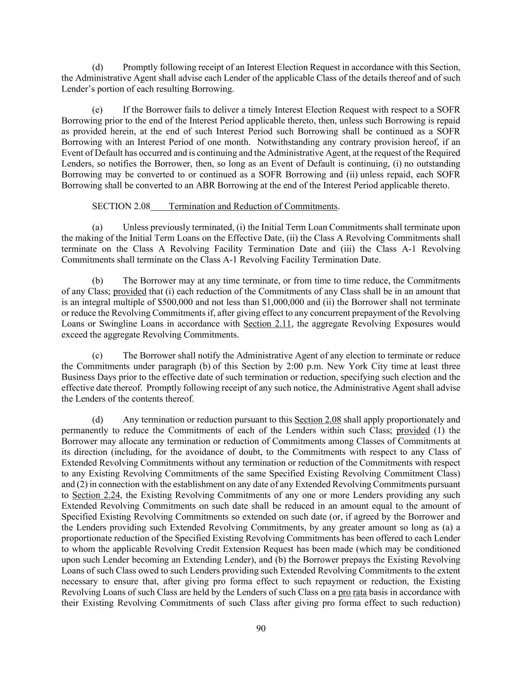 117 Replacement Revolving Commitments (or any earlier Extended Revolving Commitments) of an Existing Class subject to such Loan Modification Offer converted or exchanged into Extended Loans/Commitments shall notify the Administrative Agent (an “Extension Election”) on or prior to the date specified in such Loan Modification Offer of the amount of its Term Loans, Revolving Commitments and/or Replacement Revolving Commitments (and/or any earlier Extended Revolving Commitments) which it has elected to convert or exchange into Extended Loans/Commitments (subject to any minimum denomination requirements imposed by the Administrative Agent). In the event that the aggregate amount of Term Loans, Revolving Commitments and Replacement Revolving Commitments (and any earlier-extended Extended Revolving Commitments) subject to Extension Elections exceeds the amount of Extended Loans/Commitments requested pursuant to the Loan Modification Offer, Term Loans, Revolving Commitments, Replacement Revolving Commitments or earlier-extended Extended Revolving Commitments, as applicable, subject to Extension Elections shall be converted to or exchanged to Extended Loans/Commitments on a pro rata basis (subject to such rounding requirements as may be established by the Administrative Agent) based on the amount of Term Loans, Revolving Commitments, Replacement Revolving Commitments and earlier-extended Extended Revolving Commitments included in each such Extension Election or as may be otherwise agreed to in the applicable Loan Modification Agreement. Notwithstanding the conversion of any Existing Revolving Commitment into an Extended Revolving Commitment, unless expressly agreed by the holders of each affected Existing Revolving Commitment of the Specified Existing Revolving Commitment Class, such Extended Revolving Commitment shall not be treated more favorably than all Existing Revolving Commitments of the Specified Existing Revolving Commitment Class for purposes of the obligations of a Revolving Lender in respect of Swingline Loans under Section 2.04 and Letters of Credit under Section 2.05, except that the applicable Loan Modification Agreement may provide that the last day for issuing Letters of Credit may be extended and the related obligations to issue Letters of Credit may be continued (pursuant to mechanics to be specified in the applicable Loan Modification Agreement) so long as the applicable Issuing Bank has consented to such extensions (it being understood that no consent of any other Lender shall be required in connection with any such extension). (d) Extended Loans/Commitments shall be established pursuant to Loan Modification Agreement (which, except to the extent expressly contemplated by the penultimate sentence of this Section 2.24(d) and notwithstanding anything to the contrary set forth in Section 9.02, shall not require the consent of any Lender other than the Extending Lenders with respect to the Extended Loans/Commitments established thereby) executed by the Loan Parties, the Administrative Agent and the Extending Lenders. In addition to any terms and changes required or permitted by Section 2.24(a), each Loan Modification Agreement in respect of Extended Term Loans shall amend the scheduled amortization payments pursuant to Section 2.10 or the applicable Incremental Facility Amendment or Loan Modification Agreement with respect to the Existing Class of Term Loans from which the Extended Term Loans were exchanged to reduce each scheduled installment scheduled to be repaid on any date for the Existing Class in the same proportion as the amount of Term Loans of the Existing Class is to be reduced pursuant to such Loan Modification Agreement (it being understood that the amount of any installment payable with respect to any individual Term Loan of such Existing Class that is not an Extended Term Loan shall not be reduced as a result thereof). In connection with any Loan Modification Agreement, the Borrower shall deliver an opinion of counsel reasonably acceptable to the Administrative Agent and addressed to the Administrative Agent and the applicable Extending Lenders (i) as to the enforceability of such Loan Modification Agreement, this Agreement as amended thereby, and such of the other Loan Documents (if any) as may be amended thereby (in the case of such other Loan Documents as contemplated by the immediately preceding sentence) and covering customary matters and (ii) to the effect that such Loan Modification Agreement, including the Extended Loans/Commitments provided for therein, does not breach or result in a default under the provisions of Section 9.02 of this Agreement.