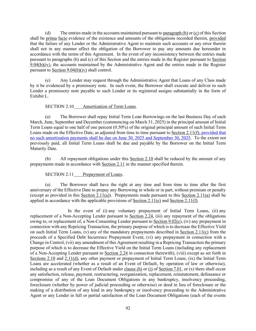 182 provided that (i) in the case of clause (y) above, the Borrower shall have received the prior written consent of the Administrative Agent to the extent such consent would be required under Section 9.04(b) for an assignment of Loans or Commitments, as applicable (and, if a Revolving Commitment is being assigned, each Issuing Bank and the Swingline Lender), which consent shall not unreasonably be withheld, (ii) such Non-Consenting Lender shall have received payment of an amount equal to the outstanding principal of its Loans and participations in LC Disbursements and Swingline Loans, accrued interest thereon, accrued fees and all other amounts (including any amounts under Section 2.11(a)), payable to it hereunder from the Borrower or Eligible Assignee (to the extent of such outstanding principal and accrued interest and fees) or the Borrower (in the case of all other amounts) and (iii) in the case of clause (y) above, unless waived, the Borrower or such Eligible Assignee shall have paid to the Administrative Agent the processing and recordation fee specified in Section 9.04(b)(ii). Notwithstanding anything herein to the contrary, each party hereto agrees that any assignment pursuant to the terms of this Section 9.02(c) may be effected pursuant to an Assignment and Assumption executed by Holdings, the Borrower, the Administrative Agent and the assignee and that the Non-Consenting Lender making such assignment need not be a party thereto. (d) Notwithstanding anything in this Agreement or the other Loan Documents to the contrary, the Revolving Commitments, Term Loans and Revolving Exposure of any Lender that is at the time a Defaulting Lender shall not have any voting or approval rights under the Loan Documents and shall be excluded in determining whether all Lenders (or all Lenders of a Class), all affected Lenders (or all affected Lenders of a Class) or the Required Lenders have taken or may take any action hereunder (including any consent to any amendment or waiver pursuant to this Section 9.02); provided that any waiver, amendment or modification requiring the consent of all Lenders (or all Lenders of a Class) or all affected Lenders (or all affected Lenders of a Class) that affects any Defaulting Lender more adversely than other affected Lenders shall require the consent of such Defaulting Lender. (e) [reserved]. (f) Notwithstanding anything in this Section 9.02 to the contrary, (i) technical and conforming modifications to the Loan Documents may be made with the consent of the Borrower and the Administrative Agent (and no other Person) to the extent necessary (A) to integrate any Incremental Facilities, Other Revolving Loans or Other Term Loans, (B) to integrate or make administrative modifications with respect to borrowing and issuances of Letters of Credit, (C) to integrate any terms or conditions from any Incremental Facility Amendment that are more restrictive than this Agreement in accordance with Section 2.20(f) and (D) to make any amendments permitted by Section 2.14(b)(ii) without the consent of any Lender or Issuing Bank, the Loan Parties and the Administrative Agent, the Collateral Agent or any collateral agent may (in their respective sole discretion, or shall, to the extent required by any Loan Document) enter into (x) any amendment, modification or waiver of any Loan Document, or enter into any new agreement or instrument, to effect the granting, perfection, protection, expansion or enhancement of any security interest in any Collateral or additional property to become Collateral for the benefit of the Secured Parties or as required by local law to give effect to, or protect any security interest for benefit of the Secured Parties, in any property or so that the security interests therein comply with applicable law or this Agreement or in each case to otherwise enhance the rights or benefits of any Lender under any Loan Document or (y) any applicable Intercreditor Agreement, in each case with the holders of Indebtedness permitted by this Agreement to be secured by Liens on the Collateral. Without limitation of the foregoing, the Administrative Agent and the Borrower may, without the consent of any Lenders, (I) increase the interest rates (including any interest rate margins or interest rate floors), fees and other amounts payable to any Class or Classes of Lenders hereunder, (II) increase, expand and/or extend the call protection provisions and any “most favored nation” provisions benefiting any Class or Classes of Lenders hereunder (including, for the avoidance of doubt, the provisions of Sections 2.11(a) and 2.20(b)(iv) hereof) and/or (III) modify any other provision hereunder or under any other Loan Document in a manner more favorable to the then- existing Lenders or Class or Classes of Lenders, in each case in connection with the incurrence of any