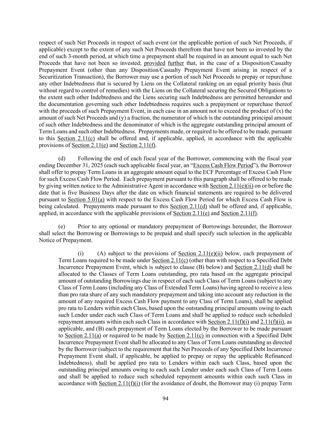 61 giving effect to control of remedies) with the liens on the Collateral securing the Initial Term Loans (i) having an Effective Yield for the respective Type of such Indebtedness that is less than (and not by virtue of any fluctuation in any “base” rate) the Effective Yield for the Initial Term Loans, and (ii) the proceeds of which are used to prepay (or, in the case of a conversion, deemed to prepay or replace), in whole or in part, outstanding principal of Initial Term Loans or (b) any amendment (or any mandatory assignment in connection with any such amendment) resulting in the effective reduction in the Effective Yield for the Initial Term Loans. Any determination by the Administrative Agent with respect to whether a Repricing Transaction shall have occurred shall be conclusive and binding on all Lenders holding the Initial Term Loans. “Required Additional Debt Terms” means, with respect to any Incremental Equivalent Debt and Acquisition Debt, (a) such Indebtedness does not mature earlier than the date that is 91 days after the Latest Maturity Date or have a Weighted Average Life to Maturity less than the greatest Weighted Average Life to Maturity of the then-existing Term Loans outstanding at the time of incurrence of such Indebtedness, (b) the terms of such Indebtedness in respect thereof do not provide for any mandatory prepayments, mandatory redemptions, mandatory commitment reductions, mandatory offers to purchase or mandatory sinking fund obligations prior to the Latest Maturity Date, other than customary prepayments, commitment reductions, repurchases, redemptions, defeasances, acquisitions or satisfactions and discharges, or offers to prepay, reduce, redeem, repurchase, defease, acquire or satisfy and discharge, in each case upon, a change of control, asset sale event or casualty, eminent domain or condemnation event, or on account of the accumulation of excess cash flow (in the case of loans or commitments), AHYDO Catch-Up Payments and customary acceleration rights upon an event of default, (c) except for any of the following that are applicable only to periods following the Latest Maturity Date, the covenants, events of default and other terms for such Indebtedness or commitments (excluding, for the avoidance of doubt, interest rates (including through fixed interest rates), interest rate margins, rate floors, fees, maturity, funding discounts, original issue discounts, currency type and denomination, and redemption or prepayment terms and premiums), when taken as a whole, are not materially more restrictive on Holdings, the Borrower and the Restricted Subsidiaries than the terms of this Agreement, when taken as a whole (provided that, if the documentation governing such Indebtedness or commitments contains any covenant or provision that is not included in this Agreement at such time, the Administrative Agent shall have been given prompt written notice thereof and this Agreement shall have been amended to include such covenant or provision for the benefit of each Credit Facility), (d) in the event that the Effective Yield for any Incremental Equivalent Debt is greater than the Effective Yield for the Initial Term Loans by more than 0.50% per annum, then the Applicable Rate for such Initial Term Loans shall be increased to the extent necessary so that the Effective Yield for such Initial Term Loans shall be equal to the Effective Yield with respect to such Incremental Equivalent Debt minus 0.50% per annum, (e) to the extent such Indebtedness is secured by any assets, such Indebtedness shall not be secured by any assets of a Loan Party other than the Collateral securing the Secured Obligations and shall be subject to the relevant Intercreditor Agreements and (f) to the extent such Indebtedness is incurred or guaranteed by any Loan Party, such Indebtedness shall not be guaranteed by any Person that is not a Loan Party (except to the extent such Indebtedness that is subject to the Required Additional Debt Terms is expressly permitted to be incurred by any Restricted Subsidiary that is not a Loan Party under Section 6.01(a)(xix)). “Required Class A Revolving Lenders” means, at any time after the Amendment No. 11 Effective Date, Class A Revolving Lenders having Class A Revolving Exposures and unused Class A Revolving Commitments representing more than 50.0% of the aggregate Class A Revolving Exposures and unused Class A Revolving Commitments at such time; provided that whenever there are one or more Defaulting Lenders, the total outstanding Class A Revolving Exposures and unused Class A Revolving Commitments of each Defaulting Lender shall be excluded for purposes of making a determination of Required Class A Revolving Lenders.