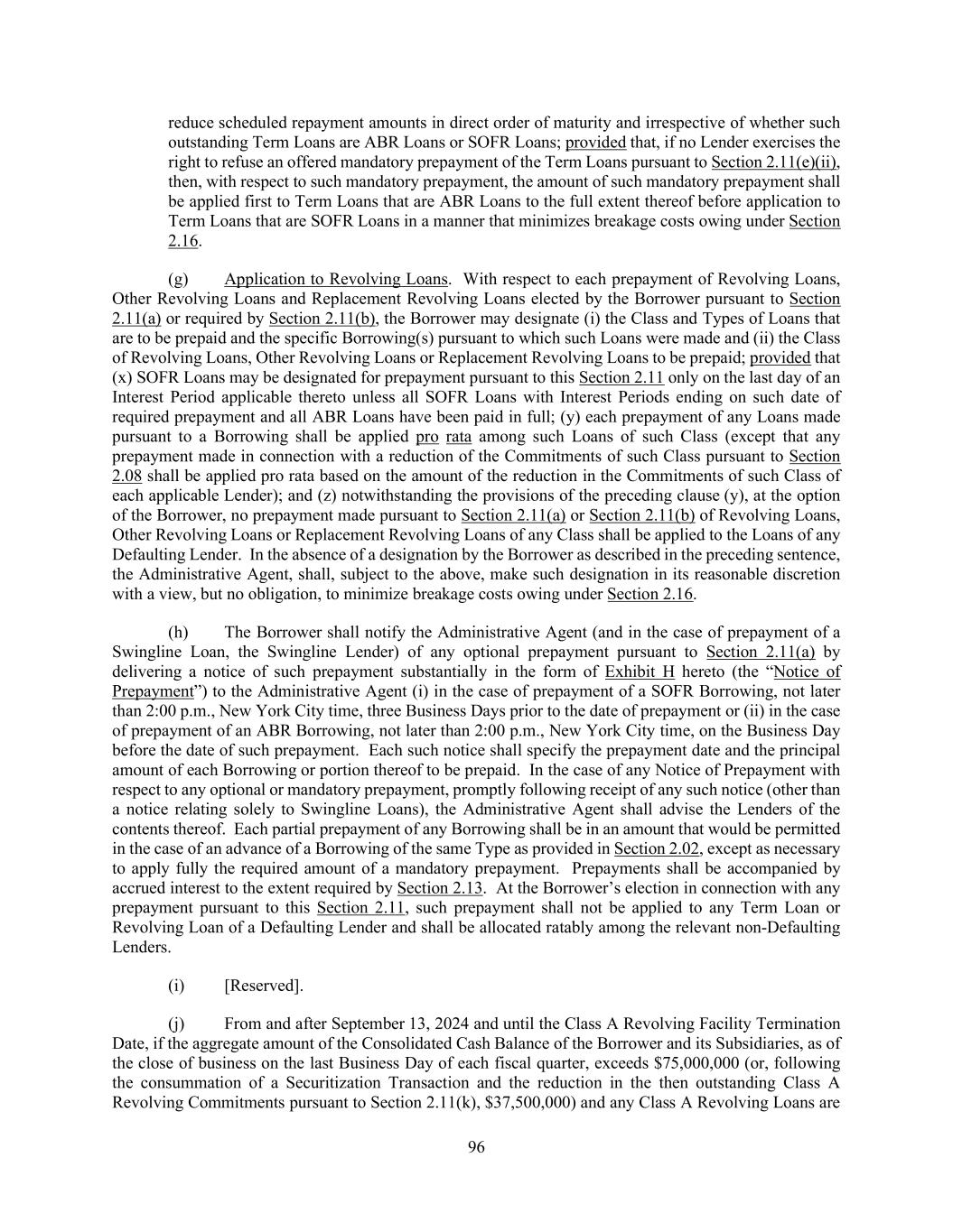 114 (iii) Certain Fees. That Defaulting Lender (x) shall not be entitled to receive or accrue any commitment fee pursuant to Section 2.12(a) for any period during which that Lender is a Defaulting Lender (and the Borrower shall not be required to pay any such fee that otherwise would have been required to have been paid to that Defaulting Lender) and (y) shall be limited in its right to receive Letter of Credit fees as provided in Section 2.12(f). (iv) Reallocation of Applicable Percentages to Reduce Fronting Exposure. During any period in which there is a Defaulting Lender, for purposes of computing the amount of the obligation of each non-Defaulting Lender to acquire, refinance or fund participations in Swingline Loans and Letters of Credit pursuant to Section 2.04 and Section 2.05, the “Applicable Percentage” of each non-Defaulting Lender shall be computed without giving effect to the Revolving Commitment of that Defaulting Lender; provided that the aggregate obligation of each non- Defaulting Lender to acquire, refinance or fund participations in Letters of Credit and Swingline Loans shall not at any time exceed the positive difference, if any, of (1) the Revolving Commitment of that non-Defaulting Lender minus (2) the aggregate Revolving Exposure of that Lender. If the reallocation provided for in the preceding sentence cannot, or can only partially, be effected, the Borrower shall (A) first, prepay the portion of such Defaulting Lender’s Swingline Exposure that has not been reallocated and (B) second, cash collateralize for the benefit of the Issuing Banks the portion of such Defaulting Lender’s LC Exposure that has not been reallocated in accordance with the procedures set forth in Section 2.05(j) for so long as such unreallocated LC Exposure is outstanding. (b) Defaulting Lender Cure. If the Borrower, the Administrative Agent, the Swingline Lender and each Issuing Bank agree in writing in their sole discretion that a Defaulting Lender should no longer be deemed to be a Defaulting Lender, the Administrative Agent will so notify the parties hereto, whereupon as of the effective date specified in such notice and subject to any conditions set forth therein (which may include arrangements with respect to any Cash Collateral), such Lender will, to the extent applicable, purchase that portion of outstanding Loans of the other Lenders or take such other actions as the Administrative Agent may determine to be necessary to cause the Loans and funded and unfunded participations in Letters of Credit and Swingline Loans to be held on a pro rata basis by the Lenders in accordance with their Applicable Percentages (without giving effect to Section 2.22(a)(iv)), whereupon that Lender will cease to be a Defaulting Lender; provided that no adjustments will be made retroactively with respect to fees accrued or payments made by or on behalf of the Borrower while that Lender was a Defaulting Lender; and provided further that except to the extent otherwise expressly agreed by the affected parties, no change hereunder from Defaulting Lender to Lender will constitute a waiver or release of any claim of any party hereunder arising from that Lender’s having been a Defaulting Lender. SECTION 2.23 Illegality. If any Lender determines that any law has made it unlawful, or that any Governmental Authority has asserted that it is unlawful, for any Lender to make, maintain or fund Loans whose interest is determined by reference to Adjusted Term SOFR, or to determine or charge interest rates based upon Adjusted Term SOFR, then, on notice thereof by such Lender to the Borrower through the Administrative Agent, any obligation of such Lender to make or continue SOFR Loans or to convert ABR Loans to SOFR Loans shall be suspended until such Lender notifies the Administrative Agent and the Borrower that the circumstances giving rise to such determination no longer exist. Upon receipt of such notice, (x) the Borrower shall, upon three (3) Business Days’ notice from such Lender (with a copy to the Administrative Agent), prepay or, if applicable, convert all SOFR Loans of such Lender to ABR Loans, either on the last day of the Interest Period therefor, if such Lender may lawfully continue to maintain such SOFR Loans to such day, or immediately, if such Lender may not lawfully continue to maintain such SOFR Loans, and (y) if such notice asserts the illegality of such Lender determining or charging interest rates based upon Adjusted Term SOFR, the Administrative Agent shall, during the period of such suspension, compute the Alternate Base Rate applicable to such Lender without reference to the Adjusted Term SOFR