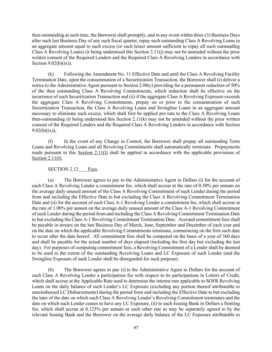180 (iv) release all or substantially all the value of the Guarantees under the Guarantee Agreement (except as expressly provided in the Loan Documents), without the written consent of each Lender, (v) release all or substantially all the Collateral securing the Secured Obligations pursuant to the Security Documents, (except as expressly provided in the Loan Documents) without the written consent of each Lender, (vi) amend, waive or otherwise modify this Section 9.02, without the written consent of each Lender, (vii) amend, waive or otherwise modify any term or provision to subordinate (x) the Lien securing the Secured Obligations to any other Lien securing any other Indebtedness or (y) any of the Secured Obligations in right of payment (including pursuant to any “waterfall” provision) to any other Indebtedness (including, for the avoidance of doubt, any debtor in possession or similar financing), in each case, without the written consent of each Lender directly and adversely affected thereby; provided that only those Lenders that have not been provided a reasonable opportunity to receive the most favorable treatment under or in connection with an amendment, waiver, supplement or other agreement described in this clause (vii) (other than the right to receive customary administrative agency and other similar fees) that is provided to any other Person, including the opportunity to participate on a pro rata basis on the same terms in any new loans or other Indebtedness (including any debtor in possession financing) permitted to be issued as a result of such amendment, waiver, modification or other agreement, shall be deemed to be directly and adversely affected by such amendment, waiver or modification, (viii) amend, modify or otherwise affect the rights or duties of the Administrative Agent or any Issuing Bank or the Swingline Lender without the prior written consent of the Administrative Agent or such Issuing Bank or the Swingline Lender, as the case may be, (ix) amend, waive or otherwise modify (A) Sections 2.11(j), 2.11(k), 4.02(d), the second sentence of Section 5.15, the proviso to the first sentence of Section 9.15, the definition of “Consolidated Cash Balance” or the definition of “Securitization Transaction” or (B) the provisions of Section 2.11 and Sections 6.01 and 6.05, in each case, related to any Securitization Transaction, in each case of this clause (ix), without the written consent of the Required Lenders and the Required Class A Revolving Lenders;, and (x) amend, waive or otherwise modify Section 6.15, Section 7.01(t), the definition of “Liability Management Transaction”, the definition of “Extended Class A Revolving Loan Maturity Date Relief Period”, clause (a) of the definition of “Revolving Maturity Date,” or any of the component definitions contained therein or effect any transaction that violates Section 6.15, in each case, without the written consent of the Required Lenders and the Required Class A Revolving Lenders, provided, further, that (A) any waiver, amendment or modification of this Agreement that by its terms affects the rights or duties under this Agreement of Lenders holding Loans or Commitments of a particular Class (but not the Lenders holding Loans or Commitments of any other Class) may be effected by an agreement or agreements in writing entered into by Holdings, the Borrower and the requisite percentage in interest of the affected Class of Lenders that would be required to consent thereto under this Section if such Class of Lenders were the only Class of Lenders hereunder at the time, (B) this Agreement may be amended (or amended and restated) with the written consent of the Required Lenders, the Administrative Agent and the Borrower (1) to add one or more additional credit facilities