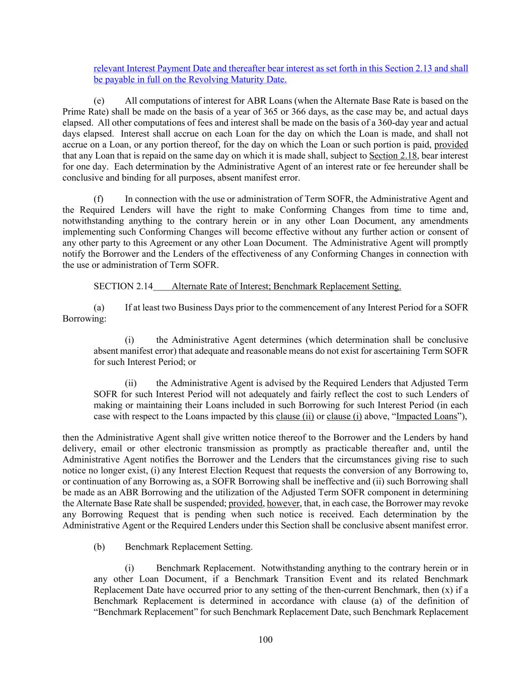 100 relevant Interest Payment Date and thereafter bear interest as set forth in this Section 2.13 and shall be payable in full on the Revolving Maturity Date. (e) All computations of interest for ABR Loans (when the Alternate Base Rate is based on the Prime Rate) shall be made on the basis of a year of 365 or 366 days, as the case may be, and actual days elapsed. All other computations of fees and interest shall be made on the basis of a 360-day year and actual days elapsed. Interest shall accrue on each Loan for the day on which the Loan is made, and shall not accrue on a Loan, or any portion thereof, for the day on which the Loan or such portion is paid, provided that any Loan that is repaid on the same day on which it is made shall, subject to Section 2.18, bear interest for one day. Each determination by the Administrative Agent of an interest rate or fee hereunder shall be conclusive and binding for all purposes, absent manifest error. (f) In connection with the use or administration of Term SOFR, the Administrative Agent and the Required Lenders will have the right to make Conforming Changes from time to time and, notwithstanding anything to the contrary herein or in any other Loan Document, any amendments implementing such Conforming Changes will become effective without any further action or consent of any other party to this Agreement or any other Loan Document. The Administrative Agent will promptly notify the Borrower and the Lenders of the effectiveness of any Conforming Changes in connection with the use or administration of Term SOFR. SECTION 2.14 Alternate Rate of Interest; Benchmark Replacement Setting. (a) If at least two Business Days prior to the commencement of any Interest Period for a SOFR Borrowing: (i) the Administrative Agent determines (which determination shall be conclusive absent manifest error) that adequate and reasonable means do not exist for ascertaining Term SOFR for such Interest Period; or (ii) the Administrative Agent is advised by the Required Lenders that Adjusted Term SOFR for such Interest Period will not adequately and fairly reflect the cost to such Lenders of making or maintaining their Loans included in such Borrowing for such Interest Period (in each case with respect to the Loans impacted by this clause (ii) or clause (i) above, “Impacted Loans”), then the Administrative Agent shall give written notice thereof to the Borrower and the Lenders by hand delivery, email or other electronic transmission as promptly as practicable thereafter and, until the Administrative Agent notifies the Borrower and the Lenders that the circumstances giving rise to such notice no longer exist, (i) any Interest Election Request that requests the conversion of any Borrowing to, or continuation of any Borrowing as, a SOFR Borrowing shall be ineffective and (ii) such Borrowing shall be made as an ABR Borrowing and the utilization of the Adjusted Term SOFR component in determining the Alternate Base Rate shall be suspended; provided, however, that, in each case, the Borrower may revoke any Borrowing Request that is pending when such notice is received. Each determination by the Administrative Agent or the Required Lenders under this Section shall be conclusive absent manifest error. (b) Benchmark Replacement Setting. (i) Benchmark Replacement. Notwithstanding anything to the contrary herein or in any other Loan Document, if a Benchmark Transition Event and its related Benchmark Replacement Date have occurred prior to any setting of the then-current Benchmark, then (x) if a Benchmark Replacement is determined in accordance with clause (a) of the definition of “Benchmark Replacement” for such Benchmark Replacement Date, such Benchmark Replacement