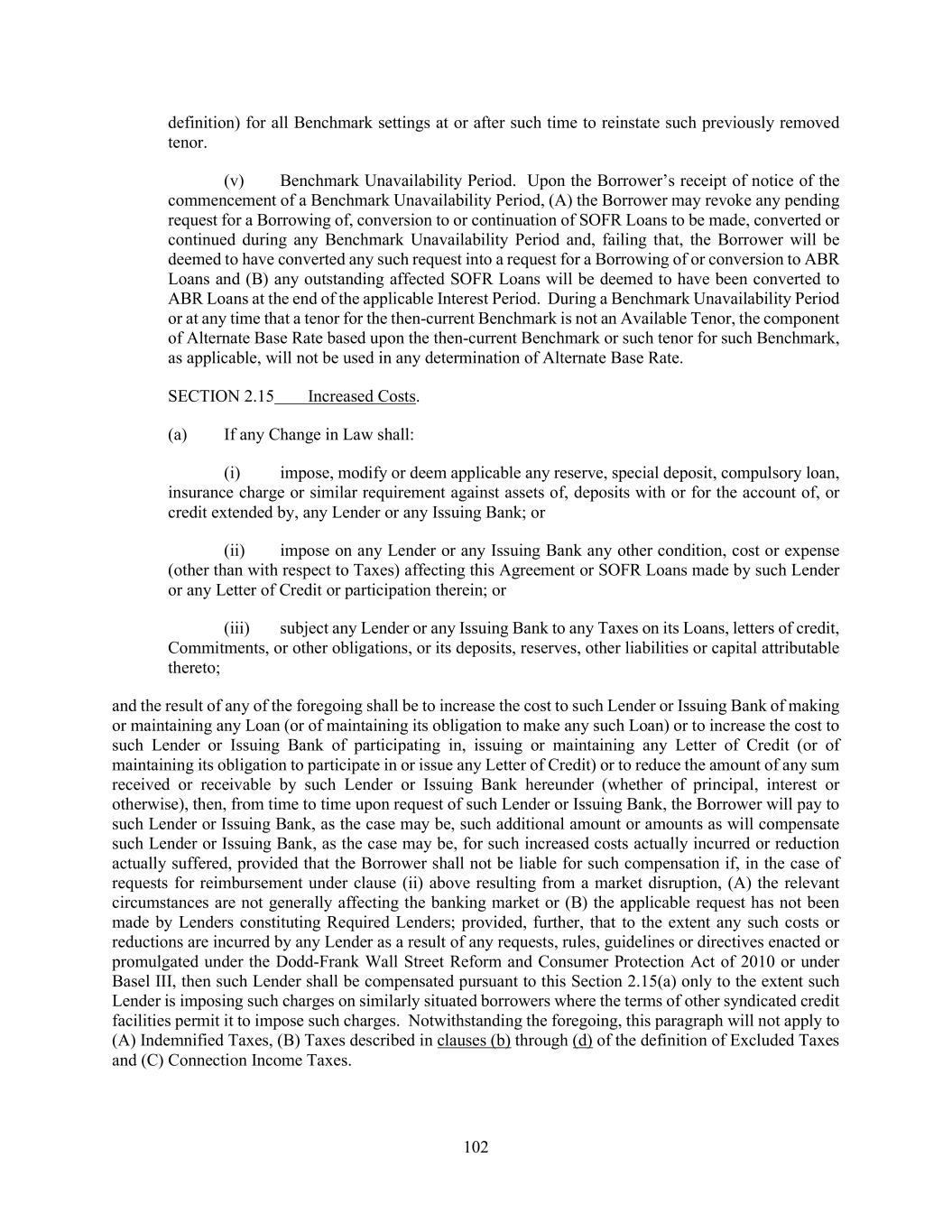 102 definition) for all Benchmark settings at or after such time to reinstate such previously removed tenor. (v) Benchmark Unavailability Period. Upon the Borrower’s receipt of notice of the commencement of a Benchmark Unavailability Period, (A) the Borrower may revoke any pending request for a Borrowing of, conversion to or continuation of SOFR Loans to be made, converted or continued during any Benchmark Unavailability Period and, failing that, the Borrower will be deemed to have converted any such request into a request for a Borrowing of or conversion to ABR Loans and (B) any outstanding affected SOFR Loans will be deemed to have been converted to ABR Loans at the end of the applicable Interest Period. During a Benchmark Unavailability Period or at any time that a tenor for the then-current Benchmark is not an Available Tenor, the component of Alternate Base Rate based upon the then-current Benchmark or such tenor for such Benchmark, as applicable, will not be used in any determination of Alternate Base Rate. SECTION 2.15 Increased Costs. (a) If any Change in Law shall: (i) impose, modify or deem applicable any reserve, special deposit, compulsory loan, insurance charge or similar requirement against assets of, deposits with or for the account of, or credit extended by, any Lender or any Issuing Bank; or (ii) impose on any Lender or any Issuing Bank any other condition, cost or expense (other than with respect to Taxes) affecting this Agreement or SOFR Loans made by such Lender or any Letter of Credit or participation therein; or (iii) subject any Lender or any Issuing Bank to any Taxes on its Loans, letters of credit, Commitments, or other obligations, or its deposits, reserves, other liabilities or capital attributable thereto; and the result of any of the foregoing shall be to increase the cost to such Lender or Issuing Bank of making or maintaining any Loan (or of maintaining its obligation to make any such Loan) or to increase the cost to such Lender or Issuing Bank of participating in, issuing or maintaining any Letter of Credit (or of maintaining its obligation to participate in or issue any Letter of Credit) or to reduce the amount of any sum received or receivable by such Lender or Issuing Bank hereunder (whether of principal, interest or otherwise), then, from time to time upon request of such Lender or Issuing Bank, the Borrower will pay to such Lender or Issuing Bank, as the case may be, such additional amount or amounts as will compensate such Lender or Issuing Bank, as the case may be, for such increased costs actually incurred or reduction actually suffered, provided that the Borrower shall not be liable for such compensation if, in the case of requests for reimbursement under clause (ii) above resulting from a market disruption, (A) the relevant circumstances are not generally affecting the banking market or (B) the applicable request has not been made by Lenders constituting Required Lenders; provided, further, that to the extent any such costs or reductions are incurred by any Lender as a result of any requests, rules, guidelines or directives enacted or promulgated under the Dodd-Frank Wall Street Reform and Consumer Protection Act of 2010 or under Basel III, then such Lender shall be compensated pursuant to this Section 2.15(a) only to the extent such Lender is imposing such charges on similarly situated borrowers where the terms of other syndicated credit facilities permit it to impose such charges. Notwithstanding the foregoing, this paragraph will not apply to (A) Indemnified Taxes, (B) Taxes described in clauses (b) through (d) of the definition of Excluded Taxes and (C) Connection Income Taxes.