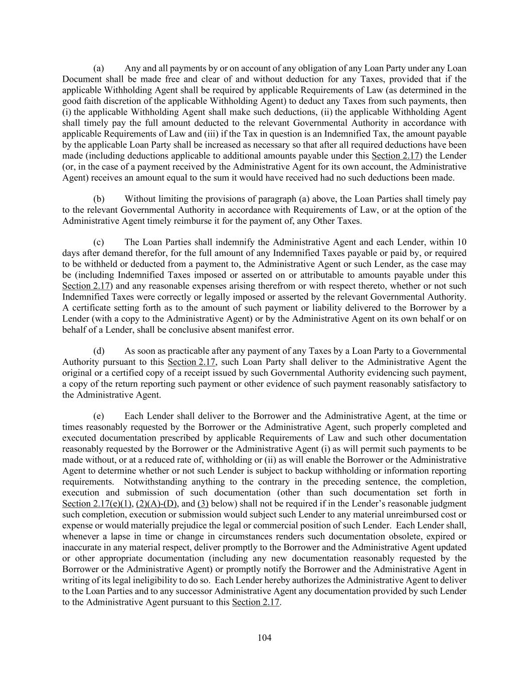 104 (a) Any and all payments by or on account of any obligation of any Loan Party under any Loan Document shall be made free and clear of and without deduction for any Taxes, provided that if the applicable Withholding Agent shall be required by applicable Requirements of Law (as determined in the good faith discretion of the applicable Withholding Agent) to deduct any Taxes from such payments, then (i) the applicable Withholding Agent shall make such deductions, (ii) the applicable Withholding Agent shall timely pay the full amount deducted to the relevant Governmental Authority in accordance with applicable Requirements of Law and (iii) if the Tax in question is an Indemnified Tax, the amount payable by the applicable Loan Party shall be increased as necessary so that after all required deductions have been made (including deductions applicable to additional amounts payable under this Section 2.17) the Lender (or, in the case of a payment received by the Administrative Agent for its own account, the Administrative Agent) receives an amount equal to the sum it would have received had no such deductions been made. (b) Without limiting the provisions of paragraph (a) above, the Loan Parties shall timely pay to the relevant Governmental Authority in accordance with Requirements of Law, or at the option of the Administrative Agent timely reimburse it for the payment of, any Other Taxes. (c) The Loan Parties shall indemnify the Administrative Agent and each Lender, within 10 days after demand therefor, for the full amount of any Indemnified Taxes payable or paid by, or required to be withheld or deducted from a payment to, the Administrative Agent or such Lender, as the case may be (including Indemnified Taxes imposed or asserted on or attributable to amounts payable under this Section 2.17) and any reasonable expenses arising therefrom or with respect thereto, whether or not such Indemnified Taxes were correctly or legally imposed or asserted by the relevant Governmental Authority. A certificate setting forth as to the amount of such payment or liability delivered to the Borrower by a Lender (with a copy to the Administrative Agent) or by the Administrative Agent on its own behalf or on behalf of a Lender, shall be conclusive absent manifest error. (d) As soon as practicable after any payment of any Taxes by a Loan Party to a Governmental Authority pursuant to this Section 2.17, such Loan Party shall deliver to the Administrative Agent the original or a certified copy of a receipt issued by such Governmental Authority evidencing such payment, a copy of the return reporting such payment or other evidence of such payment reasonably satisfactory to the Administrative Agent. (e) Each Lender shall deliver to the Borrower and the Administrative Agent, at the time or times reasonably requested by the Borrower or the Administrative Agent, such properly completed and executed documentation prescribed by applicable Requirements of Law and such other documentation reasonably requested by the Borrower or the Administrative Agent (i) as will permit such payments to be made without, or at a reduced rate of, withholding or (ii) as will enable the Borrower or the Administrative Agent to determine whether or not such Lender is subject to backup withholding or information reporting requirements. Notwithstanding anything to the contrary in the preceding sentence, the completion, execution and submission of such documentation (other than such documentation set forth in Section 2.17(e)(1), (2)(A)-(D), and (3) below) shall not be required if in the Lender’s reasonable judgment such completion, execution or submission would subject such Lender to any material unreimbursed cost or expense or would materially prejudice the legal or commercial position of such Lender. Each Lender shall, whenever a lapse in time or change in circumstances renders such documentation obsolete, expired or inaccurate in any material respect, deliver promptly to the Borrower and the Administrative Agent updated or other appropriate documentation (including any new documentation reasonably requested by the Borrower or the Administrative Agent) or promptly notify the Borrower and the Administrative Agent in writing of its legal ineligibility to do so. Each Lender hereby authorizes the Administrative Agent to deliver to the Loan Parties and to any successor Administrative Agent any documentation provided by such Lender to the Administrative Agent pursuant to this Section 2.17.