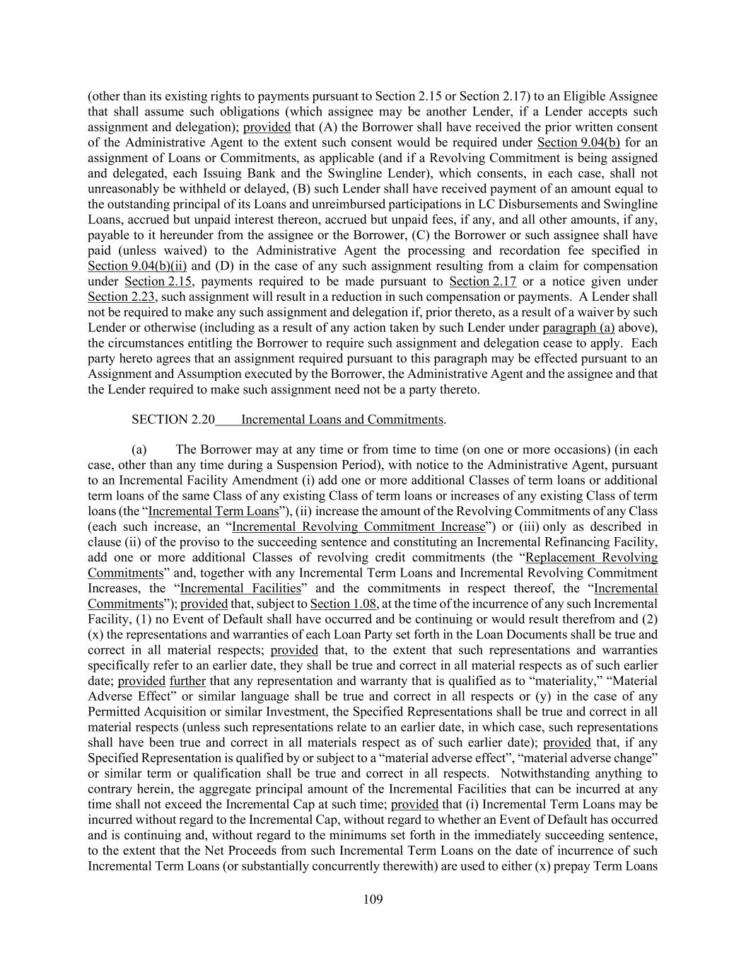 109 (other than its existing rights to payments pursuant to Section 2.15 or Section 2.17) to an Eligible Assignee that shall assume such obligations (which assignee may be another Lender, if a Lender accepts such assignment and delegation); provided that (A) the Borrower shall have received the prior written consent of the Administrative Agent to the extent such consent would be required under Section 9.04(b) for an assignment of Loans or Commitments, as applicable (and if a Revolving Commitment is being assigned and delegated, each Issuing Bank and the Swingline Lender), which consents, in each case, shall not unreasonably be withheld or delayed, (B) such Lender shall have received payment of an amount equal to the outstanding principal of its Loans and unreimbursed participations in LC Disbursements and Swingline Loans, accrued but unpaid interest thereon, accrued but unpaid fees, if any, and all other amounts, if any, payable to it hereunder from the assignee or the Borrower, (C) the Borrower or such assignee shall have paid (unless waived) to the Administrative Agent the processing and recordation fee specified in Section 9.04(b)(ii) and (D) in the case of any such assignment resulting from a claim for compensation under Section 2.15, payments required to be made pursuant to Section 2.17 or a notice given under Section 2.23, such assignment will result in a reduction in such compensation or payments. A Lender shall not be required to make any such assignment and delegation if, prior thereto, as a result of a waiver by such Lender or otherwise (including as a result of any action taken by such Lender under paragraph (a) above), the circumstances entitling the Borrower to require such assignment and delegation cease to apply. Each party hereto agrees that an assignment required pursuant to this paragraph may be effected pursuant to an Assignment and Assumption executed by the Borrower, the Administrative Agent and the assignee and that the Lender required to make such assignment need not be a party thereto. SECTION 2.20 Incremental Loans and Commitments. (a) The Borrower may at any time or from time to time (on one or more occasions) (in each case, other than any time during a Suspension Period), with notice to the Administrative Agent, pursuant to an Incremental Facility Amendment (i) add one or more additional Classes of term loans or additional term loans of the same Class of any existing Class of term loans or increases of any existing Class of term loans (the “Incremental Term Loans”), (ii) increase the amount of the Revolving Commitments of any Class (each such increase, an “Incremental Revolving Commitment Increase”) or (iii) only as described in clause (ii) of the proviso to the succeeding sentence and constituting an Incremental Refinancing Facility, add one or more additional Classes of revolving credit commitments (the “Replacement Revolving Commitments” and, together with any Incremental Term Loans and Incremental Revolving Commitment Increases, the “Incremental Facilities” and the commitments in respect thereof, the “Incremental Commitments”); provided that, subject to Section 1.08, at the time of the incurrence of any such Incremental Facility, (1) no Event of Default shall have occurred and be continuing or would result therefrom and (2) (x) the representations and warranties of each Loan Party set forth in the Loan Documents shall be true and correct in all material respects; provided that, to the extent that such representations and warranties specifically refer to an earlier date, they shall be true and correct in all material respects as of such earlier date; provided further that any representation and warranty that is qualified as to “materiality,” “Material Adverse Effect” or similar language shall be true and correct in all respects or (y) in the case of any Permitted Acquisition or similar Investment, the Specified Representations shall be true and correct in all material respects (unless such representations relate to an earlier date, in which case, such representations shall have been true and correct in all materials respect as of such earlier date); provided that, if any Specified Representation is qualified by or subject to a “material adverse effect”, “material adverse change” or similar term or qualification shall be true and correct in all respects. Notwithstanding anything to contrary herein, the aggregate principal amount of the Incremental Facilities that can be incurred at any time shall not exceed the Incremental Cap at such time; provided that (i) Incremental Term Loans may be incurred without regard to the Incremental Cap, without regard to whether an Event of Default has occurred and is continuing and, without regard to the minimums set forth in the immediately succeeding sentence, to the extent that the Net Proceeds from such Incremental Term Loans on the date of incurrence of such Incremental Term Loans (or substantially concurrently therewith) are used to either (x) prepay Term Loans