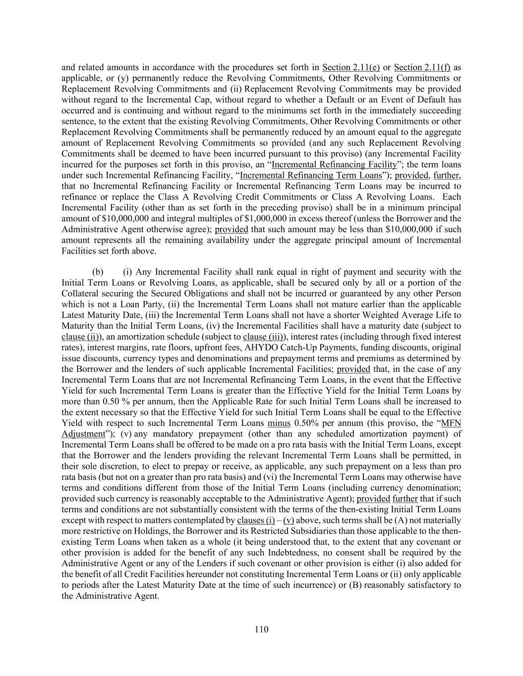 110 and related amounts in accordance with the procedures set forth in Section 2.11(e) or Section 2.11(f) as applicable, or (y) permanently reduce the Revolving Commitments, Other Revolving Commitments or Replacement Revolving Commitments and (ii) Replacement Revolving Commitments may be provided without regard to the Incremental Cap, without regard to whether a Default or an Event of Default has occurred and is continuing and without regard to the minimums set forth in the immediately succeeding sentence, to the extent that the existing Revolving Commitments, Other Revolving Commitments or other Replacement Revolving Commitments shall be permanently reduced by an amount equal to the aggregate amount of Replacement Revolving Commitments so provided (and any such Replacement Revolving Commitments shall be deemed to have been incurred pursuant to this proviso) (any Incremental Facility incurred for the purposes set forth in this proviso, an “Incremental Refinancing Facility”; the term loans under such Incremental Refinancing Facility, “Incremental Refinancing Term Loans”); provided, further, that no Incremental Refinancing Facility or Incremental Refinancing Term Loans may be incurred to refinance or replace the Class A Revolving Credit Commitments or Class A Revolving Loans. Each Incremental Facility (other than as set forth in the preceding proviso) shall be in a minimum principal amount of $10,000,000 and integral multiples of $1,000,000 in excess thereof (unless the Borrower and the Administrative Agent otherwise agree); provided that such amount may be less than $10,000,000 if such amount represents all the remaining availability under the aggregate principal amount of Incremental Facilities set forth above. (b) (i) Any Incremental Facility shall rank equal in right of payment and security with the Initial Term Loans or Revolving Loans, as applicable, shall be secured only by all or a portion of the Collateral securing the Secured Obligations and shall not be incurred or guaranteed by any other Person which is not a Loan Party, (ii) the Incremental Term Loans shall not mature earlier than the applicable Latest Maturity Date, (iii) the Incremental Term Loans shall not have a shorter Weighted Average Life to Maturity than the Initial Term Loans, (iv) the Incremental Facilities shall have a maturity date (subject to clause (ii)), an amortization schedule (subject to clause (iii)), interest rates (including through fixed interest rates), interest margins, rate floors, upfront fees, AHYDO Catch-Up Payments, funding discounts, original issue discounts, currency types and denominations and prepayment terms and premiums as determined by the Borrower and the lenders of such applicable Incremental Facilities; provided that, in the case of any Incremental Term Loans that are not Incremental Refinancing Term Loans, in the event that the Effective Yield for such Incremental Term Loans is greater than the Effective Yield for the Initial Term Loans by more than 0.50 % per annum, then the Applicable Rate for such Initial Term Loans shall be increased to the extent necessary so that the Effective Yield for such Initial Term Loans shall be equal to the Effective Yield with respect to such Incremental Term Loans minus 0.50% per annum (this proviso, the “MFN Adjustment”); (v) any mandatory prepayment (other than any scheduled amortization payment) of Incremental Term Loans shall be offered to be made on a pro rata basis with the Initial Term Loans, except that the Borrower and the lenders providing the relevant Incremental Term Loans shall be permitted, in their sole discretion, to elect to prepay or receive, as applicable, any such prepayment on a less than pro rata basis (but not on a greater than pro rata basis) and (vi) the Incremental Term Loans may otherwise have terms and conditions different from those of the Initial Term Loans (including currency denomination; provided such currency is reasonably acceptable to the Administrative Agent); provided further that if such terms and conditions are not substantially consistent with the terms of the then-existing Initial Term Loans except with respect to matters contemplated by clauses (i) – (v) above, such terms shall be (A) not materially more restrictive on Holdings, the Borrower and its Restricted Subsidiaries than those applicable to the then- existing Term Loans when taken as a whole (it being understood that, to the extent that any covenant or other provision is added for the benefit of any such Indebtedness, no consent shall be required by the Administrative Agent or any of the Lenders if such covenant or other provision is either (i) also added for the benefit of all Credit Facilities hereunder not constituting Incremental Term Loans or (ii) only applicable to periods after the Latest Maturity Date at the time of such incurrence) or (B) reasonably satisfactory to the Administrative Agent.