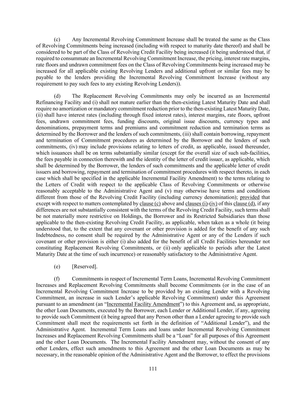 111 (c) Any Incremental Revolving Commitment Increase shall be treated the same as the Class of Revolving Commitments being increased (including with respect to maturity date thereof) and shall be considered to be part of the Class of Revolving Credit Facility being increased (it being understood that, if required to consummate an Incremental Revolving Commitment Increase, the pricing, interest rate margins, rate floors and undrawn commitment fees on the Class of Revolving Commitments being increased may be increased for all applicable existing Revolving Lenders and additional upfront or similar fees may be payable to the lenders providing the Incremental Revolving Commitment Increase (without any requirement to pay such fees to any existing Revolving Lenders)). (d) The Replacement Revolving Commitments may only be incurred as an Incremental Refinancing Facility and (i) shall not mature earlier than the then-existing Latest Maturity Date and shall require no amortization or mandatory commitment reduction prior to the then-existing Latest Maturity Date, (ii) shall have interest rates (including through fixed interest rates), interest margins, rate floors, upfront fees, undrawn commitment fees, funding discounts, original issue discounts, currency types and denominations, prepayment terms and premiums and commitment reduction and termination terms as determined by the Borrower and the lenders of such commitments, (iii) shall contain borrowing, repayment and termination of Commitment procedures as determined by the Borrower and the lenders of such commitments, (iv) may include provisions relating to letters of credit, as applicable, issued thereunder, which issuances shall be on terms substantially similar (except for the overall size of such sub-facilities, the fees payable in connection therewith and the identity of the letter of credit issuer, as applicable, which shall be determined by the Borrower, the lenders of such commitments and the applicable letter of credit issuers and borrowing, repayment and termination of commitment procedures with respect thereto, in each case which shall be specified in the applicable Incremental Facility Amendment) to the terms relating to the Letters of Credit with respect to the applicable Class of Revolving Commitments or otherwise reasonably acceptable to the Administrative Agent and (v) may otherwise have terms and conditions different from those of the Revolving Credit Facility (including currency denomination); provided that except with respect to matters contemplated by clause (c) above and clauses (i)-(iv) of this clause (d), if any differences are not substantially consistent with the terms of the Revolving Credit Facility, such terms shall be not materially more restrictive on Holdings, the Borrower and its Restricted Subsidiaries than those applicable to the then-existing Revolving Credit Facility, as applicable, when taken as a whole (it being understood that, to the extent that any covenant or other provision is added for the benefit of any such Indebtedness, no consent shall be required by the Administrative Agent or any of the Lenders if such covenant or other provision is either (i) also added for the benefit of all Credit Facilities hereunder not constituting Replacement Revolving Commitments, or (ii) only applicable to periods after the Latest Maturity Date at the time of such incurrence) or reasonably satisfactory to the Administrative Agent. (e) [Reserved]. (f) Commitments in respect of Incremental Term Loans, Incremental Revolving Commitment Increases and Replacement Revolving Commitments shall become Commitments (or in the case of an Incremental Revolving Commitment Increase to be provided by an existing Lender with a Revolving Commitment, an increase in such Lender’s applicable Revolving Commitment) under this Agreement pursuant to an amendment (an “Incremental Facility Amendment”) to this Agreement and, as appropriate, the other Loan Documents, executed by the Borrower, each Lender or Additional Lender, if any, agreeing to provide such Commitment (it being agreed that any Person other than a Lender agreeing to provide such Commitment shall meet the requirements set forth in the definition of “Additional Lender”), and the Administrative Agent. Incremental Term Loans and loans under Incremental Revolving Commitment Increases and Replacement Revolving Commitments shall be a “Loan” for all purposes of this Agreement and the other Loan Documents. The Incremental Facility Amendment may, without the consent of any other Lenders, effect such amendments to this Agreement and the other Loan Documents as may be necessary, in the reasonable opinion of the Administrative Agent and the Borrower, to effect the provisions