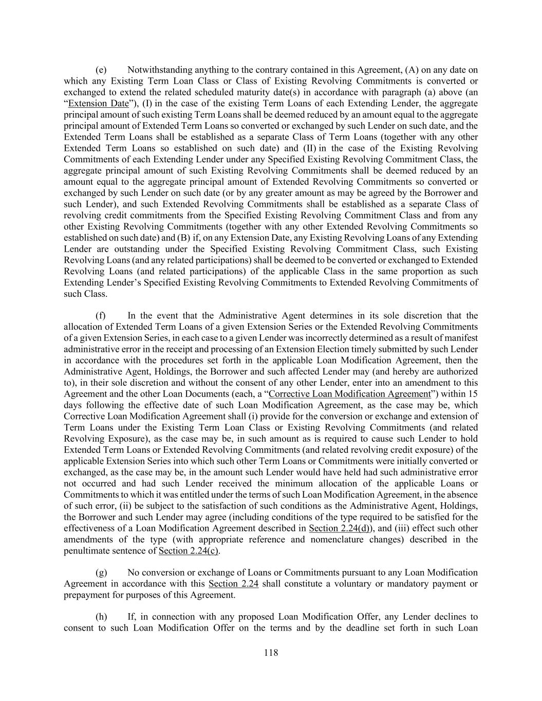 118 (e) Notwithstanding anything to the contrary contained in this Agreement, (A) on any date on which any Existing Term Loan Class or Class of Existing Revolving Commitments is converted or exchanged to extend the related scheduled maturity date(s) in accordance with paragraph (a) above (an “Extension Date”), (I) in the case of the existing Term Loans of each Extending Lender, the aggregate principal amount of such existing Term Loans shall be deemed reduced by an amount equal to the aggregate principal amount of Extended Term Loans so converted or exchanged by such Lender on such date, and the Extended Term Loans shall be established as a separate Class of Term Loans (together with any other Extended Term Loans so established on such date) and (II) in the case of the Existing Revolving Commitments of each Extending Lender under any Specified Existing Revolving Commitment Class, the aggregate principal amount of such Existing Revolving Commitments shall be deemed reduced by an amount equal to the aggregate principal amount of Extended Revolving Commitments so converted or exchanged by such Lender on such date (or by any greater amount as may be agreed by the Borrower and such Lender), and such Extended Revolving Commitments shall be established as a separate Class of revolving credit commitments from the Specified Existing Revolving Commitment Class and from any other Existing Revolving Commitments (together with any other Extended Revolving Commitments so established on such date) and (B) if, on any Extension Date, any Existing Revolving Loans of any Extending Lender are outstanding under the Specified Existing Revolving Commitment Class, such Existing Revolving Loans (and any related participations) shall be deemed to be converted or exchanged to Extended Revolving Loans (and related participations) of the applicable Class in the same proportion as such Extending Lender’s Specified Existing Revolving Commitments to Extended Revolving Commitments of such Class. (f) In the event that the Administrative Agent determines in its sole discretion that the allocation of Extended Term Loans of a given Extension Series or the Extended Revolving Commitments of a given Extension Series, in each case to a given Lender was incorrectly determined as a result of manifest administrative error in the receipt and processing of an Extension Election timely submitted by such Lender in accordance with the procedures set forth in the applicable Loan Modification Agreement, then the Administrative Agent, Holdings, the Borrower and such affected Lender may (and hereby are authorized to), in their sole discretion and without the consent of any other Lender, enter into an amendment to this Agreement and the other Loan Documents (each, a “Corrective Loan Modification Agreement”) within 15 days following the effective date of such Loan Modification Agreement, as the case may be, which Corrective Loan Modification Agreement shall (i) provide for the conversion or exchange and extension of Term Loans under the Existing Term Loan Class or Existing Revolving Commitments (and related Revolving Exposure), as the case may be, in such amount as is required to cause such Lender to hold Extended Term Loans or Extended Revolving Commitments (and related revolving credit exposure) of the applicable Extension Series into which such other Term Loans or Commitments were initially converted or exchanged, as the case may be, in the amount such Lender would have held had such administrative error not occurred and had such Lender received the minimum allocation of the applicable Loans or Commitments to which it was entitled under the terms of such Loan Modification Agreement, in the absence of such error, (ii) be subject to the satisfaction of such conditions as the Administrative Agent, Holdings, the Borrower and such Lender may agree (including conditions of the type required to be satisfied for the effectiveness of a Loan Modification Agreement described in Section 2.24(d)), and (iii) effect such other amendments of the type (with appropriate reference and nomenclature changes) described in the penultimate sentence of Section 2.24(c). (g) No conversion or exchange of Loans or Commitments pursuant to any Loan Modification Agreement in accordance with this Section 2.24 shall constitute a voluntary or mandatory payment or prepayment for purposes of this Agreement. (h) If, in connection with any proposed Loan Modification Offer, any Lender declines to consent to such Loan Modification Offer on the terms and by the deadline set forth in such Loan