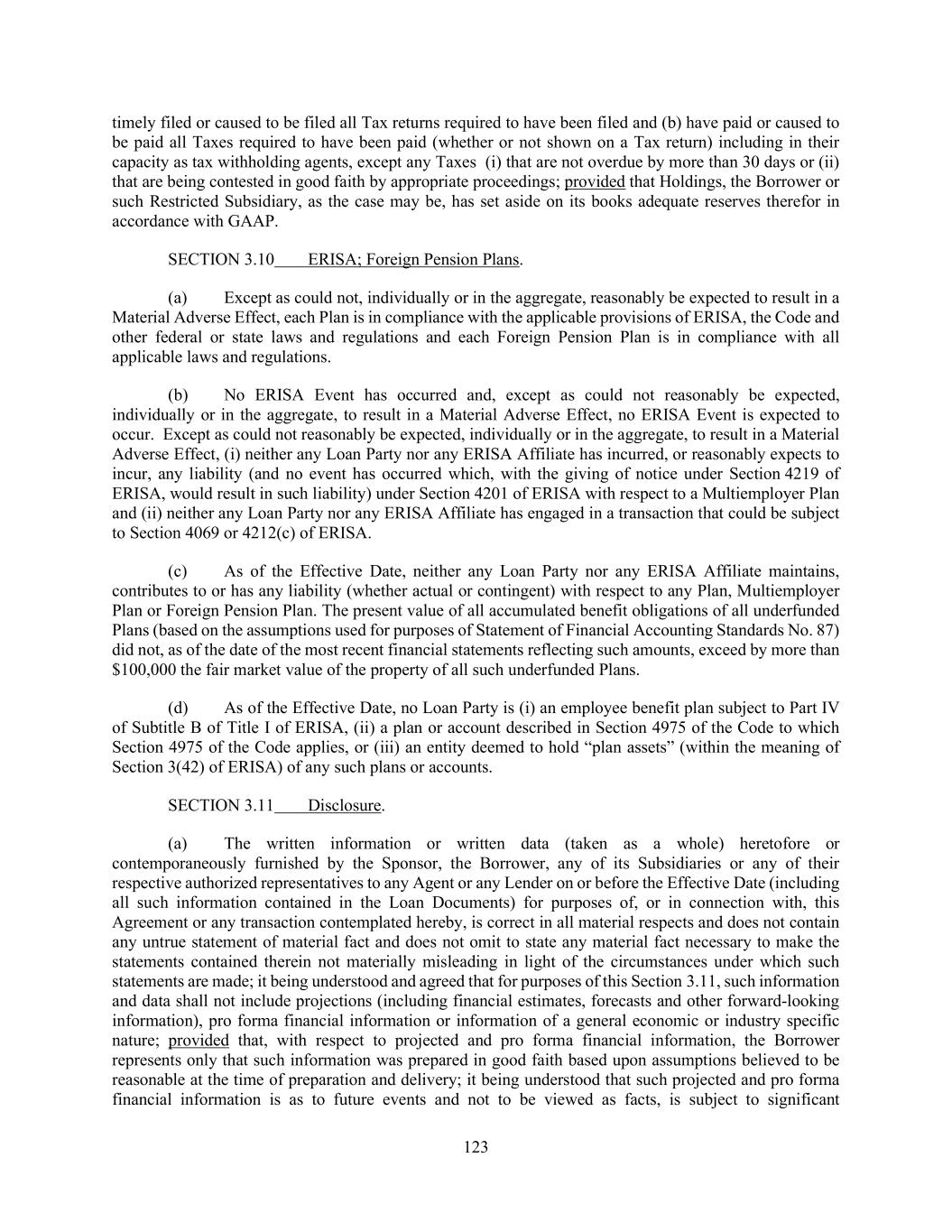 123 timely filed or caused to be filed all Tax returns required to have been filed and (b) have paid or caused to be paid all Taxes required to have been paid (whether or not shown on a Tax return) including in their capacity as tax withholding agents, except any Taxes (i) that are not overdue by more than 30 days or (ii) that are being contested in good faith by appropriate proceedings; provided that Holdings, the Borrower or such Restricted Subsidiary, as the case may be, has set aside on its books adequate reserves therefor in accordance with GAAP. SECTION 3.10 ERISA; Foreign Pension Plans. (a) Except as could not, individually or in the aggregate, reasonably be expected to result in a Material Adverse Effect, each Plan is in compliance with the applicable provisions of ERISA, the Code and other federal or state laws and regulations and each Foreign Pension Plan is in compliance with all applicable laws and regulations. (b) No ERISA Event has occurred and, except as could not reasonably be expected, individually or in the aggregate, to result in a Material Adverse Effect, no ERISA Event is expected to occur. Except as could not reasonably be expected, individually or in the aggregate, to result in a Material Adverse Effect, (i) neither any Loan Party nor any ERISA Affiliate has incurred, or reasonably expects to incur, any liability (and no event has occurred which, with the giving of notice under Section 4219 of ERISA, would result in such liability) under Section 4201 of ERISA with respect to a Multiemployer Plan and (ii) neither any Loan Party nor any ERISA Affiliate has engaged in a transaction that could be subject to Section 4069 or 4212(c) of ERISA. (c) As of the Effective Date, neither any Loan Party nor any ERISA Affiliate maintains, contributes to or has any liability (whether actual or contingent) with respect to any Plan, Multiemployer Plan or Foreign Pension Plan. The present value of all accumulated benefit obligations of all underfunded Plans (based on the assumptions used for purposes of Statement of Financial Accounting Standards No. 87) did not, as of the date of the most recent financial statements reflecting such amounts, exceed by more than $100,000 the fair market value of the property of all such underfunded Plans. (d) As of the Effective Date, no Loan Party is (i) an employee benefit plan subject to Part IV of Subtitle B of Title I of ERISA, (ii) a plan or account described in Section 4975 of the Code to which Section 4975 of the Code applies, or (iii) an entity deemed to hold “plan assets” (within the meaning of Section 3(42) of ERISA) of any such plans or accounts. SECTION 3.11 Disclosure. (a) The written information or written data (taken as a whole) heretofore or contemporaneously furnished by the Sponsor, the Borrower, any of its Subsidiaries or any of their respective authorized representatives to any Agent or any Lender on or before the Effective Date (including all such information contained in the Loan Documents) for purposes of, or in connection with, this Agreement or any transaction contemplated hereby, is correct in all material respects and does not contain any untrue statement of material fact and does not omit to state any material fact necessary to make the statements contained therein not materially misleading in light of the circumstances under which such statements are made; it being understood and agreed that for purposes of this Section 3.11, such information and data shall not include projections (including financial estimates, forecasts and other forward-looking information), pro forma financial information or information of a general economic or industry specific nature; provided that, with respect to projected and pro forma financial information, the Borrower represents only that such information was prepared in good faith based upon assumptions believed to be reasonable at the time of preparation and delivery; it being understood that such projected and pro forma financial information is as to future events and not to be viewed as facts, is subject to significant