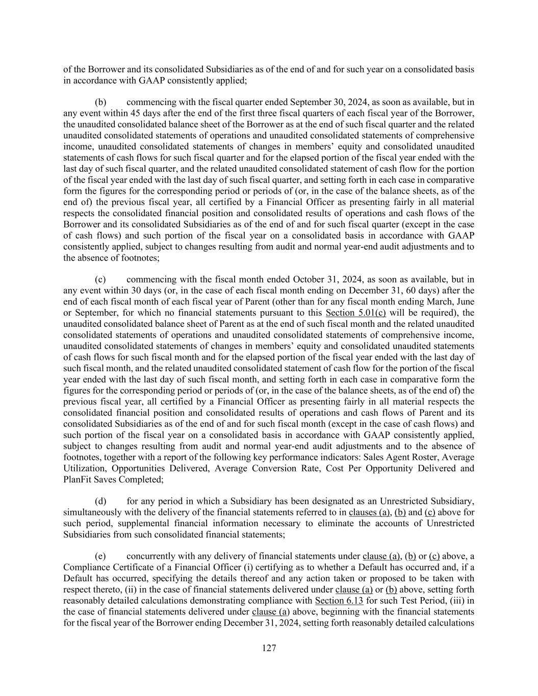 127 of the Borrower and its consolidated Subsidiaries as of the end of and for such year on a consolidated basis in accordance with GAAP consistently applied; (b) commencing with the fiscal quarter ended September 30, 2024, as soon as available, but in any event within 45 days after the end of the first three fiscal quarters of each fiscal year of the Borrower, the unaudited consolidated balance sheet of the Borrower as at the end of such fiscal quarter and the related unaudited consolidated statements of operations and unaudited consolidated statements of comprehensive income, unaudited consolidated statements of changes in members’ equity and consolidated unaudited statements of cash flows for such fiscal quarter and for the elapsed portion of the fiscal year ended with the last day of such fiscal quarter, and the related unaudited consolidated statement of cash flow for the portion of the fiscal year ended with the last day of such fiscal quarter, and setting forth in each case in comparative form the figures for the corresponding period or periods of (or, in the case of the balance sheets, as of the end of) the previous fiscal year, all certified by a Financial Officer as presenting fairly in all material respects the consolidated financial position and consolidated results of operations and cash flows of the Borrower and its consolidated Subsidiaries as of the end of and for such fiscal quarter (except in the case of cash flows) and such portion of the fiscal year on a consolidated basis in accordance with GAAP consistently applied, subject to changes resulting from audit and normal year-end audit adjustments and to the absence of footnotes; (c) commencing with the fiscal month ended October 31, 2024, as soon as available, but in any event within 30 days (or, in the case of each fiscal month ending on December 31, 60 days) after the end of each fiscal month of each fiscal year of Parent (other than for any fiscal month ending March, June or September, for which no financial statements pursuant to this Section 5.01(c) will be required), the unaudited consolidated balance sheet of Parent as at the end of such fiscal month and the related unaudited consolidated statements of operations and unaudited consolidated statements of comprehensive income, unaudited consolidated statements of changes in members’ equity and consolidated unaudited statements of cash flows for such fiscal month and for the elapsed portion of the fiscal year ended with the last day of such fiscal month, and the related unaudited consolidated statement of cash flow for the portion of the fiscal year ended with the last day of such fiscal month, and setting forth in each case in comparative form the figures for the corresponding period or periods of (or, in the case of the balance sheets, as of the end of) the previous fiscal year, all certified by a Financial Officer as presenting fairly in all material respects the consolidated financial position and consolidated results of operations and cash flows of Parent and its consolidated Subsidiaries as of the end of and for such fiscal month (except in the case of cash flows) and such portion of the fiscal year on a consolidated basis in accordance with GAAP consistently applied, subject to changes resulting from audit and normal year-end audit adjustments and to the absence of footnotes, together with a report of the following key performance indicators: Sales Agent Roster, Average Utilization, Opportunities Delivered, Average Conversion Rate, Cost Per Opportunity Delivered and PlanFit Saves Completed; (d) for any period in which a Subsidiary has been designated as an Unrestricted Subsidiary, simultaneously with the delivery of the financial statements referred to in clauses (a), (b) and (c) above for such period, supplemental financial information necessary to eliminate the accounts of Unrestricted Subsidiaries from such consolidated financial statements; (e) concurrently with any delivery of financial statements under clause (a), (b) or (c) above, a Compliance Certificate of a Financial Officer (i) certifying as to whether a Default has occurred and, if a Default has occurred, specifying the details thereof and any action taken or proposed to be taken with respect thereto, (ii) in the case of financial statements delivered under clause (a) or (b) above, setting forth reasonably detailed calculations demonstrating compliance with Section 6.13 for such Test Period, (iii) in the case of financial statements delivered under clause (a) above, beginning with the financial statements for the fiscal year of the Borrower ending December 31, 2024, setting forth reasonably detailed calculations