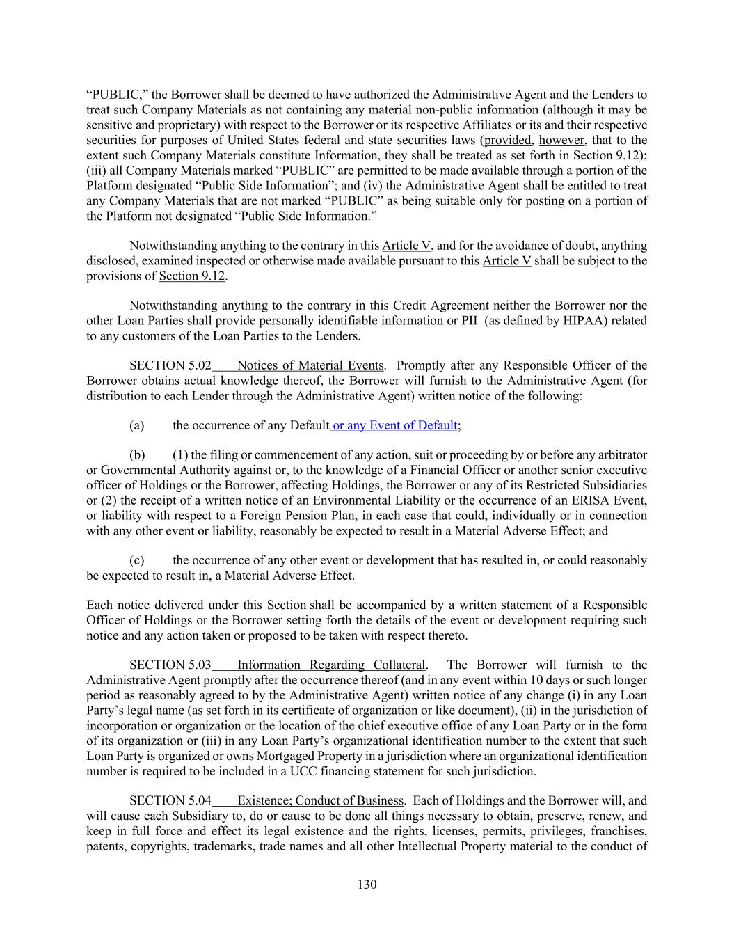 130 “PUBLIC,” the Borrower shall be deemed to have authorized the Administrative Agent and the Lenders to treat such Company Materials as not containing any material non-public information (although it may be sensitive and proprietary) with respect to the Borrower or its respective Affiliates or its and their respective securities for purposes of United States federal and state securities laws (provided, however, that to the extent such Company Materials constitute Information, they shall be treated as set forth in Section 9.12); (iii) all Company Materials marked “PUBLIC” are permitted to be made available through a portion of the Platform designated “Public Side Information”; and (iv) the Administrative Agent shall be entitled to treat any Company Materials that are not marked “PUBLIC” as being suitable only for posting on a portion of the Platform not designated “Public Side Information.” Notwithstanding anything to the contrary in this Article V, and for the avoidance of doubt, anything disclosed, examined inspected or otherwise made available pursuant to this Article V shall be subject to the provisions of Section 9.12. Notwithstanding anything to the contrary in this Credit Agreement neither the Borrower nor the other Loan Parties shall provide personally identifiable information or PII (as defined by HIPAA) related to any customers of the Loan Parties to the Lenders. SECTION 5.02 Notices of Material Events. Promptly after any Responsible Officer of the Borrower obtains actual knowledge thereof, the Borrower will furnish to the Administrative Agent (for distribution to each Lender through the Administrative Agent) written notice of the following: (a) the occurrence of any Default or any Event of Default; (b) (1) the filing or commencement of any action, suit or proceeding by or before any arbitrator or Governmental Authority against or, to the knowledge of a Financial Officer or another senior executive officer of Holdings or the Borrower, affecting Holdings, the Borrower or any of its Restricted Subsidiaries or (2) the receipt of a written notice of an Environmental Liability or the occurrence of an ERISA Event, or liability with respect to a Foreign Pension Plan, in each case that could, individually or in connection with any other event or liability, reasonably be expected to result in a Material Adverse Effect; and (c) the occurrence of any other event or development that has resulted in, or could reasonably be expected to result in, a Material Adverse Effect. Each notice delivered under this Section shall be accompanied by a written statement of a Responsible Officer of Holdings or the Borrower setting forth the details of the event or development requiring such notice and any action taken or proposed to be taken with respect thereto. SECTION 5.03 Information Regarding Collateral. The Borrower will furnish to the Administrative Agent promptly after the occurrence thereof (and in any event within 10 days or such longer period as reasonably agreed to by the Administrative Agent) written notice of any change (i) in any Loan Party’s legal name (as set forth in its certificate of organization or like document), (ii) in the jurisdiction of incorporation or organization or the location of the chief executive office of any Loan Party or in the form of its organization or (iii) in any Loan Party’s organizational identification number to the extent that such Loan Party is organized or owns Mortgaged Property in a jurisdiction where an organizational identification number is required to be included in a UCC financing statement for such jurisdiction. SECTION 5.04 Existence; Conduct of Business. Each of Holdings and the Borrower will, and will cause each Subsidiary to, do or cause to be done all things necessary to obtain, preserve, renew, and keep in full force and effect its legal existence and the rights, licenses, permits, privileges, franchises, patents, copyrights, trademarks, trade names and all other Intellectual Property material to the conduct of