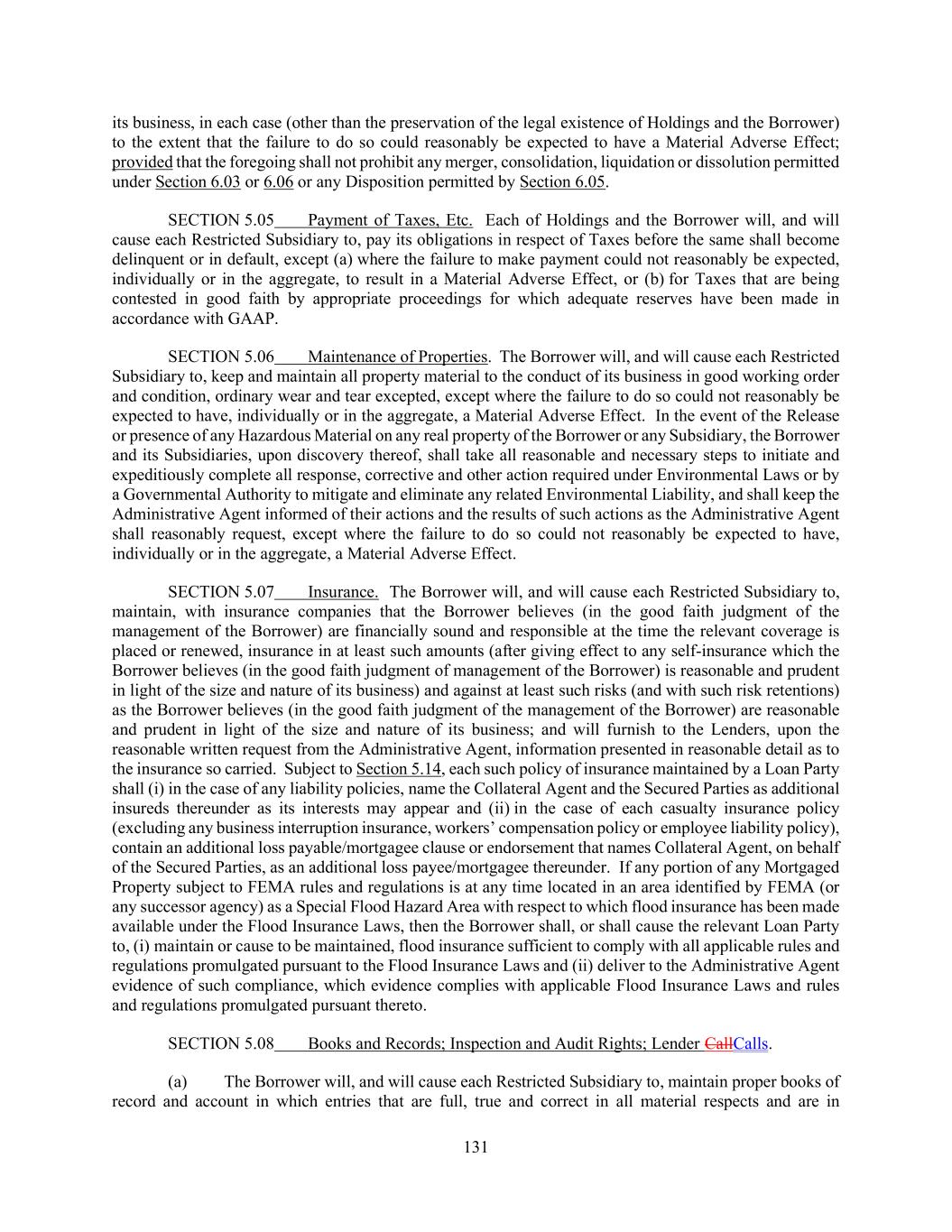 131 its business, in each case (other than the preservation of the legal existence of Holdings and the Borrower) to the extent that the failure to do so could reasonably be expected to have a Material Adverse Effect; provided that the foregoing shall not prohibit any merger, consolidation, liquidation or dissolution permitted under Section 6.03 or 6.06 or any Disposition permitted by Section 6.05. SECTION 5.05 Payment of Taxes, Etc. Each of Holdings and the Borrower will, and will cause each Restricted Subsidiary to, pay its obligations in respect of Taxes before the same shall become delinquent or in default, except (a) where the failure to make payment could not reasonably be expected, individually or in the aggregate, to result in a Material Adverse Effect, or (b) for Taxes that are being contested in good faith by appropriate proceedings for which adequate reserves have been made in accordance with GAAP. SECTION 5.06 Maintenance of Properties. The Borrower will, and will cause each Restricted Subsidiary to, keep and maintain all property material to the conduct of its business in good working order and condition, ordinary wear and tear excepted, except where the failure to do so could not reasonably be expected to have, individually or in the aggregate, a Material Adverse Effect. In the event of the Release or presence of any Hazardous Material on any real property of the Borrower or any Subsidiary, the Borrower and its Subsidiaries, upon discovery thereof, shall take all reasonable and necessary steps to initiate and expeditiously complete all response, corrective and other action required under Environmental Laws or by a Governmental Authority to mitigate and eliminate any related Environmental Liability, and shall keep the Administrative Agent informed of their actions and the results of such actions as the Administrative Agent shall reasonably request, except where the failure to do so could not reasonably be expected to have, individually or in the aggregate, a Material Adverse Effect. SECTION 5.07 Insurance. The Borrower will, and will cause each Restricted Subsidiary to, maintain, with insurance companies that the Borrower believes (in the good faith judgment of the management of the Borrower) are financially sound and responsible at the time the relevant coverage is placed or renewed, insurance in at least such amounts (after giving effect to any self-insurance which the Borrower believes (in the good faith judgment of management of the Borrower) is reasonable and prudent in light of the size and nature of its business) and against at least such risks (and with such risk retentions) as the Borrower believes (in the good faith judgment of the management of the Borrower) are reasonable and prudent in light of the size and nature of its business; and will furnish to the Lenders, upon the reasonable written request from the Administrative Agent, information presented in reasonable detail as to the insurance so carried. Subject to Section 5.14, each such policy of insurance maintained by a Loan Party shall (i) in the case of any liability policies, name the Collateral Agent and the Secured Parties as additional insureds thereunder as its interests may appear and (ii) in the case of each casualty insurance policy (excluding any business interruption insurance, workers’ compensation policy or employee liability policy), contain an additional loss payable/mortgagee clause or endorsement that names Collateral Agent, on behalf of the Secured Parties, as an additional loss payee/mortgagee thereunder. If any portion of any Mortgaged Property subject to FEMA rules and regulations is at any time located in an area identified by FEMA (or any successor agency) as a Special Flood Hazard Area with respect to which flood insurance has been made available under the Flood Insurance Laws, then the Borrower shall, or shall cause the relevant Loan Party to, (i) maintain or cause to be maintained, flood insurance sufficient to comply with all applicable rules and regulations promulgated pursuant to the Flood Insurance Laws and (ii) deliver to the Administrative Agent evidence of such compliance, which evidence complies with applicable Flood Insurance Laws and rules and regulations promulgated pursuant thereto. SECTION 5.08 Books and Records; Inspection and Audit Rights; Lender CallCalls. (a) The Borrower will, and will cause each Restricted Subsidiary to, maintain proper books of record and account in which entries that are full, true and correct in all material respects and are in
