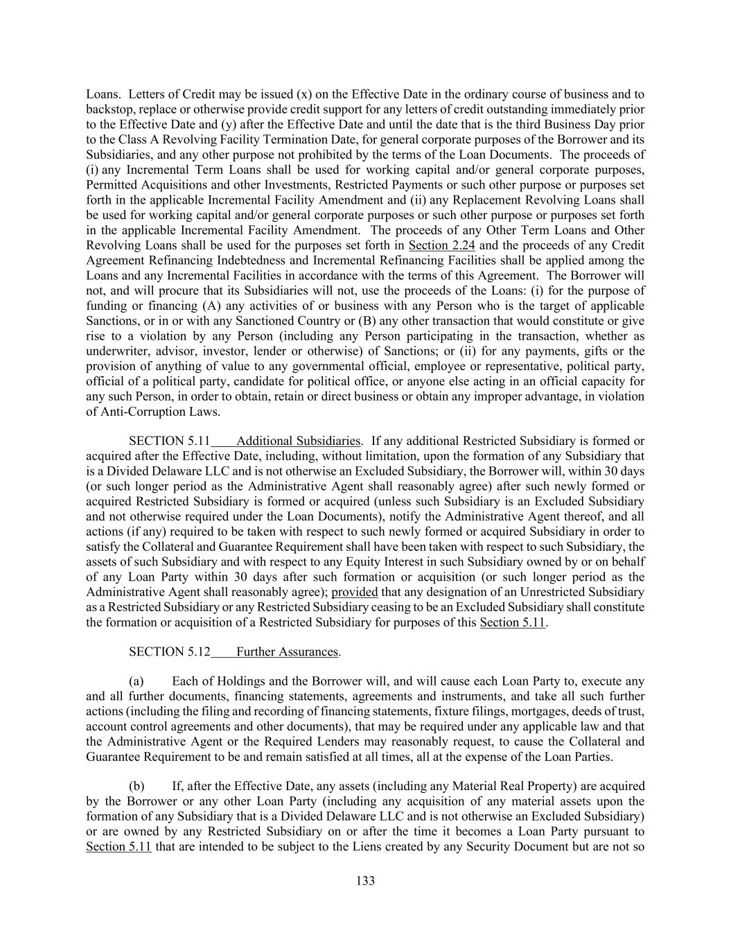 133 Loans. Letters of Credit may be issued (x) on the Effective Date in the ordinary course of business and to backstop, replace or otherwise provide credit support for any letters of credit outstanding immediately prior to the Effective Date and (y) after the Effective Date and until the date that is the third Business Day prior to the Class A Revolving Facility Termination Date, for general corporate purposes of the Borrower and its Subsidiaries, and any other purpose not prohibited by the terms of the Loan Documents. The proceeds of (i) any Incremental Term Loans shall be used for working capital and/or general corporate purposes, Permitted Acquisitions and other Investments, Restricted Payments or such other purpose or purposes set forth in the applicable Incremental Facility Amendment and (ii) any Replacement Revolving Loans shall be used for working capital and/or general corporate purposes or such other purpose or purposes set forth in the applicable Incremental Facility Amendment. The proceeds of any Other Term Loans and Other Revolving Loans shall be used for the purposes set forth in Section 2.24 and the proceeds of any Credit Agreement Refinancing Indebtedness and Incremental Refinancing Facilities shall be applied among the Loans and any Incremental Facilities in accordance with the terms of this Agreement. The Borrower will not, and will procure that its Subsidiaries will not, use the proceeds of the Loans: (i) for the purpose of funding or financing (A) any activities of or business with any Person who is the target of applicable Sanctions, or in or with any Sanctioned Country or (B) any other transaction that would constitute or give rise to a violation by any Person (including any Person participating in the transaction, whether as underwriter, advisor, investor, lender or otherwise) of Sanctions; or (ii) for any payments, gifts or the provision of anything of value to any governmental official, employee or representative, political party, official of a political party, candidate for political office, or anyone else acting in an official capacity for any such Person, in order to obtain, retain or direct business or obtain any improper advantage, in violation of Anti-Corruption Laws. SECTION 5.11 Additional Subsidiaries. If any additional Restricted Subsidiary is formed or acquired after the Effective Date, including, without limitation, upon the formation of any Subsidiary that is a Divided Delaware LLC and is not otherwise an Excluded Subsidiary, the Borrower will, within 30 days (or such longer period as the Administrative Agent shall reasonably agree) after such newly formed or acquired Restricted Subsidiary is formed or acquired (unless such Subsidiary is an Excluded Subsidiary and not otherwise required under the Loan Documents), notify the Administrative Agent thereof, and all actions (if any) required to be taken with respect to such newly formed or acquired Subsidiary in order to satisfy the Collateral and Guarantee Requirement shall have been taken with respect to such Subsidiary, the assets of such Subsidiary and with respect to any Equity Interest in such Subsidiary owned by or on behalf of any Loan Party within 30 days after such formation or acquisition (or such longer period as the Administrative Agent shall reasonably agree); provided that any designation of an Unrestricted Subsidiary as a Restricted Subsidiary or any Restricted Subsidiary ceasing to be an Excluded Subsidiary shall constitute the formation or acquisition of a Restricted Subsidiary for purposes of this Section 5.11. SECTION 5.12 Further Assurances. (a) Each of Holdings and the Borrower will, and will cause each Loan Party to, execute any and all further documents, financing statements, agreements and instruments, and take all such further actions (including the filing and recording of financing statements, fixture filings, mortgages, deeds of trust, account control agreements and other documents), that may be required under any applicable law and that the Administrative Agent or the Required Lenders may reasonably request, to cause the Collateral and Guarantee Requirement to be and remain satisfied at all times, all at the expense of the Loan Parties. (b) If, after the Effective Date, any assets (including any Material Real Property) are acquired by the Borrower or any other Loan Party (including any acquisition of any material assets upon the formation of any Subsidiary that is a Divided Delaware LLC and is not otherwise an Excluded Subsidiary) or are owned by any Restricted Subsidiary on or after the time it becomes a Loan Party pursuant to Section 5.11 that are intended to be subject to the Liens created by any Security Document but are not so