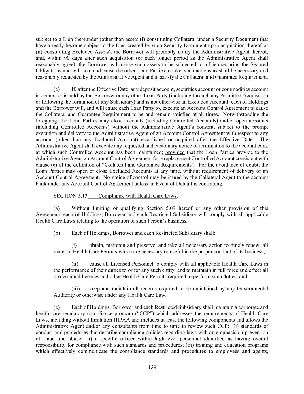 134 subject to a Lien thereunder (other than assets (i) constituting Collateral under a Security Document that have already become subject to the Lien created by such Security Document upon acquisition thereof or (ii) constituting Excluded Assets), the Borrower will promptly notify the Administrative Agent thereof, and, within 90 days after such acquisition (or such longer period as the Administrative Agent shall reasonably agree), the Borrower will cause such assets to be subjected to a Lien securing the Secured Obligations and will take and cause the other Loan Parties to take, such actions as shall be necessary and reasonably requested by the Administrative Agent and to satisfy the Collateral and Guarantee Requirement. (c) If, after the Effective Date, any deposit account, securities account or commodities account is opened or is held by the Borrower or any other Loan Party (including through any Permitted Acquisition or following the formation of any Subsidiary) and is not otherwise an Excluded Account, each of Holdings and the Borrower will, and will cause each Loan Party to, execute an Account Control Agreement to cause the Collateral and Guarantee Requirement to be and remain satisfied at all times. Notwithstanding the foregoing, the Loan Parties may close accounts (including Controlled Accounts) and/or open accounts (including Controlled Accounts) without the Administrative Agent’s consent, subject to the prompt execution and delivery to the Administrative Agent of an Account Control Agreement with respect to any account (other than any Excluded Account) established or acquired after the Effective Date. The Administrative Agent shall execute any requested and customary notice of termination to the account bank at which such Controlled Account has been maintained; provided that the Loan Parties provide to the Administrative Agent an Account Control Agreement for a replacement Controlled Account consistent with clause (e) of the definition of “Collateral and Guarantee Requirements”. For the avoidance of doubt, the Loan Parties may open or close Excluded Accounts at any time, without requirement of delivery of an Account Control Agreement. No notice of control may be issued by the Collateral Agent to the account bank under any Account Control Agreement unless an Event of Default is continuing. SECTION 5.13 Compliance with Health Care Laws. (a) Without limiting or qualifying Section 5.09 hereof or any other provision of this Agreement, each of Holdings, Borrower and each Restricted Subsidiary will comply with all applicable Health Care Laws relating to the operation of such Person’s business. (b) Each of Holdings, Borrower and each Restricted Subsidiary shall: (i) obtain, maintain and preserve, and take all necessary action to timely renew, all material Health Care Permits which are necessary or useful in the proper conduct of its business; (ii) cause all Licensed Personnel to comply with all applicable Health Care Laws in the performance of their duties to or for any such entity, and to maintain in full force and effect all professional licenses and other Health Care Permits required to perform such duties; and (iii) keep and maintain all records required to be maintained by any Governmental Authority or otherwise under any Health Care Law. (c) Each of Holdings, Borrower and each Restricted Subsidiary shall maintain a corporate and health care regulatory compliance program (“CCP”) which addresses the requirements of Health Care Laws, including without limitation HIPAA and includes at least the following components and allows the Administrative Agent and/or any consultants from time to time to review such CCP: (i) standards of conduct and procedures that describe compliance policies regarding laws with an emphasis on prevention of fraud and abuse; (ii) a specific officer within high-level personnel identified as having overall responsibility for compliance with such standards and procedures; (iii) training and education programs which effectively communicate the compliance standards and procedures to employees and agents,
