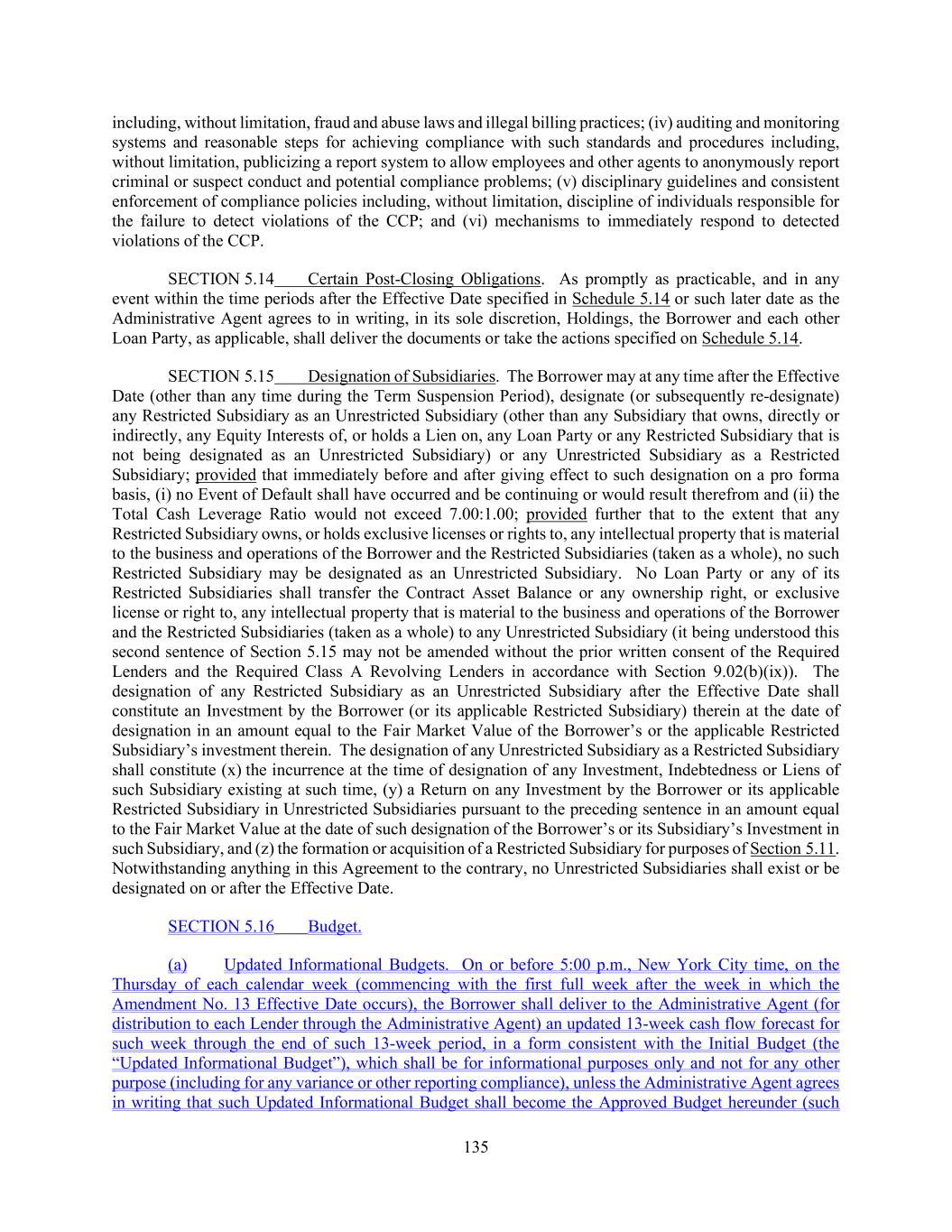 135 including, without limitation, fraud and abuse laws and illegal billing practices; (iv) auditing and monitoring systems and reasonable steps for achieving compliance with such standards and procedures including, without limitation, publicizing a report system to allow employees and other agents to anonymously report criminal or suspect conduct and potential compliance problems; (v) disciplinary guidelines and consistent enforcement of compliance policies including, without limitation, discipline of individuals responsible for the failure to detect violations of the CCP; and (vi) mechanisms to immediately respond to detected violations of the CCP. SECTION 5.14 Certain Post-Closing Obligations. As promptly as practicable, and in any event within the time periods after the Effective Date specified in Schedule 5.14 or such later date as the Administrative Agent agrees to in writing, in its sole discretion, Holdings, the Borrower and each other Loan Party, as applicable, shall deliver the documents or take the actions specified on Schedule 5.14. SECTION 5.15 Designation of Subsidiaries. The Borrower may at any time after the Effective Date (other than any time during the Term Suspension Period), designate (or subsequently re-designate) any Restricted Subsidiary as an Unrestricted Subsidiary (other than any Subsidiary that owns, directly or indirectly, any Equity Interests of, or holds a Lien on, any Loan Party or any Restricted Subsidiary that is not being designated as an Unrestricted Subsidiary) or any Unrestricted Subsidiary as a Restricted Subsidiary; provided that immediately before and after giving effect to such designation on a pro forma basis, (i) no Event of Default shall have occurred and be continuing or would result therefrom and (ii) the Total Cash Leverage Ratio would not exceed 7.00:1.00; provided further that to the extent that any Restricted Subsidiary owns, or holds exclusive licenses or rights to, any intellectual property that is material to the business and operations of the Borrower and the Restricted Subsidiaries (taken as a whole), no such Restricted Subsidiary may be designated as an Unrestricted Subsidiary. No Loan Party or any of its Restricted Subsidiaries shall transfer the Contract Asset Balance or any ownership right, or exclusive license or right to, any intellectual property that is material to the business and operations of the Borrower and the Restricted Subsidiaries (taken as a whole) to any Unrestricted Subsidiary (it being understood this second sentence of Section 5.15 may not be amended without the prior written consent of the Required Lenders and the Required Class A Revolving Lenders in accordance with Section 9.02(b)(ix)). The designation of any Restricted Subsidiary as an Unrestricted Subsidiary after the Effective Date shall constitute an Investment by the Borrower (or its applicable Restricted Subsidiary) therein at the date of designation in an amount equal to the Fair Market Value of the Borrower’s or the applicable Restricted Subsidiary’s investment therein. The designation of any Unrestricted Subsidiary as a Restricted Subsidiary shall constitute (x) the incurrence at the time of designation of any Investment, Indebtedness or Liens of such Subsidiary existing at such time, (y) a Return on any Investment by the Borrower or its applicable Restricted Subsidiary in Unrestricted Subsidiaries pursuant to the preceding sentence in an amount equal to the Fair Market Value at the date of such designation of the Borrower’s or its Subsidiary’s Investment in such Subsidiary, and (z) the formation or acquisition of a Restricted Subsidiary for purposes of Section 5.11. Notwithstanding anything in this Agreement to the contrary, no Unrestricted Subsidiaries shall exist or be designated on or after the Effective Date. SECTION 5.16 Budget. (a) Updated Informational Budgets. On or before 5:00 p.m., New York City time, on the Thursday of each calendar week (commencing with the first full week after the week in which the Amendment No. 13 Effective Date occurs), the Borrower shall deliver to the Administrative Agent (for distribution to each Lender through the Administrative Agent) an updated 13-week cash flow forecast for such week through the end of such 13-week period, in a form consistent with the Initial Budget (the “Updated Informational Budget”), which shall be for informational purposes only and not for any other purpose (including for any variance or other reporting compliance), unless the Administrative Agent agrees in writing that such Updated Informational Budget shall become the Approved Budget hereunder (such