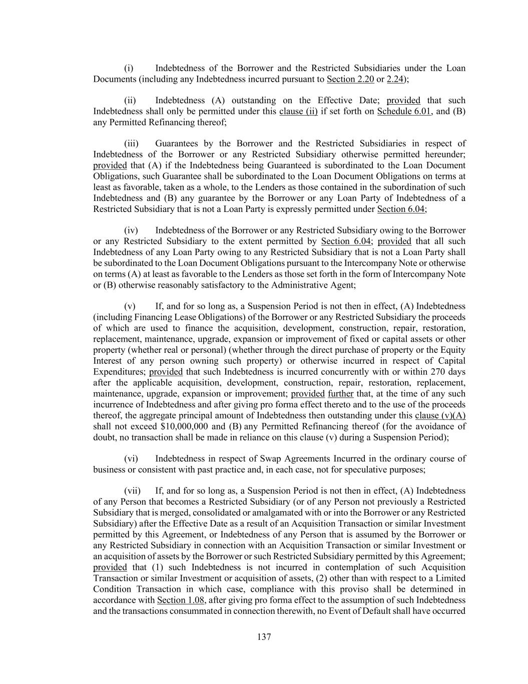 137 (i) Indebtedness of the Borrower and the Restricted Subsidiaries under the Loan Documents (including any Indebtedness incurred pursuant to Section 2.20 or 2.24); (ii) Indebtedness (A) outstanding on the Effective Date; provided that such Indebtedness shall only be permitted under this clause (ii) if set forth on Schedule 6.01, and (B) any Permitted Refinancing thereof; (iii) Guarantees by the Borrower and the Restricted Subsidiaries in respect of Indebtedness of the Borrower or any Restricted Subsidiary otherwise permitted hereunder; provided that (A) if the Indebtedness being Guaranteed is subordinated to the Loan Document Obligations, such Guarantee shall be subordinated to the Loan Document Obligations on terms at least as favorable, taken as a whole, to the Lenders as those contained in the subordination of such Indebtedness and (B) any guarantee by the Borrower or any Loan Party of Indebtedness of a Restricted Subsidiary that is not a Loan Party is expressly permitted under Section 6.04; (iv) Indebtedness of the Borrower or any Restricted Subsidiary owing to the Borrower or any Restricted Subsidiary to the extent permitted by Section 6.04; provided that all such Indebtedness of any Loan Party owing to any Restricted Subsidiary that is not a Loan Party shall be subordinated to the Loan Document Obligations pursuant to the Intercompany Note or otherwise on terms (A) at least as favorable to the Lenders as those set forth in the form of Intercompany Note or (B) otherwise reasonably satisfactory to the Administrative Agent; (v) If, and for so long as, a Suspension Period is not then in effect, (A) Indebtedness (including Financing Lease Obligations) of the Borrower or any Restricted Subsidiary the proceeds of which are used to finance the acquisition, development, construction, repair, restoration, replacement, maintenance, upgrade, expansion or improvement of fixed or capital assets or other property (whether real or personal) (whether through the direct purchase of property or the Equity Interest of any person owning such property) or otherwise incurred in respect of Capital Expenditures; provided that such Indebtedness is incurred concurrently with or within 270 days after the applicable acquisition, development, construction, repair, restoration, replacement, maintenance, upgrade, expansion or improvement; provided further that, at the time of any such incurrence of Indebtedness and after giving pro forma effect thereto and to the use of the proceeds thereof, the aggregate principal amount of Indebtedness then outstanding under this clause (v)(A) shall not exceed $10,000,000 and (B) any Permitted Refinancing thereof (for the avoidance of doubt, no transaction shall be made in reliance on this clause (v) during a Suspension Period); (vi) Indebtedness in respect of Swap Agreements Incurred in the ordinary course of business or consistent with past practice and, in each case, not for speculative purposes; (vii) If, and for so long as, a Suspension Period is not then in effect, (A) Indebtedness of any Person that becomes a Restricted Subsidiary (or of any Person not previously a Restricted Subsidiary that is merged, consolidated or amalgamated with or into the Borrower or any Restricted Subsidiary) after the Effective Date as a result of an Acquisition Transaction or similar Investment permitted by this Agreement, or Indebtedness of any Person that is assumed by the Borrower or any Restricted Subsidiary in connection with an Acquisition Transaction or similar Investment or an acquisition of assets by the Borrower or such Restricted Subsidiary permitted by this Agreement; provided that (1) such Indebtedness is not incurred in contemplation of such Acquisition Transaction or similar Investment or acquisition of assets, (2) other than with respect to a Limited Condition Transaction in which case, compliance with this proviso shall be determined in accordance with Section 1.08, after giving pro forma effect to the assumption of such Indebtedness and the transactions consummated in connection therewith, no Event of Default shall have occurred