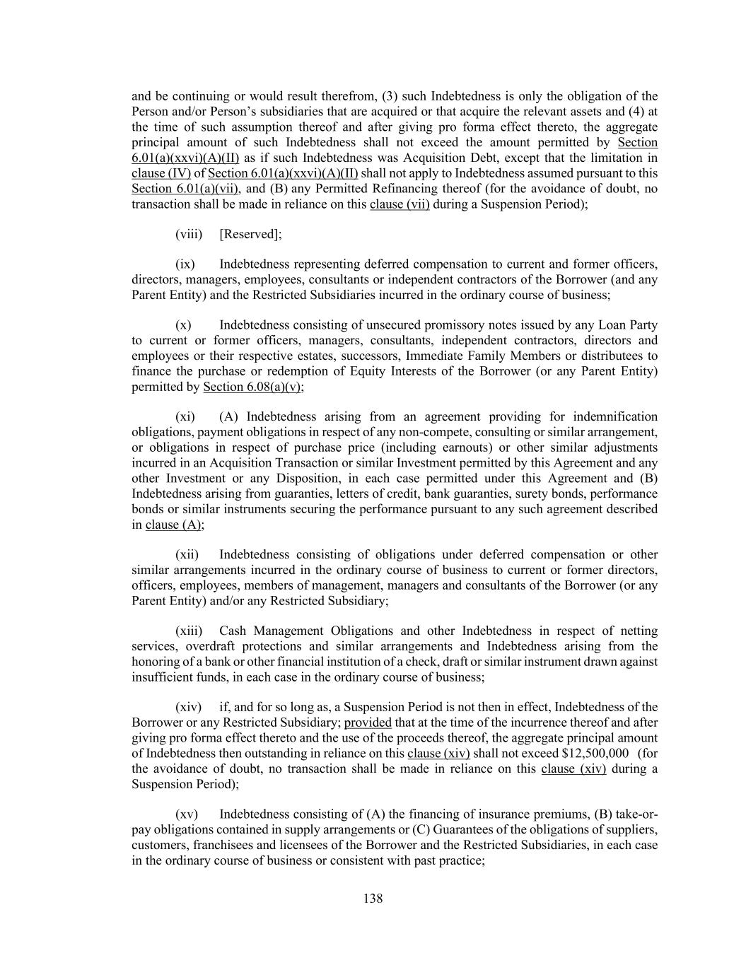 138 and be continuing or would result therefrom, (3) such Indebtedness is only the obligation of the Person and/or Person’s subsidiaries that are acquired or that acquire the relevant assets and (4) at the time of such assumption thereof and after giving pro forma effect thereto, the aggregate principal amount of such Indebtedness shall not exceed the amount permitted by Section 6.01(a)(xxvi)(A)(II) as if such Indebtedness was Acquisition Debt, except that the limitation in clause (IV) of Section 6.01(a)(xxvi)(A)(II) shall not apply to Indebtedness assumed pursuant to this Section 6.01(a)(vii), and (B) any Permitted Refinancing thereof (for the avoidance of doubt, no transaction shall be made in reliance on this clause (vii) during a Suspension Period); (viii) [Reserved]; (ix) Indebtedness representing deferred compensation to current and former officers, directors, managers, employees, consultants or independent contractors of the Borrower (and any Parent Entity) and the Restricted Subsidiaries incurred in the ordinary course of business; (x) Indebtedness consisting of unsecured promissory notes issued by any Loan Party to current or former officers, managers, consultants, independent contractors, directors and employees or their respective estates, successors, Immediate Family Members or distributees to finance the purchase or redemption of Equity Interests of the Borrower (or any Parent Entity) permitted by Section 6.08(a)(v); (xi) (A) Indebtedness arising from an agreement providing for indemnification obligations, payment obligations in respect of any non-compete, consulting or similar arrangement, or obligations in respect of purchase price (including earnouts) or other similar adjustments incurred in an Acquisition Transaction or similar Investment permitted by this Agreement and any other Investment or any Disposition, in each case permitted under this Agreement and (B) Indebtedness arising from guaranties, letters of credit, bank guaranties, surety bonds, performance bonds or similar instruments securing the performance pursuant to any such agreement described in clause (A); (xii) Indebtedness consisting of obligations under deferred compensation or other similar arrangements incurred in the ordinary course of business to current or former directors, officers, employees, members of management, managers and consultants of the Borrower (or any Parent Entity) and/or any Restricted Subsidiary; (xiii) Cash Management Obligations and other Indebtedness in respect of netting services, overdraft protections and similar arrangements and Indebtedness arising from the honoring of a bank or other financial institution of a check, draft or similar instrument drawn against insufficient funds, in each case in the ordinary course of business; (xiv) if, and for so long as, a Suspension Period is not then in effect, Indebtedness of the Borrower or any Restricted Subsidiary; provided that at the time of the incurrence thereof and after giving pro forma effect thereto and the use of the proceeds thereof, the aggregate principal amount of Indebtedness then outstanding in reliance on this clause (xiv) shall not exceed $12,500,000 (for the avoidance of doubt, no transaction shall be made in reliance on this clause (xiv) during a Suspension Period); (xv) Indebtedness consisting of (A) the financing of insurance premiums, (B) take-or- pay obligations contained in supply arrangements or (C) Guarantees of the obligations of suppliers, customers, franchisees and licensees of the Borrower and the Restricted Subsidiaries, in each case in the ordinary course of business or consistent with past practice;