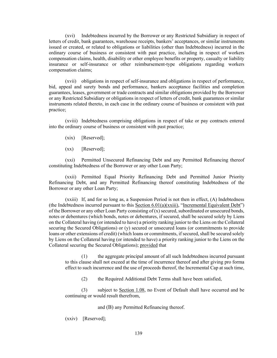 139 (xvi) Indebtedness incurred by the Borrower or any Restricted Subsidiary in respect of letters of credit, bank guarantees, warehouse receipts, bankers’ acceptances, or similar instruments issued or created, or related to obligations or liabilities (other than Indebtedness) incurred in the ordinary course of business or consistent with past practice, including in respect of workers compensation claims, health, disability or other employee benefits or property, casualty or liability insurance or self-insurance or other reimbursement-type obligations regarding workers compensation claims; (xvii) obligations in respect of self-insurance and obligations in respect of performance, bid, appeal and surety bonds and performance, bankers acceptance facilities and completion guarantees, leases, government or trade contracts and similar obligations provided by the Borrower or any Restricted Subsidiary or obligations in respect of letters of credit, bank guarantees or similar instruments related thereto, in each case in the ordinary course of business or consistent with past practice; (xviii) Indebtedness comprising obligations in respect of take or pay contracts entered into the ordinary course of business or consistent with past practice; (xix) [Reserved]; (xx) [Reserved]; (xxi) Permitted Unsecured Refinancing Debt and any Permitted Refinancing thereof constituting Indebtedness of the Borrower or any other Loan Party; (xxii) Permitted Equal Priority Refinancing Debt and Permitted Junior Priority Refinancing Debt, and any Permitted Refinancing thereof constituting Indebtedness of the Borrower or any other Loan Party; (xxiii) If, and for so long as, a Suspension Period is not then in effect, (A) Indebtedness (the Indebtedness incurred pursuant to this Section 6.01(a)(xxiii), “Incremental Equivalent Debt”) of the Borrower or any other Loan Party consisting of (x) secured, subordinated or unsecured bonds, notes or debentures (which bonds, notes or debentures, if secured, shall be secured solely by Liens on the Collateral having (or intended to have) a priority ranking junior to the Liens on the Collateral securing the Secured Obligations) or (y) secured or unsecured loans (or commitments to provide loans or other extensions of credit) (which loans or commitments, if secured, shall be secured solely by Liens on the Collateral having (or intended to have) a priority ranking junior to the Liens on the Collateral securing the Secured Obligations); provided that (1) the aggregate principal amount of all such Indebtedness incurred pursuant to this clause shall not exceed at the time of incurrence thereof and after giving pro forma effect to such incurrence and the use of proceeds thereof, the Incremental Cap at such time, (2) the Required Additional Debt Terms shall have been satisfied, (3) subject to Section 1.08, no Event of Default shall have occurred and be continuing or would result therefrom, and (B) any Permitted Refinancing thereof. (xxiv) [Reserved];