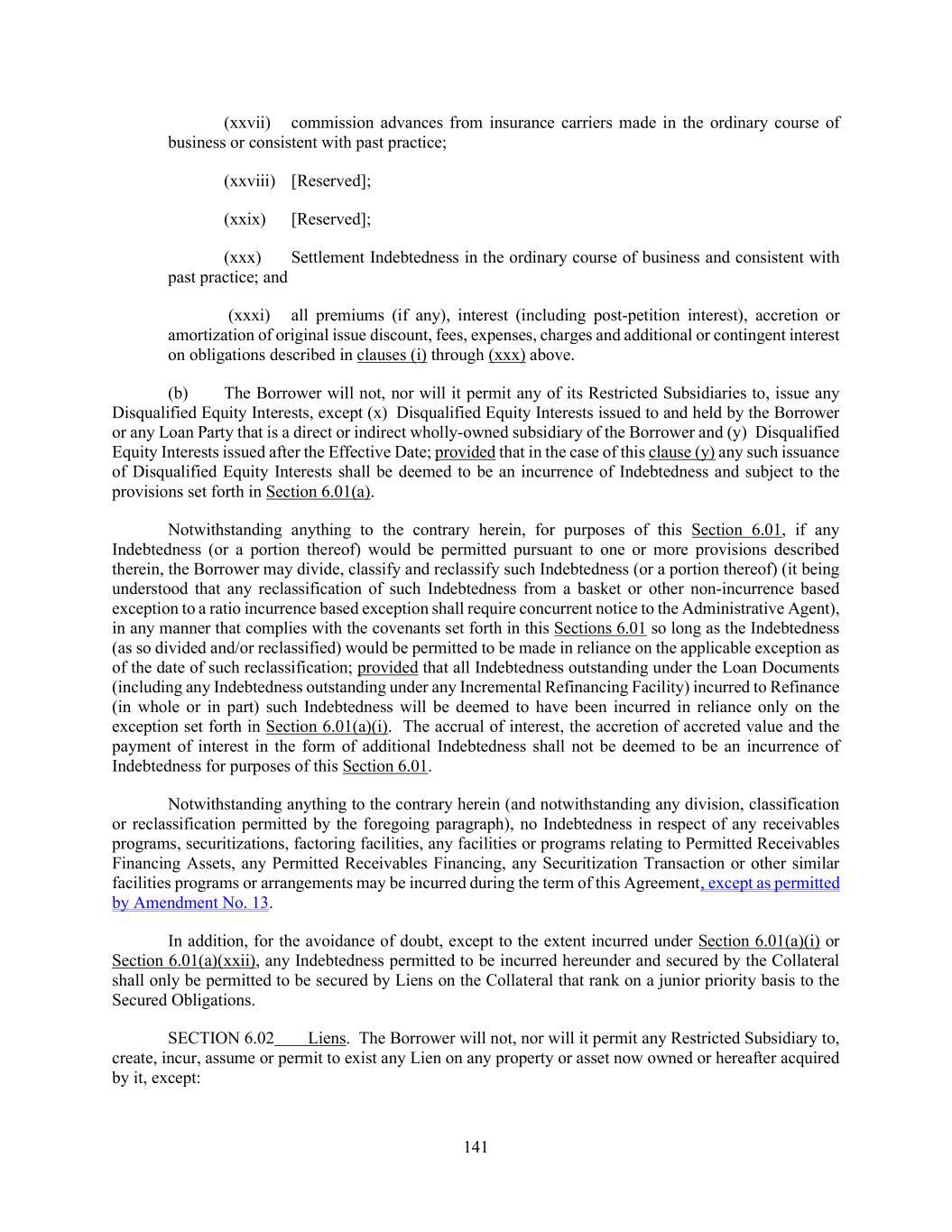 141 (xxvii) commission advances from insurance carriers made in the ordinary course of business or consistent with past practice; (xxviii) [Reserved]; (xxix) [Reserved]; (xxx) Settlement Indebtedness in the ordinary course of business and consistent with past practice; and (xxxi) all premiums (if any), interest (including post-petition interest), accretion or amortization of original issue discount, fees, expenses, charges and additional or contingent interest on obligations described in clauses (i) through (xxx) above. (b) The Borrower will not, nor will it permit any of its Restricted Subsidiaries to, issue any Disqualified Equity Interests, except (x) Disqualified Equity Interests issued to and held by the Borrower or any Loan Party that is a direct or indirect wholly-owned subsidiary of the Borrower and (y) Disqualified Equity Interests issued after the Effective Date; provided that in the case of this clause (y) any such issuance of Disqualified Equity Interests shall be deemed to be an incurrence of Indebtedness and subject to the provisions set forth in Section 6.01(a). Notwithstanding anything to the contrary herein, for purposes of this Section 6.01, if any Indebtedness (or a portion thereof) would be permitted pursuant to one or more provisions described therein, the Borrower may divide, classify and reclassify such Indebtedness (or a portion thereof) (it being understood that any reclassification of such Indebtedness from a basket or other non-incurrence based exception to a ratio incurrence based exception shall require concurrent notice to the Administrative Agent), in any manner that complies with the covenants set forth in this Sections 6.01 so long as the Indebtedness (as so divided and/or reclassified) would be permitted to be made in reliance on the applicable exception as of the date of such reclassification; provided that all Indebtedness outstanding under the Loan Documents (including any Indebtedness outstanding under any Incremental Refinancing Facility) incurred to Refinance (in whole or in part) such Indebtedness will be deemed to have been incurred in reliance only on the exception set forth in Section 6.01(a)(i). The accrual of interest, the accretion of accreted value and the payment of interest in the form of additional Indebtedness shall not be deemed to be an incurrence of Indebtedness for purposes of this Section 6.01. Notwithstanding anything to the contrary herein (and notwithstanding any division, classification or reclassification permitted by the foregoing paragraph), no Indebtedness in respect of any receivables programs, securitizations, factoring facilities, any facilities or programs relating to Permitted Receivables Financing Assets, any Permitted Receivables Financing, any Securitization Transaction or other similar facilities programs or arrangements may be incurred during the term of this Agreement, except as permitted by Amendment No. 13. In addition, for the avoidance of doubt, except to the extent incurred under Section 6.01(a)(i) or Section 6.01(a)(xxii), any Indebtedness permitted to be incurred hereunder and secured by the Collateral shall only be permitted to be secured by Liens on the Collateral that rank on a junior priority basis to the Secured Obligations. SECTION 6.02 Liens. The Borrower will not, nor will it permit any Restricted Subsidiary to, create, incur, assume or permit to exist any Lien on any property or asset now owned or hereafter acquired by it, except: