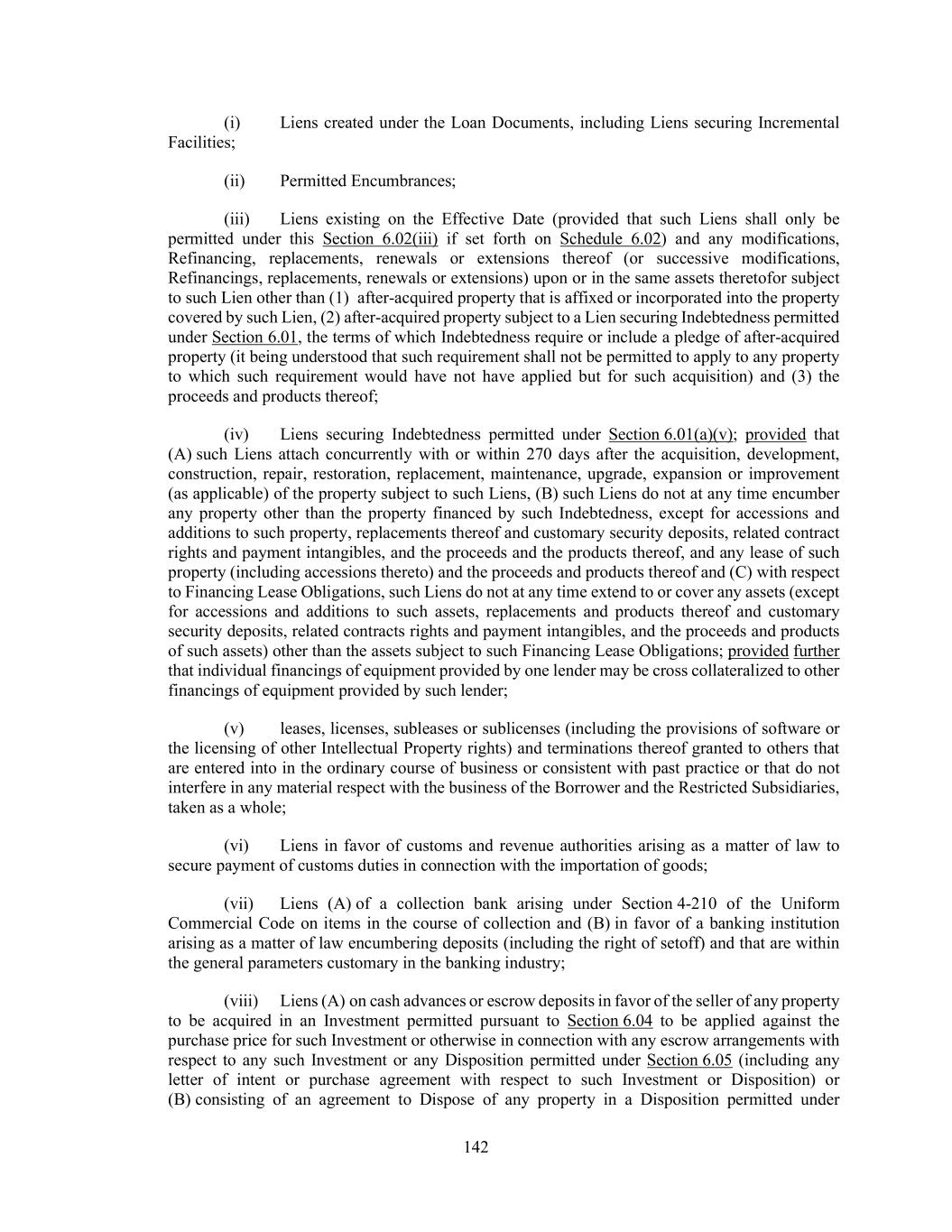 142 (i) Liens created under the Loan Documents, including Liens securing Incremental Facilities; (ii) Permitted Encumbrances; (iii) Liens existing on the Effective Date (provided that such Liens shall only be permitted under this Section 6.02(iii) if set forth on Schedule 6.02) and any modifications, Refinancing, replacements, renewals or extensions thereof (or successive modifications, Refinancings, replacements, renewals or extensions) upon or in the same assets theretofor subject to such Lien other than (1) after-acquired property that is affixed or incorporated into the property covered by such Lien, (2) after-acquired property subject to a Lien securing Indebtedness permitted under Section 6.01, the terms of which Indebtedness require or include a pledge of after-acquired property (it being understood that such requirement shall not be permitted to apply to any property to which such requirement would have not have applied but for such acquisition) and (3) the proceeds and products thereof; (iv) Liens securing Indebtedness permitted under Section 6.01(a)(v); provided that (A) such Liens attach concurrently with or within 270 days after the acquisition, development, construction, repair, restoration, replacement, maintenance, upgrade, expansion or improvement (as applicable) of the property subject to such Liens, (B) such Liens do not at any time encumber any property other than the property financed by such Indebtedness, except for accessions and additions to such property, replacements thereof and customary security deposits, related contract rights and payment intangibles, and the proceeds and the products thereof, and any lease of such property (including accessions thereto) and the proceeds and products thereof and (C) with respect to Financing Lease Obligations, such Liens do not at any time extend to or cover any assets (except for accessions and additions to such assets, replacements and products thereof and customary security deposits, related contracts rights and payment intangibles, and the proceeds and products of such assets) other than the assets subject to such Financing Lease Obligations; provided further that individual financings of equipment provided by one lender may be cross collateralized to other financings of equipment provided by such lender; (v) leases, licenses, subleases or sublicenses (including the provisions of software or the licensing of other Intellectual Property rights) and terminations thereof granted to others that are entered into in the ordinary course of business or consistent with past practice or that do not interfere in any material respect with the business of the Borrower and the Restricted Subsidiaries, taken as a whole; (vi) Liens in favor of customs and revenue authorities arising as a matter of law to secure payment of customs duties in connection with the importation of goods; (vii) Liens (A) of a collection bank arising under Section 4-210 of the Uniform Commercial Code on items in the course of collection and (B) in favor of a banking institution arising as a matter of law encumbering deposits (including the right of setoff) and that are within the general parameters customary in the banking industry; (viii) Liens (A) on cash advances or escrow deposits in favor of the seller of any property to be acquired in an Investment permitted pursuant to Section 6.04 to be applied against the purchase price for such Investment or otherwise in connection with any escrow arrangements with respect to any such Investment or any Disposition permitted under Section 6.05 (including any letter of intent or purchase agreement with respect to such Investment or Disposition) or (B) consisting of an agreement to Dispose of any property in a Disposition permitted under