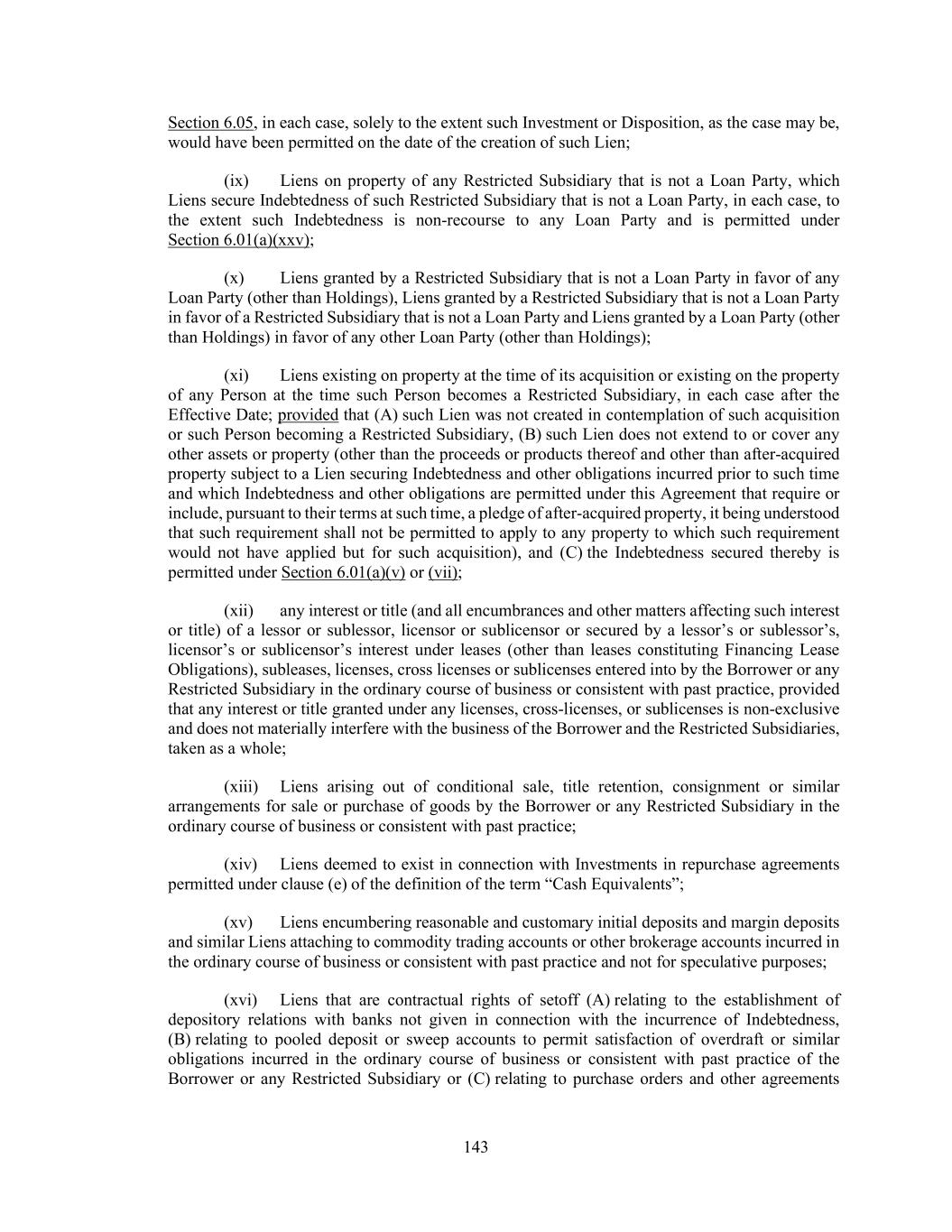 143 Section 6.05, in each case, solely to the extent such Investment or Disposition, as the case may be, would have been permitted on the date of the creation of such Lien; (ix) Liens on property of any Restricted Subsidiary that is not a Loan Party, which Liens secure Indebtedness of such Restricted Subsidiary that is not a Loan Party, in each case, to the extent such Indebtedness is non-recourse to any Loan Party and is permitted under Section 6.01(a)(xxv); (x) Liens granted by a Restricted Subsidiary that is not a Loan Party in favor of any Loan Party (other than Holdings), Liens granted by a Restricted Subsidiary that is not a Loan Party in favor of a Restricted Subsidiary that is not a Loan Party and Liens granted by a Loan Party (other than Holdings) in favor of any other Loan Party (other than Holdings); (xi) Liens existing on property at the time of its acquisition or existing on the property of any Person at the time such Person becomes a Restricted Subsidiary, in each case after the Effective Date; provided that (A) such Lien was not created in contemplation of such acquisition or such Person becoming a Restricted Subsidiary, (B) such Lien does not extend to or cover any other assets or property (other than the proceeds or products thereof and other than after-acquired property subject to a Lien securing Indebtedness and other obligations incurred prior to such time and which Indebtedness and other obligations are permitted under this Agreement that require or include, pursuant to their terms at such time, a pledge of after-acquired property, it being understood that such requirement shall not be permitted to apply to any property to which such requirement would not have applied but for such acquisition), and (C) the Indebtedness secured thereby is permitted under Section 6.01(a)(v) or (vii); (xii) any interest or title (and all encumbrances and other matters affecting such interest or title) of a lessor or sublessor, licensor or sublicensor or secured by a lessor’s or sublessor’s, licensor’s or sublicensor’s interest under leases (other than leases constituting Financing Lease Obligations), subleases, licenses, cross licenses or sublicenses entered into by the Borrower or any Restricted Subsidiary in the ordinary course of business or consistent with past practice, provided that any interest or title granted under any licenses, cross-licenses, or sublicenses is non-exclusive and does not materially interfere with the business of the Borrower and the Restricted Subsidiaries, taken as a whole; (xiii) Liens arising out of conditional sale, title retention, consignment or similar arrangements for sale or purchase of goods by the Borrower or any Restricted Subsidiary in the ordinary course of business or consistent with past practice; (xiv) Liens deemed to exist in connection with Investments in repurchase agreements permitted under clause (e) of the definition of the term “Cash Equivalents”; (xv) Liens encumbering reasonable and customary initial deposits and margin deposits and similar Liens attaching to commodity trading accounts or other brokerage accounts incurred in the ordinary course of business or consistent with past practice and not for speculative purposes; (xvi) Liens that are contractual rights of setoff (A) relating to the establishment of depository relations with banks not given in connection with the incurrence of Indebtedness, (B) relating to pooled deposit or sweep accounts to permit satisfaction of overdraft or similar obligations incurred in the ordinary course of business or consistent with past practice of the Borrower or any Restricted Subsidiary or (C) relating to purchase orders and other agreements