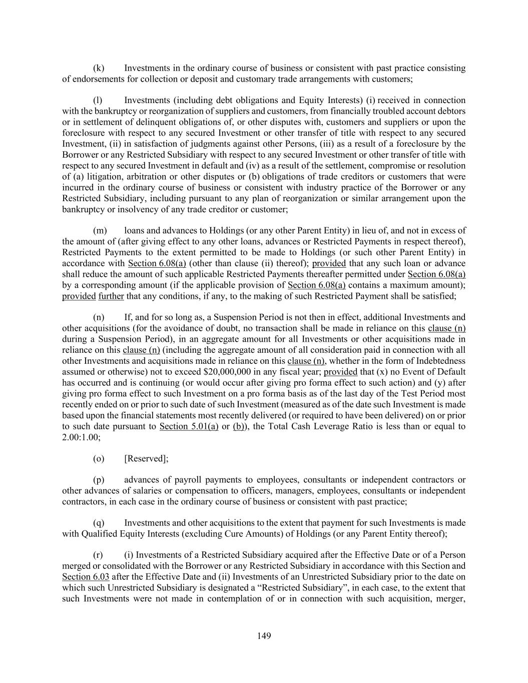 149 (k) Investments in the ordinary course of business or consistent with past practice consisting of endorsements for collection or deposit and customary trade arrangements with customers; (l) Investments (including debt obligations and Equity Interests) (i) received in connection with the bankruptcy or reorganization of suppliers and customers, from financially troubled account debtors or in settlement of delinquent obligations of, or other disputes with, customers and suppliers or upon the foreclosure with respect to any secured Investment or other transfer of title with respect to any secured Investment, (ii) in satisfaction of judgments against other Persons, (iii) as a result of a foreclosure by the Borrower or any Restricted Subsidiary with respect to any secured Investment or other transfer of title with respect to any secured Investment in default and (iv) as a result of the settlement, compromise or resolution of (a) litigation, arbitration or other disputes or (b) obligations of trade creditors or customers that were incurred in the ordinary course of business or consistent with industry practice of the Borrower or any Restricted Subsidiary, including pursuant to any plan of reorganization or similar arrangement upon the bankruptcy or insolvency of any trade creditor or customer; (m) loans and advances to Holdings (or any other Parent Entity) in lieu of, and not in excess of the amount of (after giving effect to any other loans, advances or Restricted Payments in respect thereof), Restricted Payments to the extent permitted to be made to Holdings (or such other Parent Entity) in accordance with Section 6.08(a) (other than clause (ii) thereof); provided that any such loan or advance shall reduce the amount of such applicable Restricted Payments thereafter permitted under Section 6.08(a) by a corresponding amount (if the applicable provision of Section 6.08(a) contains a maximum amount); provided further that any conditions, if any, to the making of such Restricted Payment shall be satisfied; (n) If, and for so long as, a Suspension Period is not then in effect, additional Investments and other acquisitions (for the avoidance of doubt, no transaction shall be made in reliance on this clause (n) during a Suspension Period), in an aggregate amount for all Investments or other acquisitions made in reliance on this clause (n) (including the aggregate amount of all consideration paid in connection with all other Investments and acquisitions made in reliance on this clause (n), whether in the form of Indebtedness assumed or otherwise) not to exceed $20,000,000 in any fiscal year; provided that (x) no Event of Default has occurred and is continuing (or would occur after giving pro forma effect to such action) and (y) after giving pro forma effect to such Investment on a pro forma basis as of the last day of the Test Period most recently ended on or prior to such date of such Investment (measured as of the date such Investment is made based upon the financial statements most recently delivered (or required to have been delivered) on or prior to such date pursuant to Section 5.01(a) or (b)), the Total Cash Leverage Ratio is less than or equal to 2.00:1.00; (o) [Reserved]; (p) advances of payroll payments to employees, consultants or independent contractors or other advances of salaries or compensation to officers, managers, employees, consultants or independent contractors, in each case in the ordinary course of business or consistent with past practice; (q) Investments and other acquisitions to the extent that payment for such Investments is made with Qualified Equity Interests (excluding Cure Amounts) of Holdings (or any Parent Entity thereof); (r) (i) Investments of a Restricted Subsidiary acquired after the Effective Date or of a Person merged or consolidated with the Borrower or any Restricted Subsidiary in accordance with this Section and Section 6.03 after the Effective Date and (ii) Investments of an Unrestricted Subsidiary prior to the date on which such Unrestricted Subsidiary is designated a “Restricted Subsidiary”, in each case, to the extent that such Investments were not made in contemplation of or in connection with such acquisition, merger,