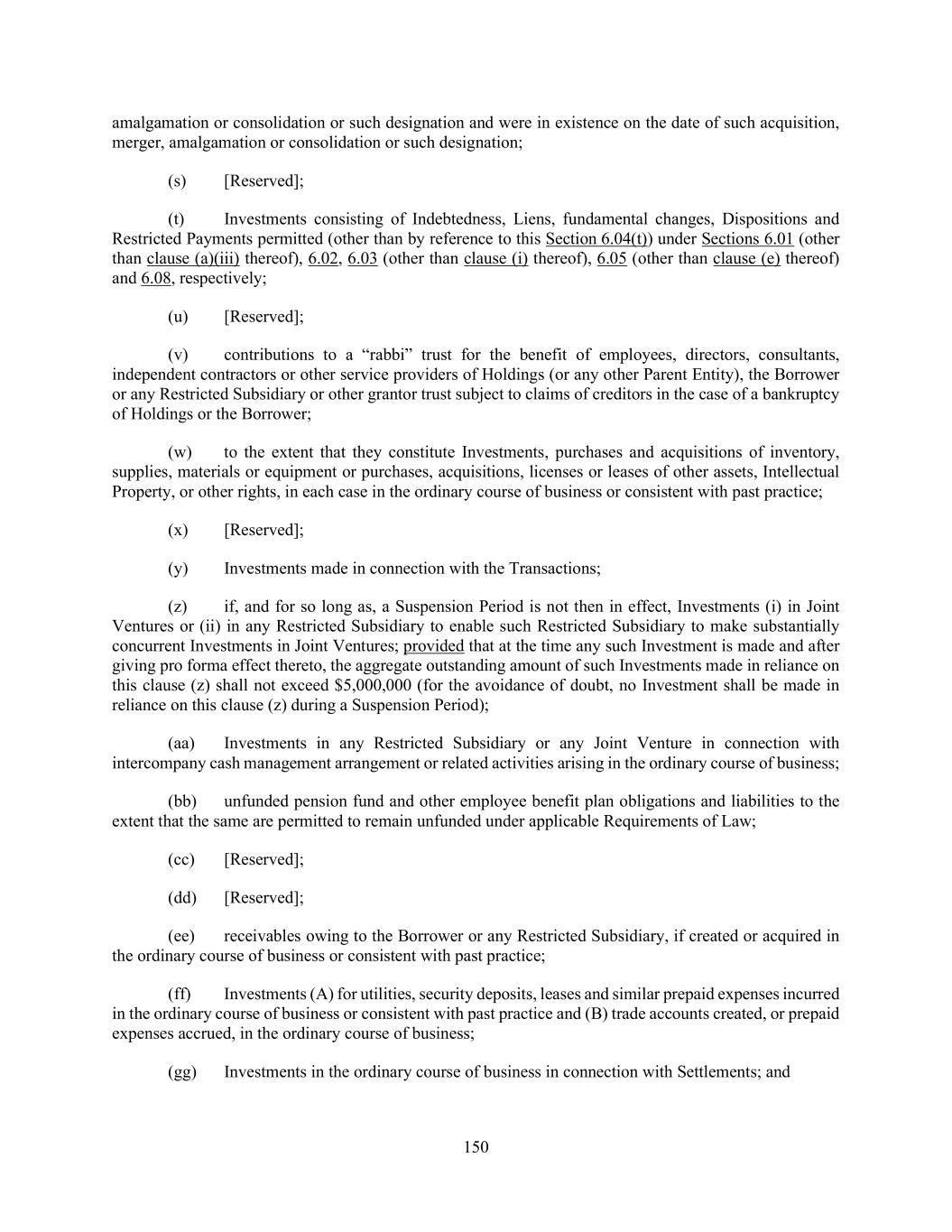 150 amalgamation or consolidation or such designation and were in existence on the date of such acquisition, merger, amalgamation or consolidation or such designation; (s) [Reserved]; (t) Investments consisting of Indebtedness, Liens, fundamental changes, Dispositions and Restricted Payments permitted (other than by reference to this Section 6.04(t)) under Sections 6.01 (other than clause (a)(iii) thereof), 6.02, 6.03 (other than clause (i) thereof), 6.05 (other than clause (e) thereof) and 6.08, respectively; (u) [Reserved]; (v) contributions to a “rabbi” trust for the benefit of employees, directors, consultants, independent contractors or other service providers of Holdings (or any other Parent Entity), the Borrower or any Restricted Subsidiary or other grantor trust subject to claims of creditors in the case of a bankruptcy of Holdings or the Borrower; (w) to the extent that they constitute Investments, purchases and acquisitions of inventory, supplies, materials or equipment or purchases, acquisitions, licenses or leases of other assets, Intellectual Property, or other rights, in each case in the ordinary course of business or consistent with past practice; (x) [Reserved]; (y) Investments made in connection with the Transactions; (z) if, and for so long as, a Suspension Period is not then in effect, Investments (i) in Joint Ventures or (ii) in any Restricted Subsidiary to enable such Restricted Subsidiary to make substantially concurrent Investments in Joint Ventures; provided that at the time any such Investment is made and after giving pro forma effect thereto, the aggregate outstanding amount of such Investments made in reliance on this clause (z) shall not exceed $5,000,000 (for the avoidance of doubt, no Investment shall be made in reliance on this clause (z) during a Suspension Period); (aa) Investments in any Restricted Subsidiary or any Joint Venture in connection with intercompany cash management arrangement or related activities arising in the ordinary course of business; (bb) unfunded pension fund and other employee benefit plan obligations and liabilities to the extent that the same are permitted to remain unfunded under applicable Requirements of Law; (cc) [Reserved]; (dd) [Reserved]; (ee) receivables owing to the Borrower or any Restricted Subsidiary, if created or acquired in the ordinary course of business or consistent with past practice; (ff) Investments (A) for utilities, security deposits, leases and similar prepaid expenses incurred in the ordinary course of business or consistent with past practice and (B) trade accounts created, or prepaid expenses accrued, in the ordinary course of business; (gg) Investments in the ordinary course of business in connection with Settlements; and