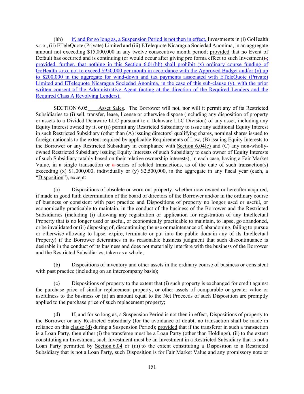 151 (hh) if, and for so long as, a Suspension Period is not then in effect, Investments in (i) GoHealth s.r.o., (ii) ETeleQuote (Private) Limited and (iii) ETelequote Nicaragua Sociedad Anonima, in an aggregate amount not exceeding $15,000,000 in any twelve consecutive month period; provided that no Event of Default has occurred and is continuing (or would occur after giving pro forma effect to such Investment).; provided, further, that nothing in this Section 6.01(hh) shall prohibit (x) ordinary course funding of GoHealth s.r.o. not to exceed $950,000 per month in accordance with the Approved Budget and/or (y) up to $200,000 in the aggregate for wind-down and tax payments associated with ETeleQuote (Private) Limited and ETelequote Nicaragua Sociedad Anonima, in the case of this sub-clause (y), with the prior written consent of the Administrative Agent (acting at the direction of the Required Lenders and the Required Class A Revolving Lenders). SECTION 6.05 Asset Sales. The Borrower will not, nor will it permit any of its Restricted Subsidiaries to (i) sell, transfer, lease, license or otherwise dispose (including any disposition of property or assets to a Divided Delaware LLC pursuant to a Delaware LLC Division) of any asset, including any Equity Interest owned by it, or (ii) permit any Restricted Subsidiary to issue any additional Equity Interest in such Restricted Subsidiary (other than (A) issuing directors’ qualifying shares, nominal shares issued to foreign nationals to the extent required by applicable Requirements of Law, (B) issuing Equity Interests to the Borrower or any Restricted Subsidiary in compliance with Section 6.04(c) and (C) any non-wholly- owned Restricted Subsidiary issuing Equity Interests of such Subsidiary to each owner of Equity Interests of such Subsidiary ratably based on their relative ownership interests), in each case, having a Fair Market Value, in a single transaction or a series of related transactions, as of the date of such transaction(s) exceeding (x) $1,000,000, individually or (y) $2,500,000, in the aggregate in any fiscal year (each, a “Disposition”), except: (a) Dispositions of obsolete or worn out property, whether now owned or hereafter acquired, if made in good faith determination of the board of directors of the Borrower and/or in the ordinary course of business or consistent with past practice and Dispositions of property no longer used or useful, or economically practicable to maintain, in the conduct of the business of the Borrower and the Restricted Subsidiaries (including (i) allowing any registration or application for registration of any Intellectual Property that is no longer used or useful, or economically practicable to maintain, to lapse, go abandoned, or be invalidated or (ii) disposing of, discontinuing the use or maintenance of, abandoning, failing to pursue or otherwise allowing to lapse, expire, terminate or put into the public domain any of its Intellectual Property) if the Borrower determines in its reasonable business judgment that such discontinuance is desirable in the conduct of its business and does not materially interfere with the business of the Borrower and the Restricted Subsidiaries, taken as a whole; (b) Dispositions of inventory and other assets in the ordinary course of business or consistent with past practice (including on an intercompany basis); (c) Dispositions of property to the extent that (i) such property is exchanged for credit against the purchase price of similar replacement property, or other assets of comparable or greater value or usefulness to the business or (ii) an amount equal to the Net Proceeds of such Disposition are promptly applied to the purchase price of such replacement property; (d) If, and for so long as, a Suspension Period is not then in effect, Dispositions of property to the Borrower or any Restricted Subsidiary (for the avoidance of doubt, no transaction shall be made in reliance on this clause (d) during a Suspension Period); provided that if the transferor in such a transaction is a Loan Party, then either (i) the transferee must be a Loan Party (other than Holdings), (ii) to the extent constituting an Investment, such Investment must be an Investment in a Restricted Subsidiary that is not a Loan Party permitted by Section 6.04 or (iii) to the extent constituting a Disposition to a Restricted Subsidiary that is not a Loan Party, such Disposition is for Fair Market Value and any promissory note or