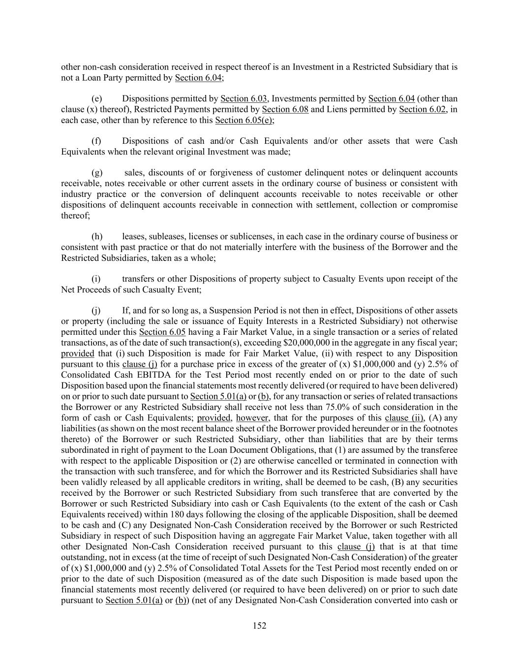 152 other non-cash consideration received in respect thereof is an Investment in a Restricted Subsidiary that is not a Loan Party permitted by Section 6.04; (e) Dispositions permitted by Section 6.03, Investments permitted by Section 6.04 (other than clause (x) thereof), Restricted Payments permitted by Section 6.08 and Liens permitted by Section 6.02, in each case, other than by reference to this Section 6.05(e); (f) Dispositions of cash and/or Cash Equivalents and/or other assets that were Cash Equivalents when the relevant original Investment was made; (g) sales, discounts of or forgiveness of customer delinquent notes or delinquent accounts receivable, notes receivable or other current assets in the ordinary course of business or consistent with industry practice or the conversion of delinquent accounts receivable to notes receivable or other dispositions of delinquent accounts receivable in connection with settlement, collection or compromise thereof; (h) leases, subleases, licenses or sublicenses, in each case in the ordinary course of business or consistent with past practice or that do not materially interfere with the business of the Borrower and the Restricted Subsidiaries, taken as a whole; (i) transfers or other Dispositions of property subject to Casualty Events upon receipt of the Net Proceeds of such Casualty Event; (j) If, and for so long as, a Suspension Period is not then in effect, Dispositions of other assets or property (including the sale or issuance of Equity Interests in a Restricted Subsidiary) not otherwise permitted under this Section 6.05 having a Fair Market Value, in a single transaction or a series of related transactions, as of the date of such transaction(s), exceeding $20,000,000 in the aggregate in any fiscal year; provided that (i) such Disposition is made for Fair Market Value, (ii) with respect to any Disposition pursuant to this clause (j) for a purchase price in excess of the greater of (x) $1,000,000 and (y) 2.5% of Consolidated Cash EBITDA for the Test Period most recently ended on or prior to the date of such Disposition based upon the financial statements most recently delivered (or required to have been delivered) on or prior to such date pursuant to Section 5.01(a) or (b), for any transaction or series of related transactions the Borrower or any Restricted Subsidiary shall receive not less than 75.0% of such consideration in the form of cash or Cash Equivalents; provided, however, that for the purposes of this clause (ii), (A) any liabilities (as shown on the most recent balance sheet of the Borrower provided hereunder or in the footnotes thereto) of the Borrower or such Restricted Subsidiary, other than liabilities that are by their terms subordinated in right of payment to the Loan Document Obligations, that (1) are assumed by the transferee with respect to the applicable Disposition or (2) are otherwise cancelled or terminated in connection with the transaction with such transferee, and for which the Borrower and its Restricted Subsidiaries shall have been validly released by all applicable creditors in writing, shall be deemed to be cash, (B) any securities received by the Borrower or such Restricted Subsidiary from such transferee that are converted by the Borrower or such Restricted Subsidiary into cash or Cash Equivalents (to the extent of the cash or Cash Equivalents received) within 180 days following the closing of the applicable Disposition, shall be deemed to be cash and (C) any Designated Non-Cash Consideration received by the Borrower or such Restricted Subsidiary in respect of such Disposition having an aggregate Fair Market Value, taken together with all other Designated Non-Cash Consideration received pursuant to this clause (j) that is at that time outstanding, not in excess (at the time of receipt of such Designated Non-Cash Consideration) of the greater of (x) $1,000,000 and (y) 2.5% of Consolidated Total Assets for the Test Period most recently ended on or prior to the date of such Disposition (measured as of the date such Disposition is made based upon the financial statements most recently delivered (or required to have been delivered) on or prior to such date pursuant to Section 5.01(a) or (b)) (net of any Designated Non-Cash Consideration converted into cash or