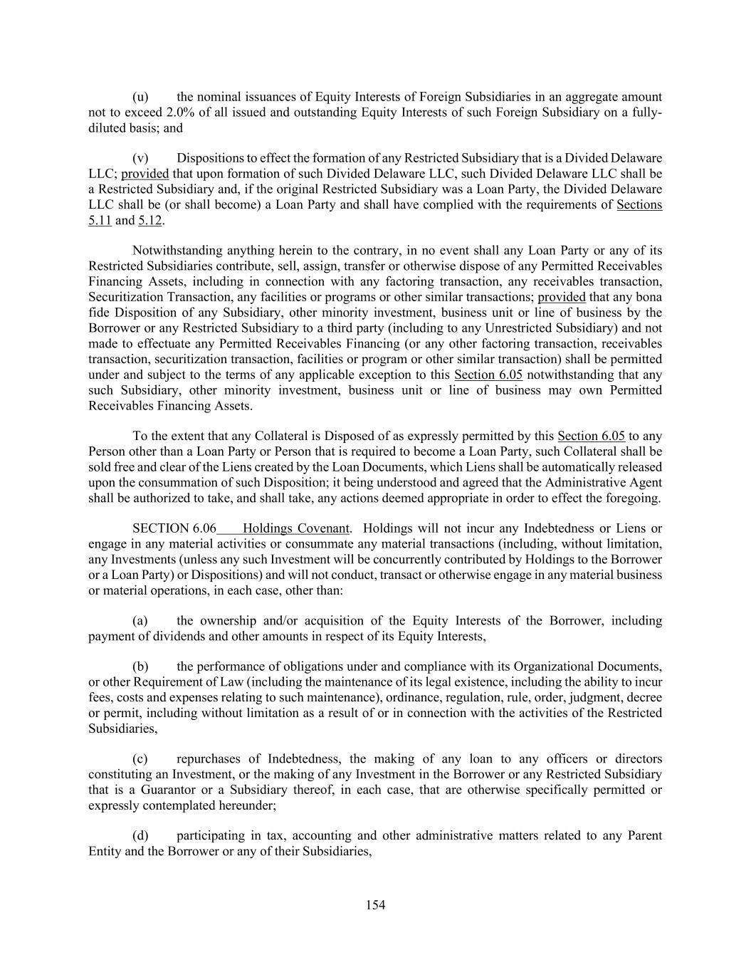 154 (u) the nominal issuances of Equity Interests of Foreign Subsidiaries in an aggregate amount not to exceed 2.0% of all issued and outstanding Equity Interests of such Foreign Subsidiary on a fully- diluted basis; and (v) Dispositions to effect the formation of any Restricted Subsidiary that is a Divided Delaware LLC; provided that upon formation of such Divided Delaware LLC, such Divided Delaware LLC shall be a Restricted Subsidiary and, if the original Restricted Subsidiary was a Loan Party, the Divided Delaware LLC shall be (or shall become) a Loan Party and shall have complied with the requirements of Sections 5.11 and 5.12. Notwithstanding anything herein to the contrary, in no event shall any Loan Party or any of its Restricted Subsidiaries contribute, sell, assign, transfer or otherwise dispose of any Permitted Receivables Financing Assets, including in connection with any factoring transaction, any receivables transaction, Securitization Transaction, any facilities or programs or other similar transactions; provided that any bona fide Disposition of any Subsidiary, other minority investment, business unit or line of business by the Borrower or any Restricted Subsidiary to a third party (including to any Unrestricted Subsidiary) and not made to effectuate any Permitted Receivables Financing (or any other factoring transaction, receivables transaction, securitization transaction, facilities or program or other similar transaction) shall be permitted under and subject to the terms of any applicable exception to this Section 6.05 notwithstanding that any such Subsidiary, other minority investment, business unit or line of business may own Permitted Receivables Financing Assets. To the extent that any Collateral is Disposed of as expressly permitted by this Section 6.05 to any Person other than a Loan Party or Person that is required to become a Loan Party, such Collateral shall be sold free and clear of the Liens created by the Loan Documents, which Liens shall be automatically released upon the consummation of such Disposition; it being understood and agreed that the Administrative Agent shall be authorized to take, and shall take, any actions deemed appropriate in order to effect the foregoing. SECTION 6.06 Holdings Covenant. Holdings will not incur any Indebtedness or Liens or engage in any material activities or consummate any material transactions (including, without limitation, any Investments (unless any such Investment will be concurrently contributed by Holdings to the Borrower or a Loan Party) or Dispositions) and will not conduct, transact or otherwise engage in any material business or material operations, in each case, other than: (a) the ownership and/or acquisition of the Equity Interests of the Borrower, including payment of dividends and other amounts in respect of its Equity Interests, (b) the performance of obligations under and compliance with its Organizational Documents, or other Requirement of Law (including the maintenance of its legal existence, including the ability to incur fees, costs and expenses relating to such maintenance), ordinance, regulation, rule, order, judgment, decree or permit, including without limitation as a result of or in connection with the activities of the Restricted Subsidiaries, (c) repurchases of Indebtedness, the making of any loan to any officers or directors constituting an Investment, or the making of any Investment in the Borrower or any Restricted Subsidiary that is a Guarantor or a Subsidiary thereof, in each case, that are otherwise specifically permitted or expressly contemplated hereunder; (d) participating in tax, accounting and other administrative matters related to any Parent Entity and the Borrower or any of their Subsidiaries,