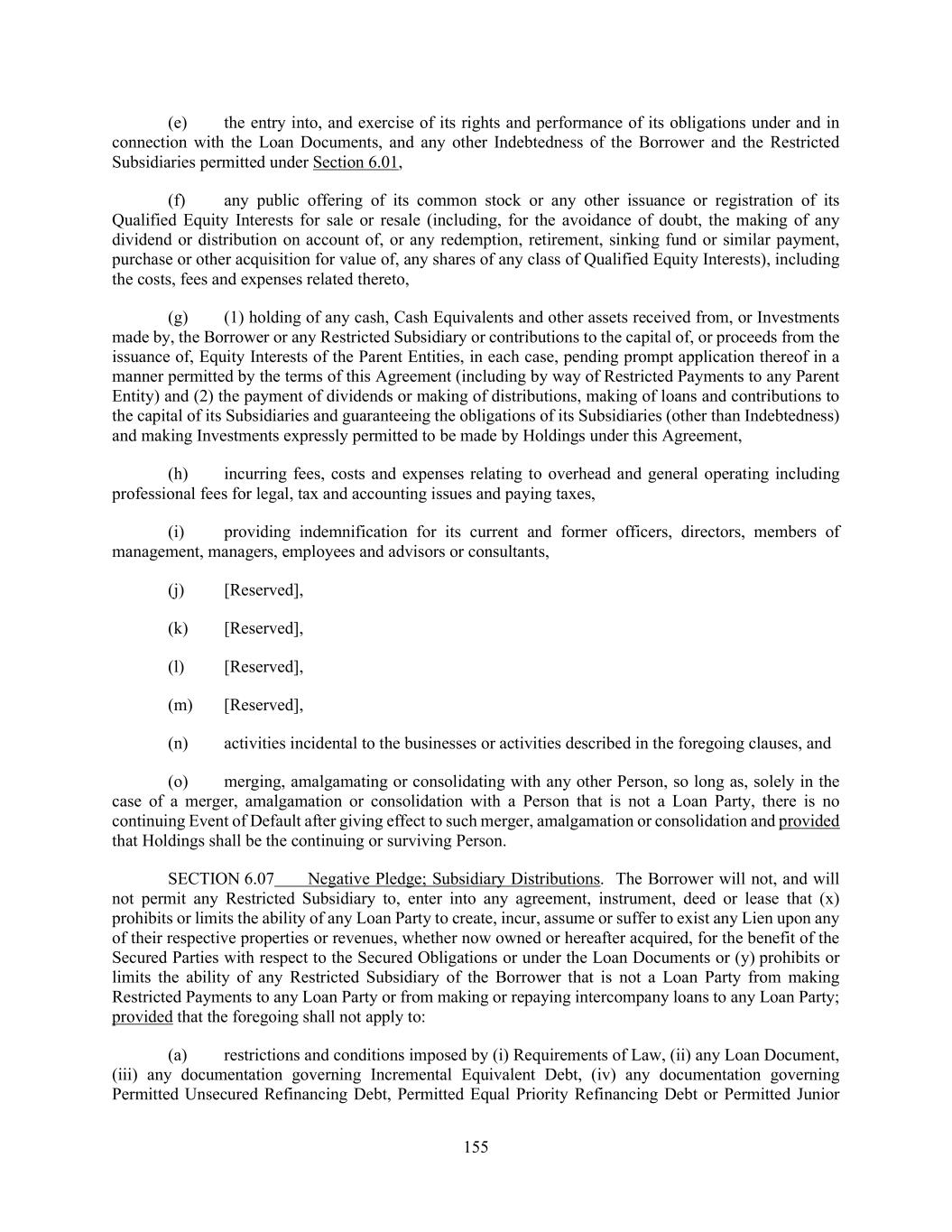 155 (e) the entry into, and exercise of its rights and performance of its obligations under and in connection with the Loan Documents, and any other Indebtedness of the Borrower and the Restricted Subsidiaries permitted under Section 6.01, (f) any public offering of its common stock or any other issuance or registration of its Qualified Equity Interests for sale or resale (including, for the avoidance of doubt, the making of any dividend or distribution on account of, or any redemption, retirement, sinking fund or similar payment, purchase or other acquisition for value of, any shares of any class of Qualified Equity Interests), including the costs, fees and expenses related thereto, (g) (1) holding of any cash, Cash Equivalents and other assets received from, or Investments made by, the Borrower or any Restricted Subsidiary or contributions to the capital of, or proceeds from the issuance of, Equity Interests of the Parent Entities, in each case, pending prompt application thereof in a manner permitted by the terms of this Agreement (including by way of Restricted Payments to any Parent Entity) and (2) the payment of dividends or making of distributions, making of loans and contributions to the capital of its Subsidiaries and guaranteeing the obligations of its Subsidiaries (other than Indebtedness) and making Investments expressly permitted to be made by Holdings under this Agreement, (h) incurring fees, costs and expenses relating to overhead and general operating including professional fees for legal, tax and accounting issues and paying taxes, (i) providing indemnification for its current and former officers, directors, members of management, managers, employees and advisors or consultants, (j) [Reserved], (k) [Reserved], (l) [Reserved], (m) [Reserved], (n) activities incidental to the businesses or activities described in the foregoing clauses, and (o) merging, amalgamating or consolidating with any other Person, so long as, solely in the case of a merger, amalgamation or consolidation with a Person that is not a Loan Party, there is no continuing Event of Default after giving effect to such merger, amalgamation or consolidation and provided that Holdings shall be the continuing or surviving Person. SECTION 6.07 Negative Pledge; Subsidiary Distributions. The Borrower will not, and will not permit any Restricted Subsidiary to, enter into any agreement, instrument, deed or lease that (x) prohibits or limits the ability of any Loan Party to create, incur, assume or suffer to exist any Lien upon any of their respective properties or revenues, whether now owned or hereafter acquired, for the benefit of the Secured Parties with respect to the Secured Obligations or under the Loan Documents or (y) prohibits or limits the ability of any Restricted Subsidiary of the Borrower that is not a Loan Party from making Restricted Payments to any Loan Party or from making or repaying intercompany loans to any Loan Party; provided that the foregoing shall not apply to: (a) restrictions and conditions imposed by (i) Requirements of Law, (ii) any Loan Document, (iii) any documentation governing Incremental Equivalent Debt, (iv) any documentation governing Permitted Unsecured Refinancing Debt, Permitted Equal Priority Refinancing Debt or Permitted Junior