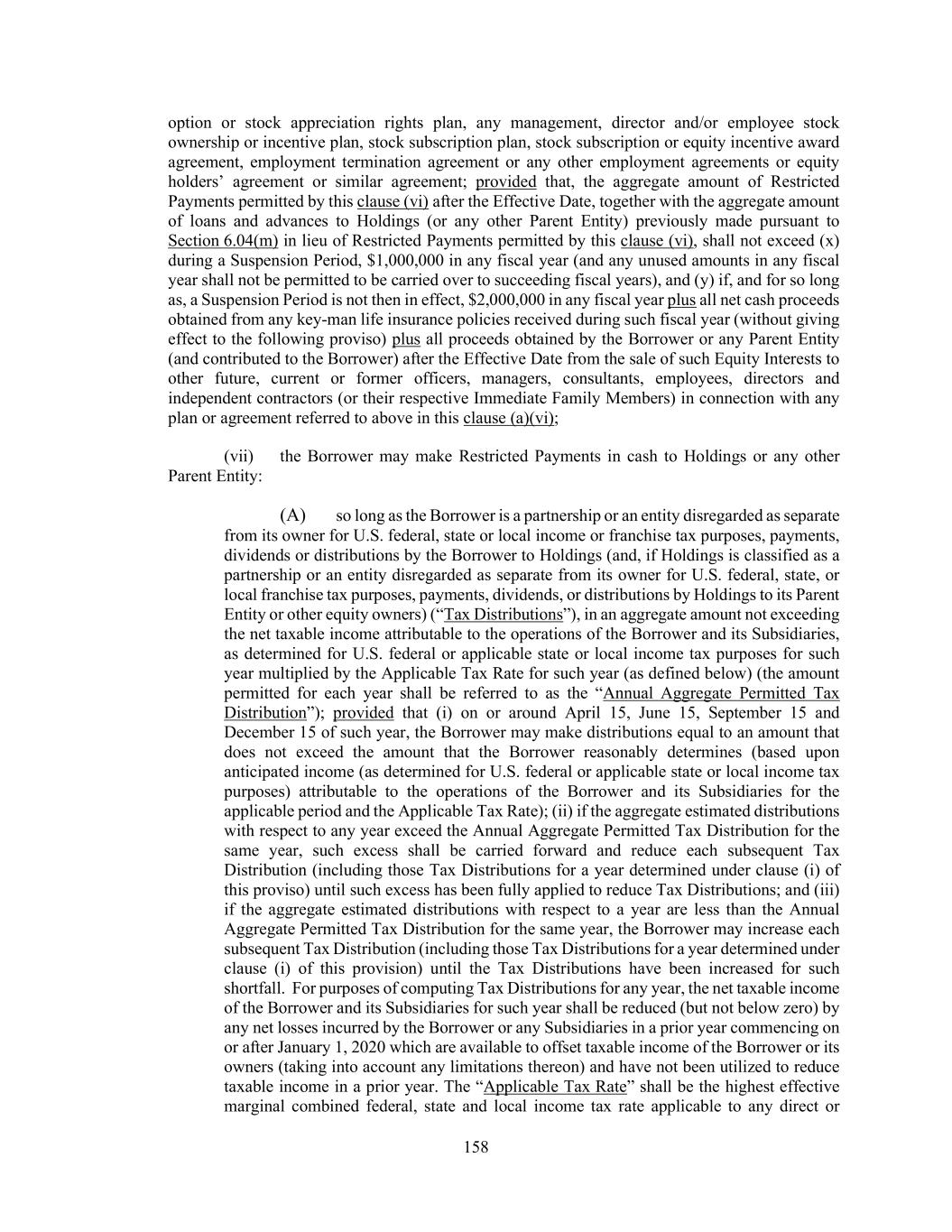 158 option or stock appreciation rights plan, any management, director and/or employee stock ownership or incentive plan, stock subscription plan, stock subscription or equity incentive award agreement, employment termination agreement or any other employment agreements or equity holders’ agreement or similar agreement; provided that, the aggregate amount of Restricted Payments permitted by this clause (vi) after the Effective Date, together with the aggregate amount of loans and advances to Holdings (or any other Parent Entity) previously made pursuant to Section 6.04(m) in lieu of Restricted Payments permitted by this clause (vi), shall not exceed (x) during a Suspension Period, $1,000,000 in any fiscal year (and any unused amounts in any fiscal year shall not be permitted to be carried over to succeeding fiscal years), and (y) if, and for so long as, a Suspension Period is not then in effect, $2,000,000 in any fiscal year plus all net cash proceeds obtained from any key-man life insurance policies received during such fiscal year (without giving effect to the following proviso) plus all proceeds obtained by the Borrower or any Parent Entity (and contributed to the Borrower) after the Effective Date from the sale of such Equity Interests to other future, current or former officers, managers, consultants, employees, directors and independent contractors (or their respective Immediate Family Members) in connection with any plan or agreement referred to above in this clause (a)(vi); (vii) the Borrower may make Restricted Payments in cash to Holdings or any other Parent Entity: (A) so long as the Borrower is a partnership or an entity disregarded as separate from its owner for U.S. federal, state or local income or franchise tax purposes, payments, dividends or distributions by the Borrower to Holdings (and, if Holdings is classified as a partnership or an entity disregarded as separate from its owner for U.S. federal, state, or local franchise tax purposes, payments, dividends, or distributions by Holdings to its Parent Entity or other equity owners) (“Tax Distributions”), in an aggregate amount not exceeding the net taxable income attributable to the operations of the Borrower and its Subsidiaries, as determined for U.S. federal or applicable state or local income tax purposes for such year multiplied by the Applicable Tax Rate for such year (as defined below) (the amount permitted for each year shall be referred to as the “Annual Aggregate Permitted Tax Distribution”); provided that (i) on or around April 15, June 15, September 15 and December 15 of such year, the Borrower may make distributions equal to an amount that does not exceed the amount that the Borrower reasonably determines (based upon anticipated income (as determined for U.S. federal or applicable state or local income tax purposes) attributable to the operations of the Borrower and its Subsidiaries for the applicable period and the Applicable Tax Rate); (ii) if the aggregate estimated distributions with respect to any year exceed the Annual Aggregate Permitted Tax Distribution for the same year, such excess shall be carried forward and reduce each subsequent Tax Distribution (including those Tax Distributions for a year determined under clause (i) of this proviso) until such excess has been fully applied to reduce Tax Distributions; and (iii) if the aggregate estimated distributions with respect to a year are less than the Annual Aggregate Permitted Tax Distribution for the same year, the Borrower may increase each subsequent Tax Distribution (including those Tax Distributions for a year determined under clause (i) of this provision) until the Tax Distributions have been increased for such shortfall. For purposes of computing Tax Distributions for any year, the net taxable income of the Borrower and its Subsidiaries for such year shall be reduced (but not below zero) by any net losses incurred by the Borrower or any Subsidiaries in a prior year commencing on or after January 1, 2020 which are available to offset taxable income of the Borrower or its owners (taking into account any limitations thereon) and have not been utilized to reduce taxable income in a prior year. The “Applicable Tax Rate” shall be the highest effective marginal combined federal, state and local income tax rate applicable to any direct or