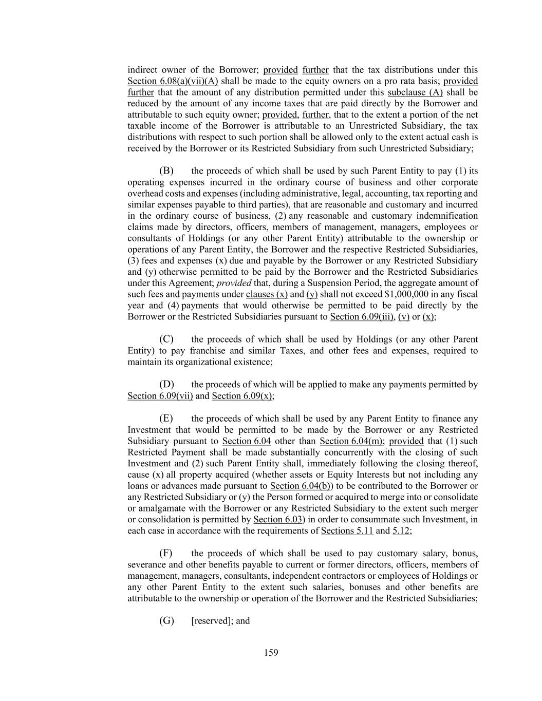 159 indirect owner of the Borrower; provided further that the tax distributions under this Section 6.08(a)(vii)(A) shall be made to the equity owners on a pro rata basis; provided further that the amount of any distribution permitted under this subclause (A) shall be reduced by the amount of any income taxes that are paid directly by the Borrower and attributable to such equity owner; provided, further, that to the extent a portion of the net taxable income of the Borrower is attributable to an Unrestricted Subsidiary, the tax distributions with respect to such portion shall be allowed only to the extent actual cash is received by the Borrower or its Restricted Subsidiary from such Unrestricted Subsidiary; (B) the proceeds of which shall be used by such Parent Entity to pay (1) its operating expenses incurred in the ordinary course of business and other corporate overhead costs and expenses (including administrative, legal, accounting, tax reporting and similar expenses payable to third parties), that are reasonable and customary and incurred in the ordinary course of business, (2) any reasonable and customary indemnification claims made by directors, officers, members of management, managers, employees or consultants of Holdings (or any other Parent Entity) attributable to the ownership or operations of any Parent Entity, the Borrower and the respective Restricted Subsidiaries, (3) fees and expenses (x) due and payable by the Borrower or any Restricted Subsidiary and (y) otherwise permitted to be paid by the Borrower and the Restricted Subsidiaries under this Agreement; provided that, during a Suspension Period, the aggregate amount of such fees and payments under clauses (x) and (y) shall not exceed $1,000,000 in any fiscal year and (4) payments that would otherwise be permitted to be paid directly by the Borrower or the Restricted Subsidiaries pursuant to Section 6.09(iii), (v) or (x); (C) the proceeds of which shall be used by Holdings (or any other Parent Entity) to pay franchise and similar Taxes, and other fees and expenses, required to maintain its organizational existence; (D) the proceeds of which will be applied to make any payments permitted by Section 6.09(vii) and Section 6.09(x); (E) the proceeds of which shall be used by any Parent Entity to finance any Investment that would be permitted to be made by the Borrower or any Restricted Subsidiary pursuant to Section 6.04 other than Section 6.04(m); provided that (1) such Restricted Payment shall be made substantially concurrently with the closing of such Investment and (2) such Parent Entity shall, immediately following the closing thereof, cause (x) all property acquired (whether assets or Equity Interests but not including any loans or advances made pursuant to Section 6.04(b)) to be contributed to the Borrower or any Restricted Subsidiary or (y) the Person formed or acquired to merge into or consolidate or amalgamate with the Borrower or any Restricted Subsidiary to the extent such merger or consolidation is permitted by Section 6.03) in order to consummate such Investment, in each case in accordance with the requirements of Sections 5.11 and 5.12; (F) the proceeds of which shall be used to pay customary salary, bonus, severance and other benefits payable to current or former directors, officers, members of management, managers, consultants, independent contractors or employees of Holdings or any other Parent Entity to the extent such salaries, bonuses and other benefits are attributable to the ownership or operation of the Borrower and the Restricted Subsidiaries; (G) [reserved]; and
