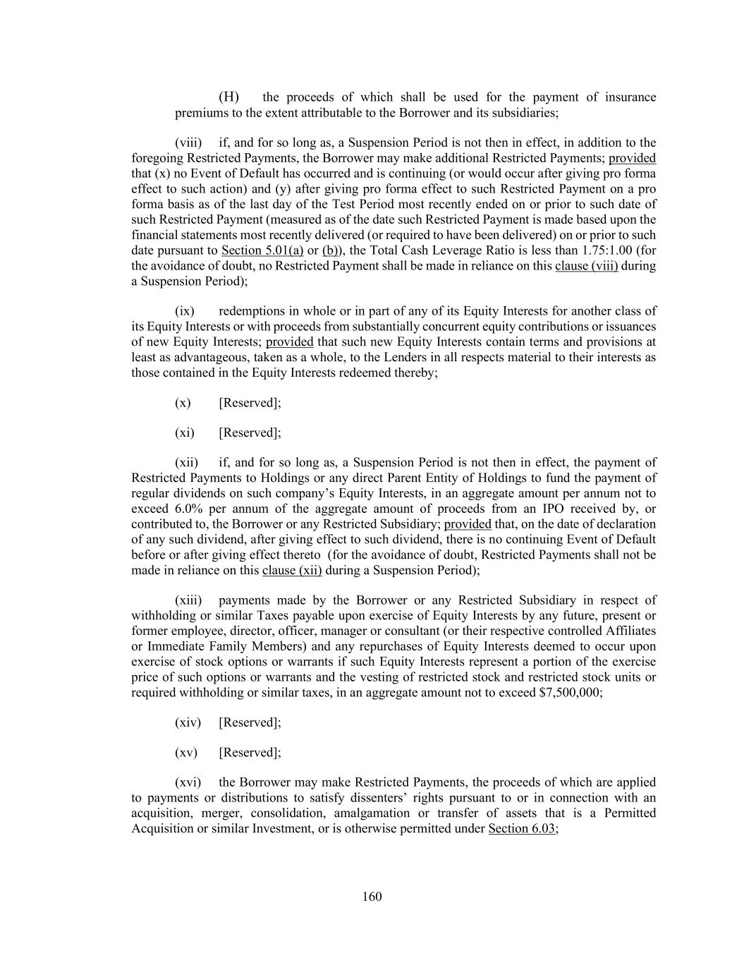 160 (H) the proceeds of which shall be used for the payment of insurance premiums to the extent attributable to the Borrower and its subsidiaries; (viii) if, and for so long as, a Suspension Period is not then in effect, in addition to the foregoing Restricted Payments, the Borrower may make additional Restricted Payments; provided that (x) no Event of Default has occurred and is continuing (or would occur after giving pro forma effect to such action) and (y) after giving pro forma effect to such Restricted Payment on a pro forma basis as of the last day of the Test Period most recently ended on or prior to such date of such Restricted Payment (measured as of the date such Restricted Payment is made based upon the financial statements most recently delivered (or required to have been delivered) on or prior to such date pursuant to Section 5.01(a) or (b)), the Total Cash Leverage Ratio is less than 1.75:1.00 (for the avoidance of doubt, no Restricted Payment shall be made in reliance on this clause (viii) during a Suspension Period); (ix) redemptions in whole or in part of any of its Equity Interests for another class of its Equity Interests or with proceeds from substantially concurrent equity contributions or issuances of new Equity Interests; provided that such new Equity Interests contain terms and provisions at least as advantageous, taken as a whole, to the Lenders in all respects material to their interests as those contained in the Equity Interests redeemed thereby; (x) [Reserved]; (xi) [Reserved]; (xii) if, and for so long as, a Suspension Period is not then in effect, the payment of Restricted Payments to Holdings or any direct Parent Entity of Holdings to fund the payment of regular dividends on such company’s Equity Interests, in an aggregate amount per annum not to exceed 6.0% per annum of the aggregate amount of proceeds from an IPO received by, or contributed to, the Borrower or any Restricted Subsidiary; provided that, on the date of declaration of any such dividend, after giving effect to such dividend, there is no continuing Event of Default before or after giving effect thereto (for the avoidance of doubt, Restricted Payments shall not be made in reliance on this clause (xii) during a Suspension Period); (xiii) payments made by the Borrower or any Restricted Subsidiary in respect of withholding or similar Taxes payable upon exercise of Equity Interests by any future, present or former employee, director, officer, manager or consultant (or their respective controlled Affiliates or Immediate Family Members) and any repurchases of Equity Interests deemed to occur upon exercise of stock options or warrants if such Equity Interests represent a portion of the exercise price of such options or warrants and the vesting of restricted stock and restricted stock units or required withholding or similar taxes, in an aggregate amount not to exceed $7,500,000; (xiv) [Reserved]; (xv) [Reserved]; (xvi) the Borrower may make Restricted Payments, the proceeds of which are applied to payments or distributions to satisfy dissenters’ rights pursuant to or in connection with an acquisition, merger, consolidation, amalgamation or transfer of assets that is a Permitted Acquisition or similar Investment, or is otherwise permitted under Section 6.03;