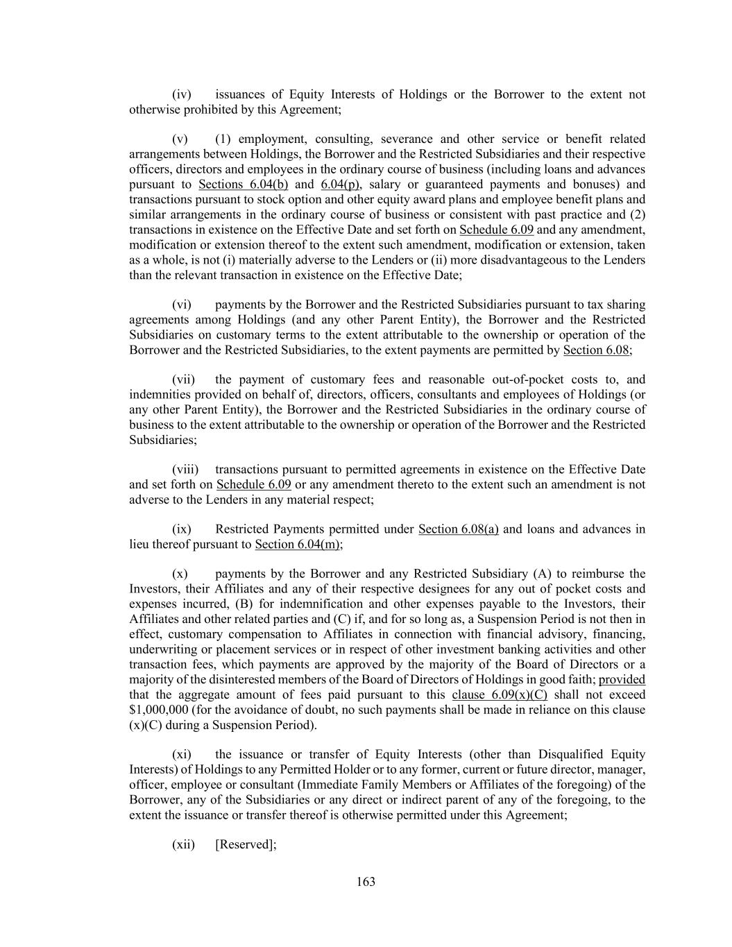 163 (iv) issuances of Equity Interests of Holdings or the Borrower to the extent not otherwise prohibited by this Agreement; (v) (1) employment, consulting, severance and other service or benefit related arrangements between Holdings, the Borrower and the Restricted Subsidiaries and their respective officers, directors and employees in the ordinary course of business (including loans and advances pursuant to Sections 6.04(b) and 6.04(p), salary or guaranteed payments and bonuses) and transactions pursuant to stock option and other equity award plans and employee benefit plans and similar arrangements in the ordinary course of business or consistent with past practice and (2) transactions in existence on the Effective Date and set forth on Schedule 6.09 and any amendment, modification or extension thereof to the extent such amendment, modification or extension, taken as a whole, is not (i) materially adverse to the Lenders or (ii) more disadvantageous to the Lenders than the relevant transaction in existence on the Effective Date; (vi) payments by the Borrower and the Restricted Subsidiaries pursuant to tax sharing agreements among Holdings (and any other Parent Entity), the Borrower and the Restricted Subsidiaries on customary terms to the extent attributable to the ownership or operation of the Borrower and the Restricted Subsidiaries, to the extent payments are permitted by Section 6.08; (vii) the payment of customary fees and reasonable out-of-pocket costs to, and indemnities provided on behalf of, directors, officers, consultants and employees of Holdings (or any other Parent Entity), the Borrower and the Restricted Subsidiaries in the ordinary course of business to the extent attributable to the ownership or operation of the Borrower and the Restricted Subsidiaries; (viii) transactions pursuant to permitted agreements in existence on the Effective Date and set forth on Schedule 6.09 or any amendment thereto to the extent such an amendment is not adverse to the Lenders in any material respect; (ix) Restricted Payments permitted under Section 6.08(a) and loans and advances in lieu thereof pursuant to Section 6.04(m); (x) payments by the Borrower and any Restricted Subsidiary (A) to reimburse the Investors, their Affiliates and any of their respective designees for any out of pocket costs and expenses incurred, (B) for indemnification and other expenses payable to the Investors, their Affiliates and other related parties and (C) if, and for so long as, a Suspension Period is not then in effect, customary compensation to Affiliates in connection with financial advisory, financing, underwriting or placement services or in respect of other investment banking activities and other transaction fees, which payments are approved by the majority of the Board of Directors or a majority of the disinterested members of the Board of Directors of Holdings in good faith; provided that the aggregate amount of fees paid pursuant to this clause 6.09(x)(C) shall not exceed $1,000,000 (for the avoidance of doubt, no such payments shall be made in reliance on this clause (x)(C) during a Suspension Period). (xi) the issuance or transfer of Equity Interests (other than Disqualified Equity Interests) of Holdings to any Permitted Holder or to any former, current or future director, manager, officer, employee or consultant (Immediate Family Members or Affiliates of the foregoing) of the Borrower, any of the Subsidiaries or any direct or indirect parent of any of the foregoing, to the extent the issuance or transfer thereof is otherwise permitted under this Agreement; (xii) [Reserved];