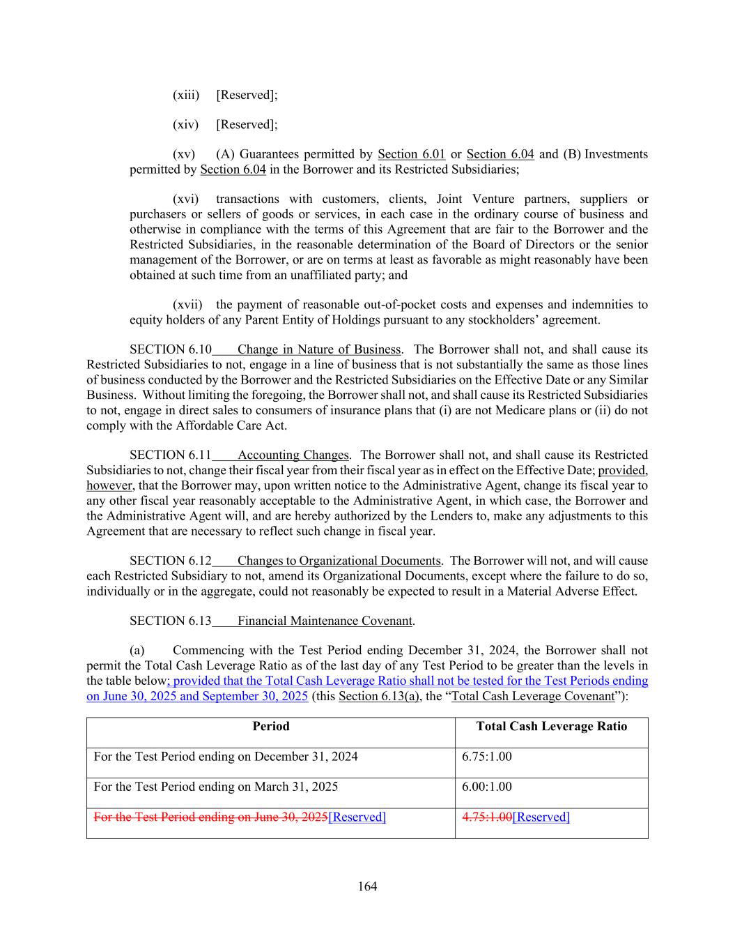 164 (xiii) [Reserved]; (xiv) [Reserved]; (xv) (A) Guarantees permitted by Section 6.01 or Section 6.04 and (B) Investments permitted by Section 6.04 in the Borrower and its Restricted Subsidiaries; (xvi) transactions with customers, clients, Joint Venture partners, suppliers or purchasers or sellers of goods or services, in each case in the ordinary course of business and otherwise in compliance with the terms of this Agreement that are fair to the Borrower and the Restricted Subsidiaries, in the reasonable determination of the Board of Directors or the senior management of the Borrower, or are on terms at least as favorable as might reasonably have been obtained at such time from an unaffiliated party; and (xvii) the payment of reasonable out-of-pocket costs and expenses and indemnities to equity holders of any Parent Entity of Holdings pursuant to any stockholders’ agreement. SECTION 6.10 Change in Nature of Business. The Borrower shall not, and shall cause its Restricted Subsidiaries to not, engage in a line of business that is not substantially the same as those lines of business conducted by the Borrower and the Restricted Subsidiaries on the Effective Date or any Similar Business. Without limiting the foregoing, the Borrower shall not, and shall cause its Restricted Subsidiaries to not, engage in direct sales to consumers of insurance plans that (i) are not Medicare plans or (ii) do not comply with the Affordable Care Act. SECTION 6.11 Accounting Changes. The Borrower shall not, and shall cause its Restricted Subsidiaries to not, change their fiscal year from their fiscal year as in effect on the Effective Date; provided, however, that the Borrower may, upon written notice to the Administrative Agent, change its fiscal year to any other fiscal year reasonably acceptable to the Administrative Agent, in which case, the Borrower and the Administrative Agent will, and are hereby authorized by the Lenders to, make any adjustments to this Agreement that are necessary to reflect such change in fiscal year. SECTION 6.12 Changes to Organizational Documents. The Borrower will not, and will cause each Restricted Subsidiary to not, amend its Organizational Documents, except where the failure to do so, individually or in the aggregate, could not reasonably be expected to result in a Material Adverse Effect. SECTION 6.13 Financial Maintenance Covenant. (a) Commencing with the Test Period ending December 31, 2024, the Borrower shall not permit the Total Cash Leverage Ratio as of the last day of any Test Period to be greater than the levels in the table below; provided that the Total Cash Leverage Ratio shall not be tested for the Test Periods ending on June 30, 2025 and September 30, 2025 (this Section 6.13(a), the “Total Cash Leverage Covenant”): Period Total Cash Leverage Ratio For the Test Period ending on December 31, 2024 6.75:1.00 For the Test Period ending on March 31, 2025 6.00:1.00 For the Test Period ending on June 30, 2025[Reserved] 4.75:1.00[Reserved]