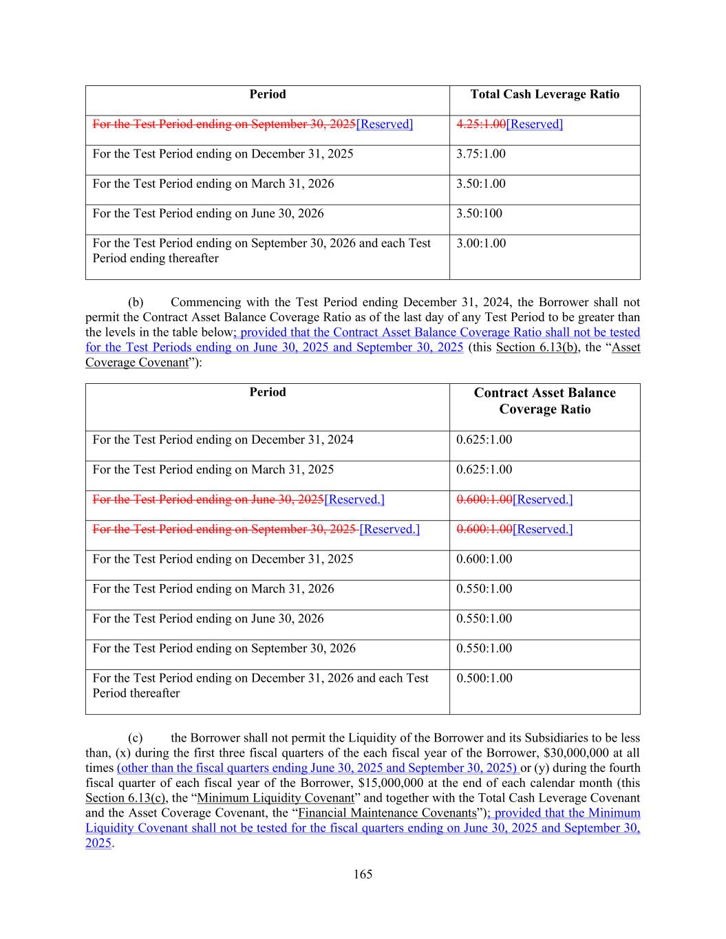 165 Period Total Cash Leverage Ratio For the Test Period ending on September 30, 2025[Reserved] 4.25:1.00[Reserved] For the Test Period ending on December 31, 2025 3.75:1.00 For the Test Period ending on March 31, 2026 3.50:1.00 For the Test Period ending on June 30, 2026 3.50:100 For the Test Period ending on September 30, 2026 and each Test Period ending thereafter 3.00:1.00 (b) Commencing with the Test Period ending December 31, 2024, the Borrower shall not permit the Contract Asset Balance Coverage Ratio as of the last day of any Test Period to be greater than the levels in the table below; provided that the Contract Asset Balance Coverage Ratio shall not be tested for the Test Periods ending on June 30, 2025 and September 30, 2025 (this Section 6.13(b), the “Asset Coverage Covenant”): Period Contract Asset Balance Coverage Ratio For the Test Period ending on December 31, 2024 0.625:1.00 For the Test Period ending on March 31, 2025 0.625:1.00 For the Test Period ending on June 30, 2025[Reserved.] 0.600:1.00[Reserved.] For the Test Period ending on September 30, 2025 [Reserved.] 0.600:1.00[Reserved.] For the Test Period ending on December 31, 2025 0.600:1.00 For the Test Period ending on March 31, 2026 0.550:1.00 For the Test Period ending on June 30, 2026 0.550:1.00 For the Test Period ending on September 30, 2026 0.550:1.00 For the Test Period ending on December 31, 2026 and each Test Period thereafter 0.500:1.00 (c) the Borrower shall not permit the Liquidity of the Borrower and its Subsidiaries to be less than, (x) during the first three fiscal quarters of the each fiscal year of the Borrower, $30,000,000 at all times (other than the fiscal quarters ending June 30, 2025 and September 30, 2025) or (y) during the fourth fiscal quarter of each fiscal year of the Borrower, $15,000,000 at the end of each calendar month (this Section 6.13(c), the “Minimum Liquidity Covenant” and together with the Total Cash Leverage Covenant and the Asset Coverage Covenant, the “Financial Maintenance Covenants”); provided that the Minimum Liquidity Covenant shall not be tested for the fiscal quarters ending on June 30, 2025 and September 30, 2025.