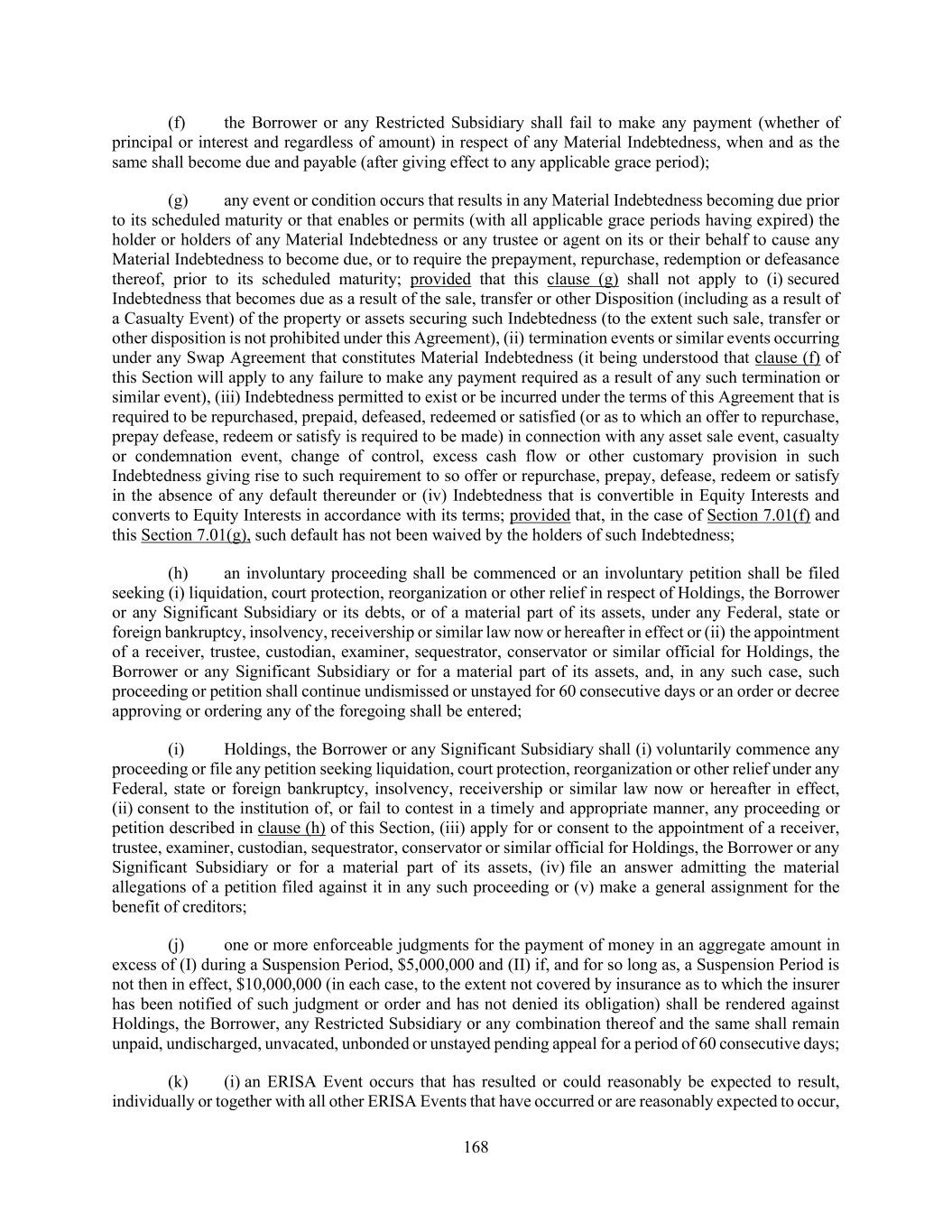 168 (f) the Borrower or any Restricted Subsidiary shall fail to make any payment (whether of principal or interest and regardless of amount) in respect of any Material Indebtedness, when and as the same shall become due and payable (after giving effect to any applicable grace period); (g) any event or condition occurs that results in any Material Indebtedness becoming due prior to its scheduled maturity or that enables or permits (with all applicable grace periods having expired) the holder or holders of any Material Indebtedness or any trustee or agent on its or their behalf to cause any Material Indebtedness to become due, or to require the prepayment, repurchase, redemption or defeasance thereof, prior to its scheduled maturity; provided that this clause (g) shall not apply to (i) secured Indebtedness that becomes due as a result of the sale, transfer or other Disposition (including as a result of a Casualty Event) of the property or assets securing such Indebtedness (to the extent such sale, transfer or other disposition is not prohibited under this Agreement), (ii) termination events or similar events occurring under any Swap Agreement that constitutes Material Indebtedness (it being understood that clause (f) of this Section will apply to any failure to make any payment required as a result of any such termination or similar event), (iii) Indebtedness permitted to exist or be incurred under the terms of this Agreement that is required to be repurchased, prepaid, defeased, redeemed or satisfied (or as to which an offer to repurchase, prepay defease, redeem or satisfy is required to be made) in connection with any asset sale event, casualty or condemnation event, change of control, excess cash flow or other customary provision in such Indebtedness giving rise to such requirement to so offer or repurchase, prepay, defease, redeem or satisfy in the absence of any default thereunder or (iv) Indebtedness that is convertible in Equity Interests and converts to Equity Interests in accordance with its terms; provided that, in the case of Section 7.01(f) and this Section 7.01(g), such default has not been waived by the holders of such Indebtedness; (h) an involuntary proceeding shall be commenced or an involuntary petition shall be filed seeking (i) liquidation, court protection, reorganization or other relief in respect of Holdings, the Borrower or any Significant Subsidiary or its debts, or of a material part of its assets, under any Federal, state or foreign bankruptcy, insolvency, receivership or similar law now or hereafter in effect or (ii) the appointment of a receiver, trustee, custodian, examiner, sequestrator, conservator or similar official for Holdings, the Borrower or any Significant Subsidiary or for a material part of its assets, and, in any such case, such proceeding or petition shall continue undismissed or unstayed for 60 consecutive days or an order or decree approving or ordering any of the foregoing shall be entered; (i) Holdings, the Borrower or any Significant Subsidiary shall (i) voluntarily commence any proceeding or file any petition seeking liquidation, court protection, reorganization or other relief under any Federal, state or foreign bankruptcy, insolvency, receivership or similar law now or hereafter in effect, (ii) consent to the institution of, or fail to contest in a timely and appropriate manner, any proceeding or petition described in clause (h) of this Section, (iii) apply for or consent to the appointment of a receiver, trustee, examiner, custodian, sequestrator, conservator or similar official for Holdings, the Borrower or any Significant Subsidiary or for a material part of its assets, (iv) file an answer admitting the material allegations of a petition filed against it in any such proceeding or (v) make a general assignment for the benefit of creditors; (j) one or more enforceable judgments for the payment of money in an aggregate amount in excess of (I) during a Suspension Period, $5,000,000 and (II) if, and for so long as, a Suspension Period is not then in effect, $10,000,000 (in each case, to the extent not covered by insurance as to which the insurer has been notified of such judgment or order and has not denied its obligation) shall be rendered against Holdings, the Borrower, any Restricted Subsidiary or any combination thereof and the same shall remain unpaid, undischarged, unvacated, unbonded or unstayed pending appeal for a period of 60 consecutive days; (k) (i) an ERISA Event occurs that has resulted or could reasonably be expected to result, individually or together with all other ERISA Events that have occurred or are reasonably expected to occur,