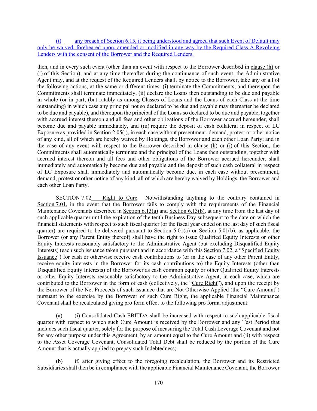 170 (t) any breach of Section 6.15, it being understood and agreed that such Event of Default may only be waived, forebeared upon, amended or modified in any way by the Required Class A Revolving Lenders with the consent of the Borrower and the Required Lenders. then, and in every such event (other than an event with respect to the Borrower described in clause (h) or (i) of this Section), and at any time thereafter during the continuance of such event, the Administrative Agent may, and at the request of the Required Lenders shall, by notice to the Borrower, take any or all of the following actions, at the same or different times: (i) terminate the Commitments, and thereupon the Commitments shall terminate immediately, (ii) declare the Loans then outstanding to be due and payable in whole (or in part, (but ratably as among Classes of Loans and the Loans of each Class at the time outstanding) in which case any principal not so declared to be due and payable may thereafter be declared to be due and payable), and thereupon the principal of the Loans so declared to be due and payable, together with accrued interest thereon and all fees and other obligations of the Borrower accrued hereunder, shall become due and payable immediately, and (iii) require the deposit of cash collateral in respect of LC Exposure as provided in Section 2.05(j), in each case without presentment, demand, protest or other notice of any kind, all of which are hereby waived by Holdings, the Borrower and each other Loan Party; and in the case of any event with respect to the Borrower described in clause (h) or (i) of this Section, the Commitments shall automatically terminate and the principal of the Loans then outstanding, together with accrued interest thereon and all fees and other obligations of the Borrower accrued hereunder, shall immediately and automatically become due and payable and the deposit of such cash collateral in respect of LC Exposure shall immediately and automatically become due, in each case without presentment, demand, protest or other notice of any kind, all of which are hereby waived by Holdings, the Borrower and each other Loan Party. SECTION 7.02 Right to Cure. Notwithstanding anything to the contrary contained in Section 7.01, in the event that the Borrower fails to comply with the requirements of the Financial Maintenance Covenants described in Section 6.13(a) and Section 6.13(b), at any time from the last day of such applicable quarter until the expiration of the tenth Business Day subsequent to the date on which the financial statements with respect to such fiscal quarter (or the fiscal year ended on the last day of such fiscal quarter) are required to be delivered pursuant to Section 5.01(a) or Section 5.01(b), as applicable, the Borrower (or any Parent Entity thereof) shall have the right to issue Qualified Equity Interests or other Equity Interests reasonably satisfactory to the Administrative Agent (but excluding Disqualified Equity Interests) (each such issuance taken pursuant and in accordance with this Section 7.02, a “Specified Equity Issuance”) for cash or otherwise receive cash contributions to (or in the case of any other Parent Entity, receive equity interests in the Borrower for its cash contributions to) the Equity Interests (other than Disqualified Equity Interests) of the Borrower as cash common equity or other Qualified Equity Interests or other Equity Interests reasonably satisfactory to the Administrative Agent, in each case, which are contributed to the Borrower in the form of cash (collectively, the “Cure Right”), and upon the receipt by the Borrower of the Net Proceeds of such issuance that are Not Otherwise Applied (the “Cure Amount”) pursuant to the exercise by the Borrower of such Cure Right, the applicable Financial Maintenance Covenant shall be recalculated giving pro form effect to the following pro forma adjustment: (a) (i) Consolidated Cash EBITDA shall be increased with respect to such applicable fiscal quarter with respect to which such Cure Amount is received by the Borrower and any Test Period that includes such fiscal quarter, solely for the purpose of measuring the Total Cash Leverage Covenant and not for any other purpose under this Agreement, by an amount equal to the Cure Amount and (ii) with respect to the Asset Coverage Covenant, Consolidated Total Debt shall be reduced by the portion of the Cure Amount that is actually applied to prepay such Indebtedness; (b) if, after giving effect to the foregoing recalculation, the Borrower and its Restricted Subsidiaries shall then be in compliance with the applicable Financial Maintenance Covenant, the Borrower