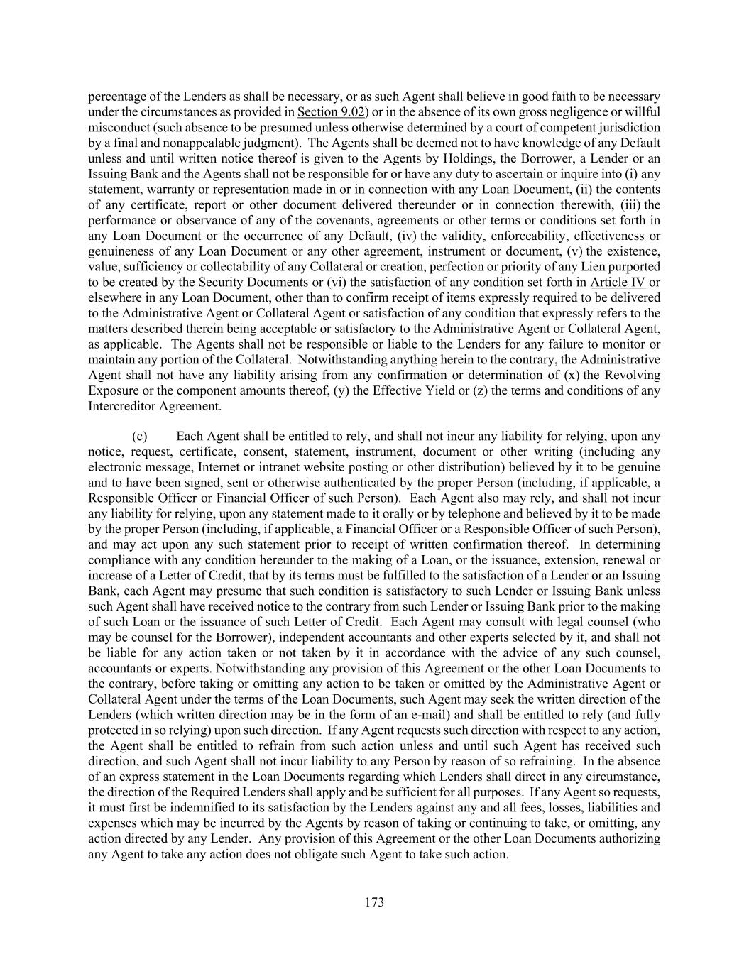 173 percentage of the Lenders as shall be necessary, or as such Agent shall believe in good faith to be necessary under the circumstances as provided in Section 9.02) or in the absence of its own gross negligence or willful misconduct (such absence to be presumed unless otherwise determined by a court of competent jurisdiction by a final and nonappealable judgment). The Agents shall be deemed not to have knowledge of any Default unless and until written notice thereof is given to the Agents by Holdings, the Borrower, a Lender or an Issuing Bank and the Agents shall not be responsible for or have any duty to ascertain or inquire into (i) any statement, warranty or representation made in or in connection with any Loan Document, (ii) the contents of any certificate, report or other document delivered thereunder or in connection therewith, (iii) the performance or observance of any of the covenants, agreements or other terms or conditions set forth in any Loan Document or the occurrence of any Default, (iv) the validity, enforceability, effectiveness or genuineness of any Loan Document or any other agreement, instrument or document, (v) the existence, value, sufficiency or collectability of any Collateral or creation, perfection or priority of any Lien purported to be created by the Security Documents or (vi) the satisfaction of any condition set forth in Article IV or elsewhere in any Loan Document, other than to confirm receipt of items expressly required to be delivered to the Administrative Agent or Collateral Agent or satisfaction of any condition that expressly refers to the matters described therein being acceptable or satisfactory to the Administrative Agent or Collateral Agent, as applicable. The Agents shall not be responsible or liable to the Lenders for any failure to monitor or maintain any portion of the Collateral. Notwithstanding anything herein to the contrary, the Administrative Agent shall not have any liability arising from any confirmation or determination of (x) the Revolving Exposure or the component amounts thereof, (y) the Effective Yield or (z) the terms and conditions of any Intercreditor Agreement. (c) Each Agent shall be entitled to rely, and shall not incur any liability for relying, upon any notice, request, certificate, consent, statement, instrument, document or other writing (including any electronic message, Internet or intranet website posting or other distribution) believed by it to be genuine and to have been signed, sent or otherwise authenticated by the proper Person (including, if applicable, a Responsible Officer or Financial Officer of such Person). Each Agent also may rely, and shall not incur any liability for relying, upon any statement made to it orally or by telephone and believed by it to be made by the proper Person (including, if applicable, a Financial Officer or a Responsible Officer of such Person), and may act upon any such statement prior to receipt of written confirmation thereof. In determining compliance with any condition hereunder to the making of a Loan, or the issuance, extension, renewal or increase of a Letter of Credit, that by its terms must be fulfilled to the satisfaction of a Lender or an Issuing Bank, each Agent may presume that such condition is satisfactory to such Lender or Issuing Bank unless such Agent shall have received notice to the contrary from such Lender or Issuing Bank prior to the making of such Loan or the issuance of such Letter of Credit. Each Agent may consult with legal counsel (who may be counsel for the Borrower), independent accountants and other experts selected by it, and shall not be liable for any action taken or not taken by it in accordance with the advice of any such counsel, accountants or experts. Notwithstanding any provision of this Agreement or the other Loan Documents to the contrary, before taking or omitting any action to be taken or omitted by the Administrative Agent or Collateral Agent under the terms of the Loan Documents, such Agent may seek the written direction of the Lenders (which written direction may be in the form of an e-mail) and shall be entitled to rely (and fully protected in so relying) upon such direction. If any Agent requests such direction with respect to any action, the Agent shall be entitled to refrain from such action unless and until such Agent has received such direction, and such Agent shall not incur liability to any Person by reason of so refraining. In the absence of an express statement in the Loan Documents regarding which Lenders shall direct in any circumstance, the direction of the Required Lenders shall apply and be sufficient for all purposes. If any Agent so requests, it must first be indemnified to its satisfaction by the Lenders against any and all fees, losses, liabilities and expenses which may be incurred by the Agents by reason of taking or continuing to take, or omitting, any action directed by any Lender. Any provision of this Agreement or the other Loan Documents authorizing any Agent to take any action does not obligate such Agent to take such action.