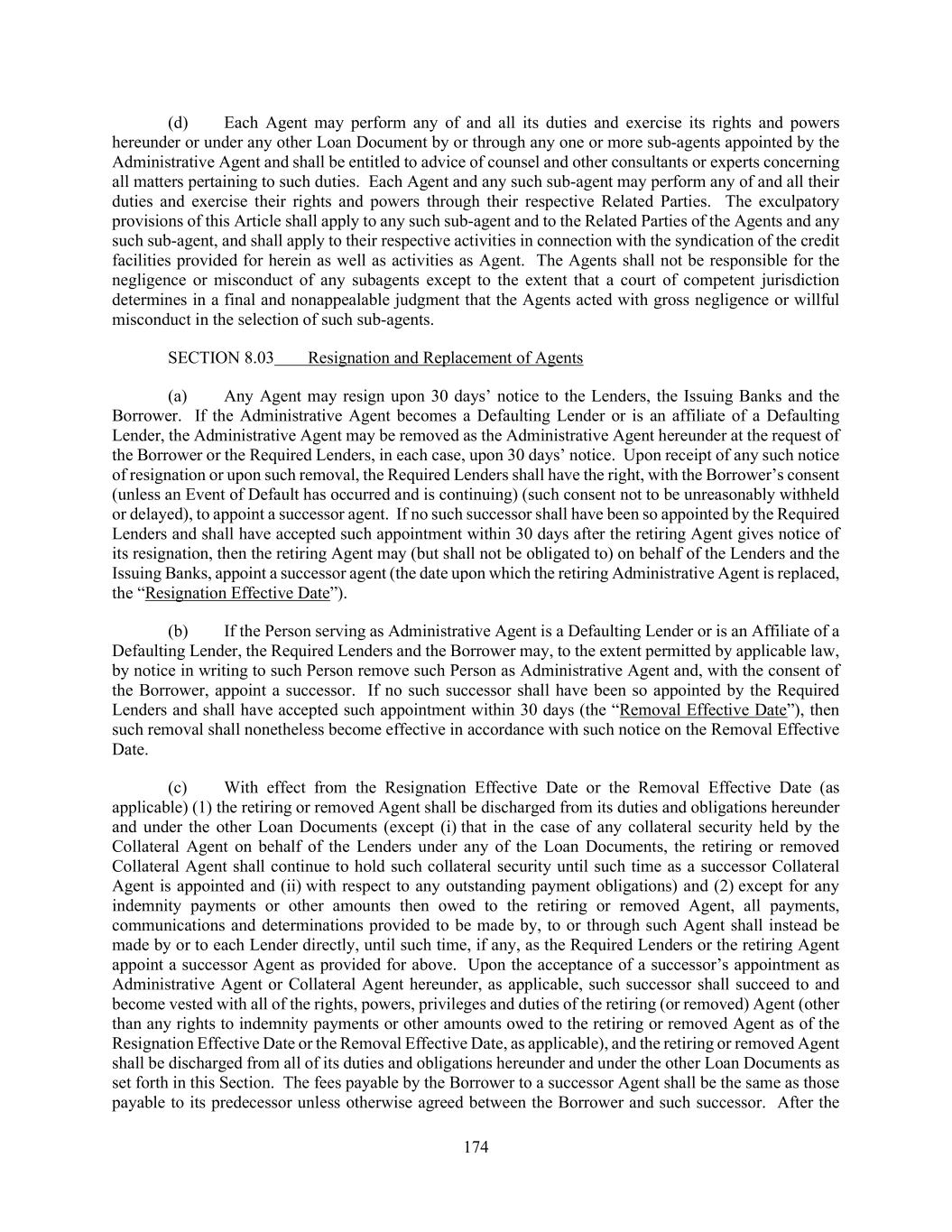 174 (d) Each Agent may perform any of and all its duties and exercise its rights and powers hereunder or under any other Loan Document by or through any one or more sub-agents appointed by the Administrative Agent and shall be entitled to advice of counsel and other consultants or experts concerning all matters pertaining to such duties. Each Agent and any such sub-agent may perform any of and all their duties and exercise their rights and powers through their respective Related Parties. The exculpatory provisions of this Article shall apply to any such sub-agent and to the Related Parties of the Agents and any such sub-agent, and shall apply to their respective activities in connection with the syndication of the credit facilities provided for herein as well as activities as Agent. The Agents shall not be responsible for the negligence or misconduct of any subagents except to the extent that a court of competent jurisdiction determines in a final and nonappealable judgment that the Agents acted with gross negligence or willful misconduct in the selection of such sub-agents. SECTION 8.03 Resignation and Replacement of Agents (a) Any Agent may resign upon 30 days’ notice to the Lenders, the Issuing Banks and the Borrower. If the Administrative Agent becomes a Defaulting Lender or is an affiliate of a Defaulting Lender, the Administrative Agent may be removed as the Administrative Agent hereunder at the request of the Borrower or the Required Lenders, in each case, upon 30 days’ notice. Upon receipt of any such notice of resignation or upon such removal, the Required Lenders shall have the right, with the Borrower’s consent (unless an Event of Default has occurred and is continuing) (such consent not to be unreasonably withheld or delayed), to appoint a successor agent. If no such successor shall have been so appointed by the Required Lenders and shall have accepted such appointment within 30 days after the retiring Agent gives notice of its resignation, then the retiring Agent may (but shall not be obligated to) on behalf of the Lenders and the Issuing Banks, appoint a successor agent (the date upon which the retiring Administrative Agent is replaced, the “Resignation Effective Date”). (b) If the Person serving as Administrative Agent is a Defaulting Lender or is an Affiliate of a Defaulting Lender, the Required Lenders and the Borrower may, to the extent permitted by applicable law, by notice in writing to such Person remove such Person as Administrative Agent and, with the consent of the Borrower, appoint a successor. If no such successor shall have been so appointed by the Required Lenders and shall have accepted such appointment within 30 days (the “Removal Effective Date”), then such removal shall nonetheless become effective in accordance with such notice on the Removal Effective Date. (c) With effect from the Resignation Effective Date or the Removal Effective Date (as applicable) (1) the retiring or removed Agent shall be discharged from its duties and obligations hereunder and under the other Loan Documents (except (i) that in the case of any collateral security held by the Collateral Agent on behalf of the Lenders under any of the Loan Documents, the retiring or removed Collateral Agent shall continue to hold such collateral security until such time as a successor Collateral Agent is appointed and (ii) with respect to any outstanding payment obligations) and (2) except for any indemnity payments or other amounts then owed to the retiring or removed Agent, all payments, communications and determinations provided to be made by, to or through such Agent shall instead be made by or to each Lender directly, until such time, if any, as the Required Lenders or the retiring Agent appoint a successor Agent as provided for above. Upon the acceptance of a successor’s appointment as Administrative Agent or Collateral Agent hereunder, as applicable, such successor shall succeed to and become vested with all of the rights, powers, privileges and duties of the retiring (or removed) Agent (other than any rights to indemnity payments or other amounts owed to the retiring or removed Agent as of the Resignation Effective Date or the Removal Effective Date, as applicable), and the retiring or removed Agent shall be discharged from all of its duties and obligations hereunder and under the other Loan Documents as set forth in this Section. The fees payable by the Borrower to a successor Agent shall be the same as those payable to its predecessor unless otherwise agreed between the Borrower and such successor. After the