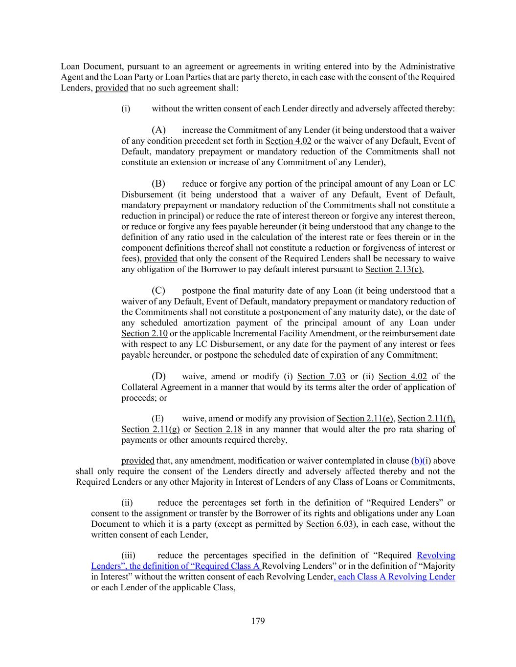 179 Loan Document, pursuant to an agreement or agreements in writing entered into by the Administrative Agent and the Loan Party or Loan Parties that are party thereto, in each case with the consent of the Required Lenders, provided that no such agreement shall: (i) without the written consent of each Lender directly and adversely affected thereby: (A) increase the Commitment of any Lender (it being understood that a waiver of any condition precedent set forth in Section 4.02 or the waiver of any Default, Event of Default, mandatory prepayment or mandatory reduction of the Commitments shall not constitute an extension or increase of any Commitment of any Lender), (B) reduce or forgive any portion of the principal amount of any Loan or LC Disbursement (it being understood that a waiver of any Default, Event of Default, mandatory prepayment or mandatory reduction of the Commitments shall not constitute a reduction in principal) or reduce the rate of interest thereon or forgive any interest thereon, or reduce or forgive any fees payable hereunder (it being understood that any change to the definition of any ratio used in the calculation of the interest rate or fees therein or in the component definitions thereof shall not constitute a reduction or forgiveness of interest or fees), provided that only the consent of the Required Lenders shall be necessary to waive any obligation of the Borrower to pay default interest pursuant to Section 2.13(c), (C) postpone the final maturity date of any Loan (it being understood that a waiver of any Default, Event of Default, mandatory prepayment or mandatory reduction of the Commitments shall not constitute a postponement of any maturity date), or the date of any scheduled amortization payment of the principal amount of any Loan under Section 2.10 or the applicable Incremental Facility Amendment, or the reimbursement date with respect to any LC Disbursement, or any date for the payment of any interest or fees payable hereunder, or postpone the scheduled date of expiration of any Commitment; (D) waive, amend or modify (i) Section 7.03 or (ii) Section 4.02 of the Collateral Agreement in a manner that would by its terms alter the order of application of proceeds; or (E) waive, amend or modify any provision of Section 2.11(e), Section 2.11(f), Section 2.11(g) or Section 2.18 in any manner that would alter the pro rata sharing of payments or other amounts required thereby, provided that, any amendment, modification or waiver contemplated in clause (b)(i) above shall only require the consent of the Lenders directly and adversely affected thereby and not the Required Lenders or any other Majority in Interest of Lenders of any Class of Loans or Commitments, (ii) reduce the percentages set forth in the definition of “Required Lenders” or consent to the assignment or transfer by the Borrower of its rights and obligations under any Loan Document to which it is a party (except as permitted by Section 6.03), in each case, without the written consent of each Lender, (iii) reduce the percentages specified in the definition of “Required Revolving Lenders”, the definition of “Required Class A Revolving Lenders” or in the definition of “Majority in Interest” without the written consent of each Revolving Lender, each Class A Revolving Lender or each Lender of the applicable Class,