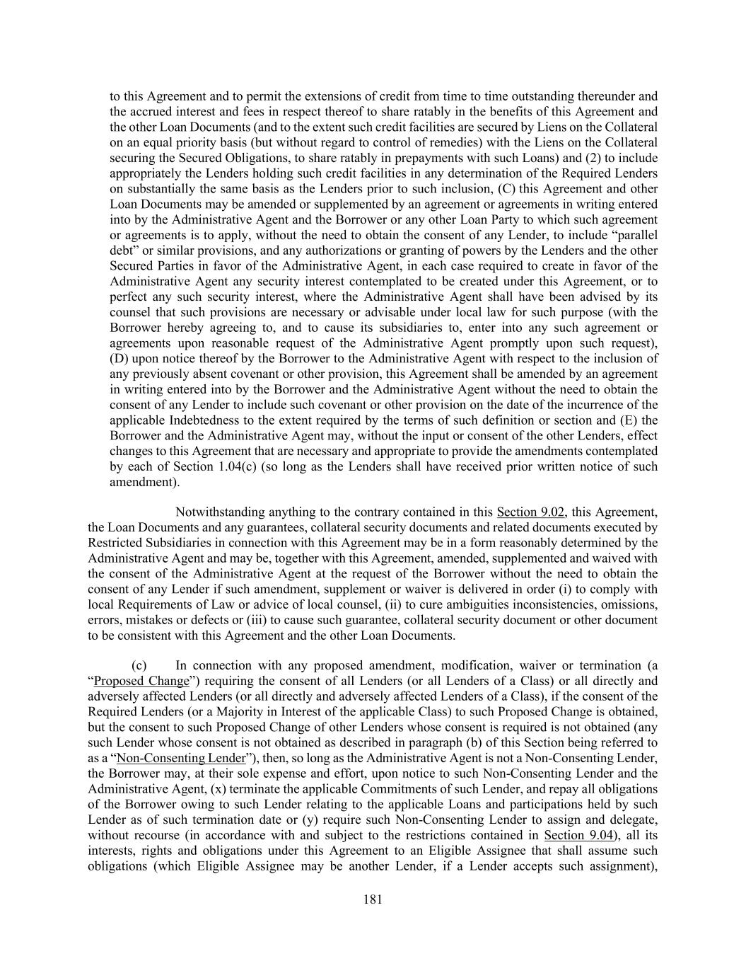 181 to this Agreement and to permit the extensions of credit from time to time outstanding thereunder and the accrued interest and fees in respect thereof to share ratably in the benefits of this Agreement and the other Loan Documents (and to the extent such credit facilities are secured by Liens on the Collateral on an equal priority basis (but without regard to control of remedies) with the Liens on the Collateral securing the Secured Obligations, to share ratably in prepayments with such Loans) and (2) to include appropriately the Lenders holding such credit facilities in any determination of the Required Lenders on substantially the same basis as the Lenders prior to such inclusion, (C) this Agreement and other Loan Documents may be amended or supplemented by an agreement or agreements in writing entered into by the Administrative Agent and the Borrower or any other Loan Party to which such agreement or agreements is to apply, without the need to obtain the consent of any Lender, to include “parallel debt” or similar provisions, and any authorizations or granting of powers by the Lenders and the other Secured Parties in favor of the Administrative Agent, in each case required to create in favor of the Administrative Agent any security interest contemplated to be created under this Agreement, or to perfect any such security interest, where the Administrative Agent shall have been advised by its counsel that such provisions are necessary or advisable under local law for such purpose (with the Borrower hereby agreeing to, and to cause its subsidiaries to, enter into any such agreement or agreements upon reasonable request of the Administrative Agent promptly upon such request), (D) upon notice thereof by the Borrower to the Administrative Agent with respect to the inclusion of any previously absent covenant or other provision, this Agreement shall be amended by an agreement in writing entered into by the Borrower and the Administrative Agent without the need to obtain the consent of any Lender to include such covenant or other provision on the date of the incurrence of the applicable Indebtedness to the extent required by the terms of such definition or section and (E) the Borrower and the Administrative Agent may, without the input or consent of the other Lenders, effect changes to this Agreement that are necessary and appropriate to provide the amendments contemplated by each of Section 1.04(c) (so long as the Lenders shall have received prior written notice of such amendment). Notwithstanding anything to the contrary contained in this Section 9.02, this Agreement, the Loan Documents and any guarantees, collateral security documents and related documents executed by Restricted Subsidiaries in connection with this Agreement may be in a form reasonably determined by the Administrative Agent and may be, together with this Agreement, amended, supplemented and waived with the consent of the Administrative Agent at the request of the Borrower without the need to obtain the consent of any Lender if such amendment, supplement or waiver is delivered in order (i) to comply with local Requirements of Law or advice of local counsel, (ii) to cure ambiguities inconsistencies, omissions, errors, mistakes or defects or (iii) to cause such guarantee, collateral security document or other document to be consistent with this Agreement and the other Loan Documents. (c) In connection with any proposed amendment, modification, waiver or termination (a “Proposed Change”) requiring the consent of all Lenders (or all Lenders of a Class) or all directly and adversely affected Lenders (or all directly and adversely affected Lenders of a Class), if the consent of the Required Lenders (or a Majority in Interest of the applicable Class) to such Proposed Change is obtained, but the consent to such Proposed Change of other Lenders whose consent is required is not obtained (any such Lender whose consent is not obtained as described in paragraph (b) of this Section being referred to as a “Non-Consenting Lender”), then, so long as the Administrative Agent is not a Non-Consenting Lender, the Borrower may, at their sole expense and effort, upon notice to such Non-Consenting Lender and the Administrative Agent, (x) terminate the applicable Commitments of such Lender, and repay all obligations of the Borrower owing to such Lender relating to the applicable Loans and participations held by such Lender as of such termination date or (y) require such Non-Consenting Lender to assign and delegate, without recourse (in accordance with and subject to the restrictions contained in Section 9.04), all its interests, rights and obligations under this Agreement to an Eligible Assignee that shall assume such obligations (which Eligible Assignee may be another Lender, if a Lender accepts such assignment),