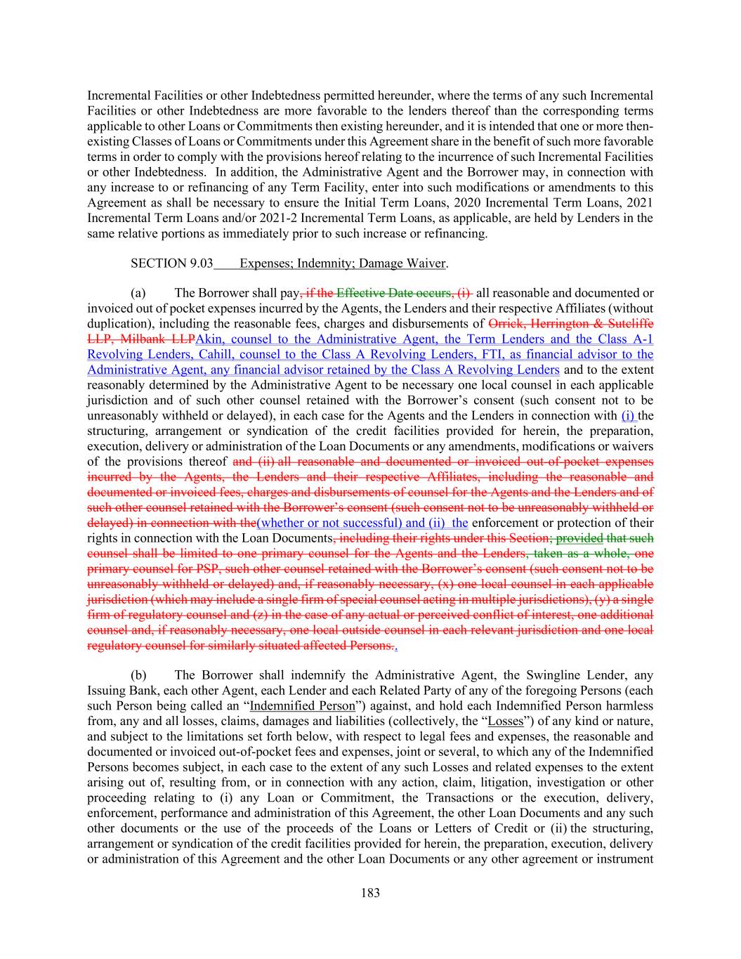 183 Incremental Facilities or other Indebtedness permitted hereunder, where the terms of any such Incremental Facilities or other Indebtedness are more favorable to the lenders thereof than the corresponding terms applicable to other Loans or Commitments then existing hereunder, and it is intended that one or more then- existing Classes of Loans or Commitments under this Agreement share in the benefit of such more favorable terms in order to comply with the provisions hereof relating to the incurrence of such Incremental Facilities or other Indebtedness. In addition, the Administrative Agent and the Borrower may, in connection with any increase to or refinancing of any Term Facility, enter into such modifications or amendments to this Agreement as shall be necessary to ensure the Initial Term Loans, 2020 Incremental Term Loans, 2021 Incremental Term Loans and/or 2021-2 Incremental Term Loans, as applicable, are held by Lenders in the same relative portions as immediately prior to such increase or refinancing. SECTION 9.03 Expenses; Indemnity; Damage Waiver. (a) The Borrower shall pay, if the Effective Date occurs, (i) all reasonable and documented or invoiced out of pocket expenses incurred by the Agents, the Lenders and their respective Affiliates (without duplication), including the reasonable fees, charges and disbursements of Orrick, Herrington & Sutcliffe LLP, Milbank LLPAkin, counsel to the Administrative Agent, the Term Lenders and the Class A-1 Revolving Lenders, Cahill, counsel to the Class A Revolving Lenders, FTI, as financial advisor to the Administrative Agent, any financial advisor retained by the Class A Revolving Lenders and to the extent reasonably determined by the Administrative Agent to be necessary one local counsel in each applicable jurisdiction and of such other counsel retained with the Borrower’s consent (such consent not to be unreasonably withheld or delayed), in each case for the Agents and the Lenders in connection with (i) the structuring, arrangement or syndication of the credit facilities provided for herein, the preparation, execution, delivery or administration of the Loan Documents or any amendments, modifications or waivers of the provisions thereof and (ii) all reasonable and documented or invoiced out-of-pocket expenses incurred by the Agents, the Lenders and their respective Affiliates, including the reasonable and documented or invoiced fees, charges and disbursements of counsel for the Agents and the Lenders and of such other counsel retained with the Borrower’s consent (such consent not to be unreasonably withheld or delayed) in connection with the(whether or not successful) and (ii) the enforcement or protection of their rights in connection with the Loan Documents, including their rights under this Section; provided that such counsel shall be limited to one primary counsel for the Agents and the Lenders, taken as a whole, one primary counsel for PSP, such other counsel retained with the Borrower’s consent (such consent not to be unreasonably withheld or delayed) and, if reasonably necessary, (x) one local counsel in each applicable jurisdiction (which may include a single firm of special counsel acting in multiple jurisdictions), (y) a single firm of regulatory counsel and (z) in the case of any actual or perceived conflict of interest, one additional counsel and, if reasonably necessary, one local outside counsel in each relevant jurisdiction and one local regulatory counsel for similarly situated affected Persons.. (b) The Borrower shall indemnify the Administrative Agent, the Swingline Lender, any Issuing Bank, each other Agent, each Lender and each Related Party of any of the foregoing Persons (each such Person being called an “Indemnified Person”) against, and hold each Indemnified Person harmless from, any and all losses, claims, damages and liabilities (collectively, the “Losses”) of any kind or nature, and subject to the limitations set forth below, with respect to legal fees and expenses, the reasonable and documented or invoiced out-of-pocket fees and expenses, joint or several, to which any of the Indemnified Persons becomes subject, in each case to the extent of any such Losses and related expenses to the extent arising out of, resulting from, or in connection with any action, claim, litigation, investigation or other proceeding relating to (i) any Loan or Commitment, the Transactions or the execution, delivery, enforcement, performance and administration of this Agreement, the other Loan Documents and any such other documents or the use of the proceeds of the Loans or Letters of Credit or (ii) the structuring, arrangement or syndication of the credit facilities provided for herein, the preparation, execution, delivery or administration of this Agreement and the other Loan Documents or any other agreement or instrument